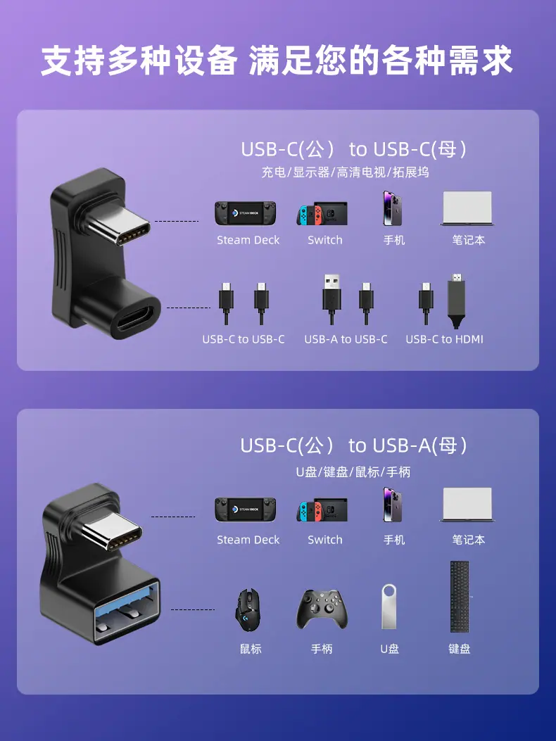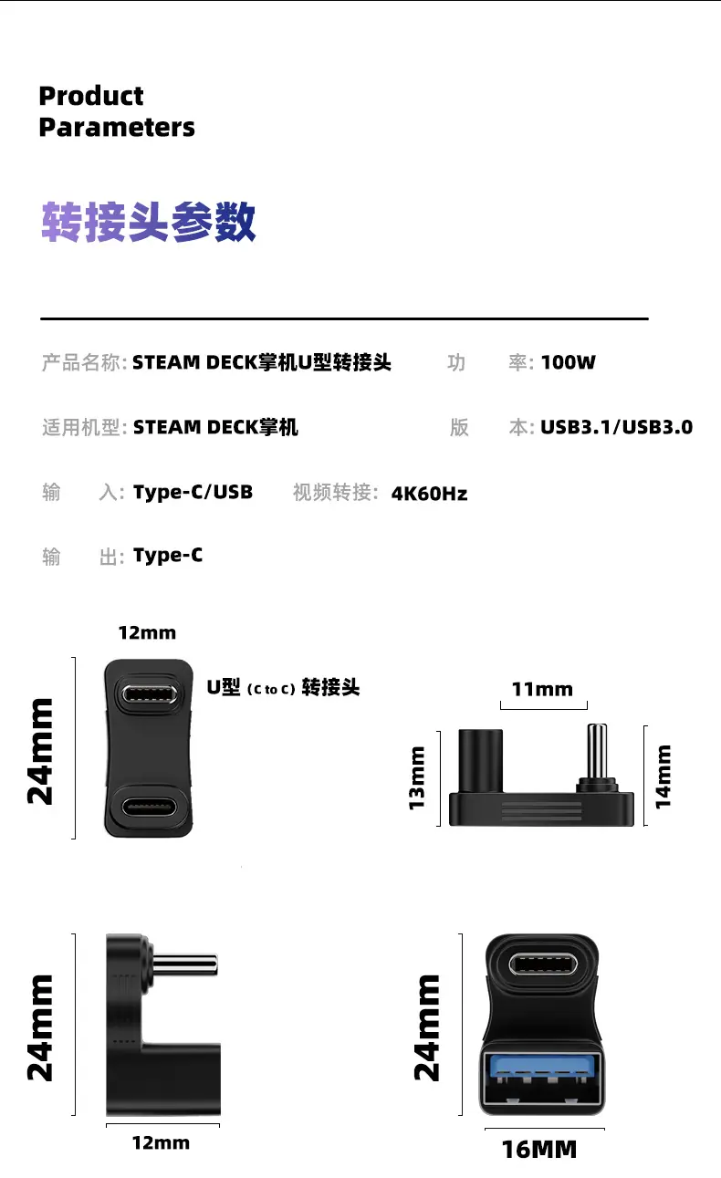 Type-C female to male U-shaped, USB female to Type-C male U-shaped