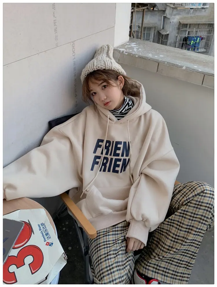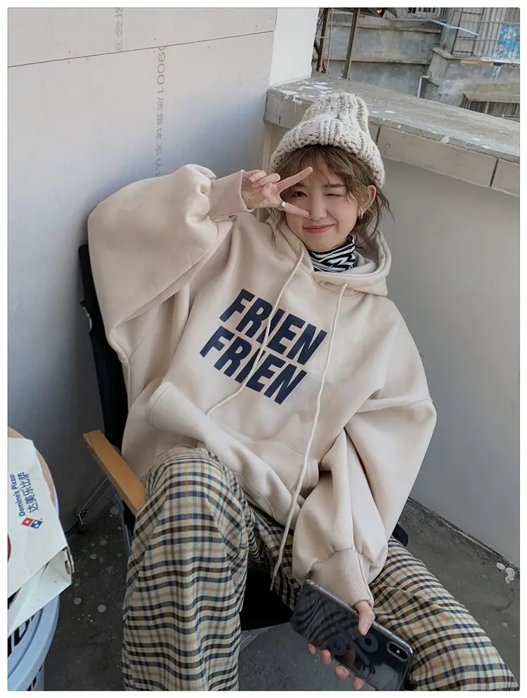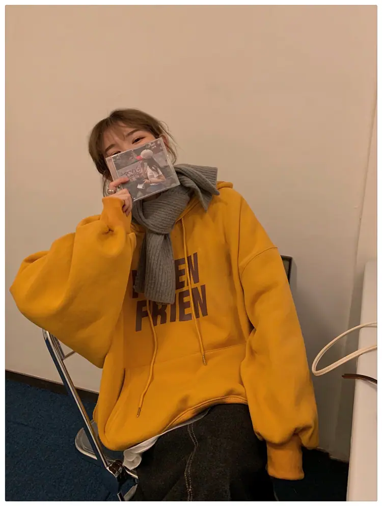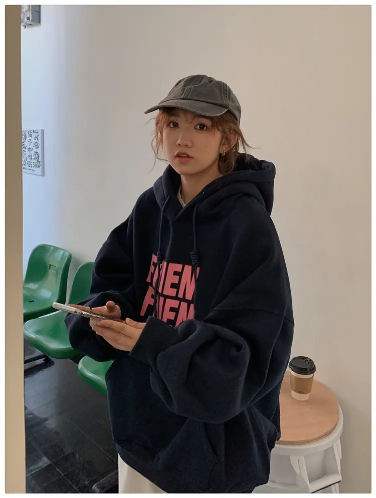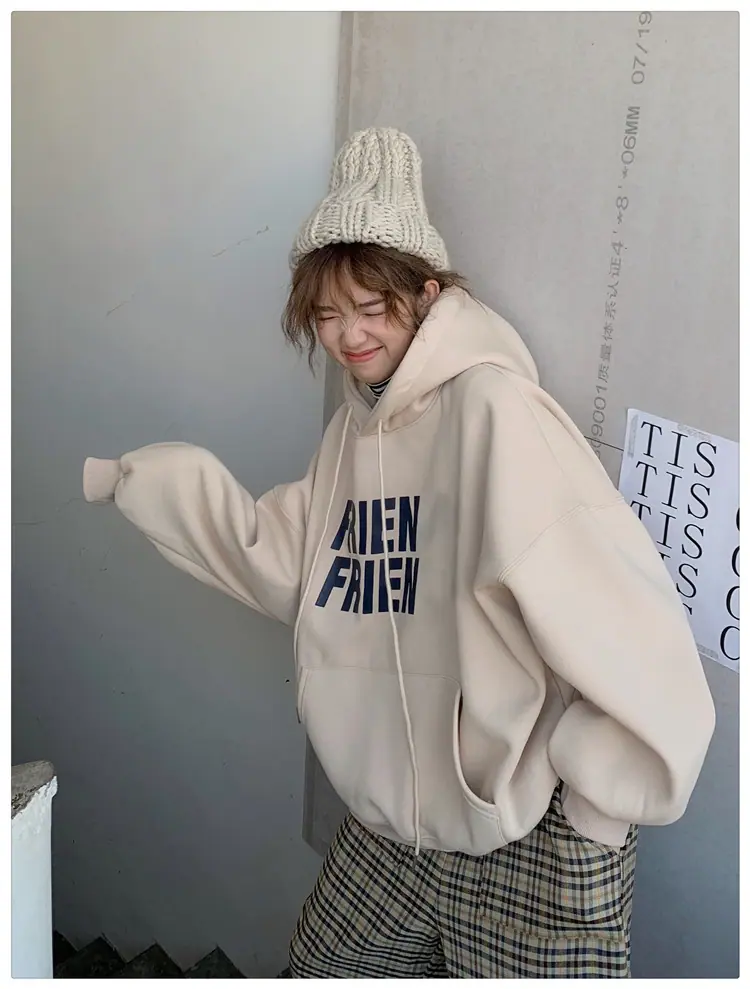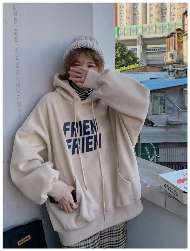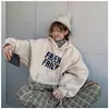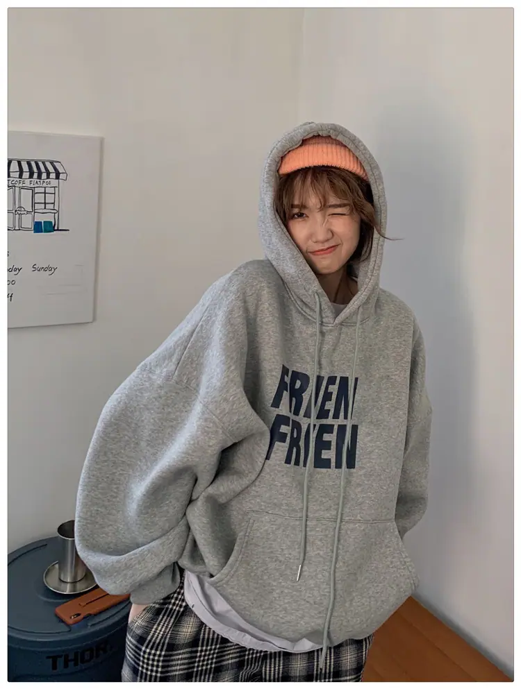 Sudadera de Mujer Gruesa con Forro Polar Nueva Otoño e Invierno Estampado de Alfabeto Japonés y Coreano Estudiante Holgada Talla Extra Jersey Manga Larga con Capucha