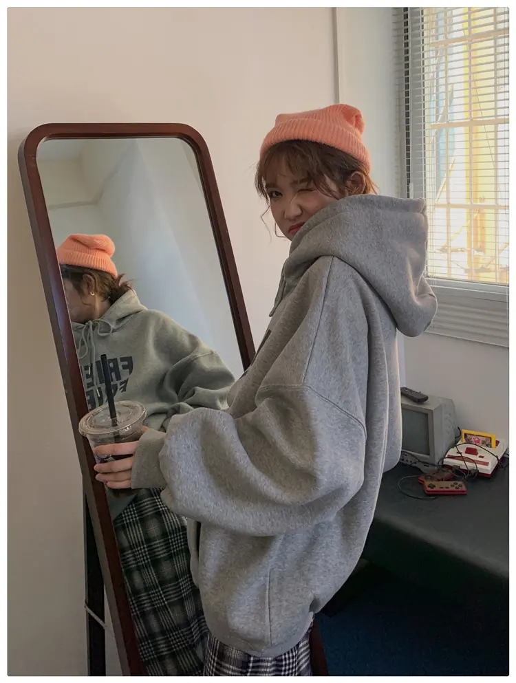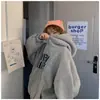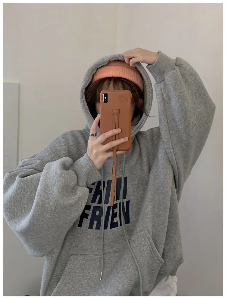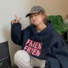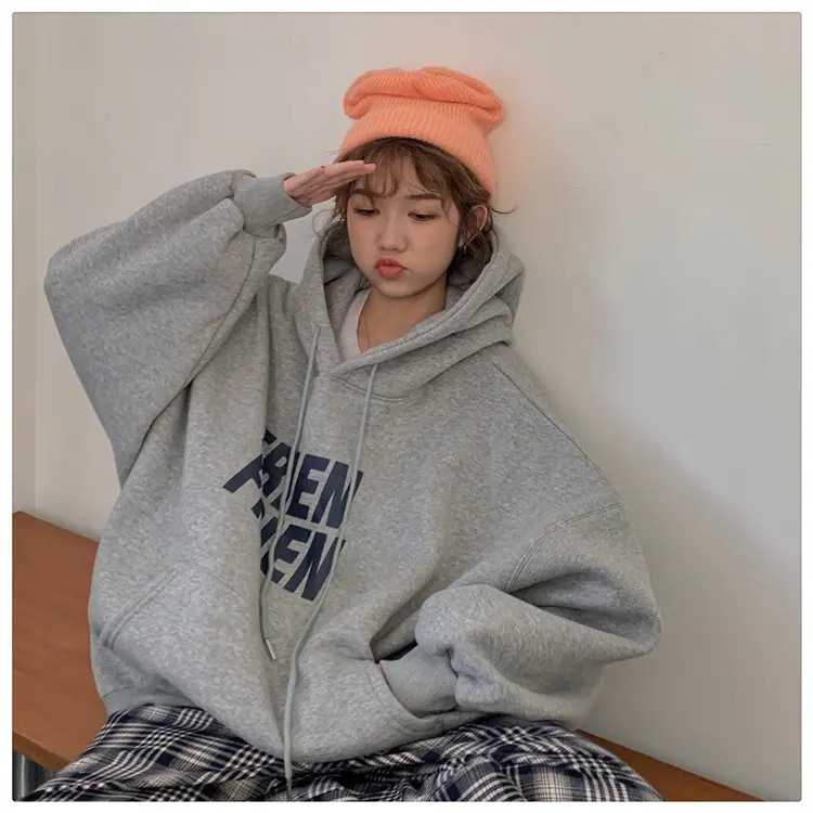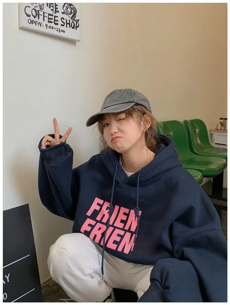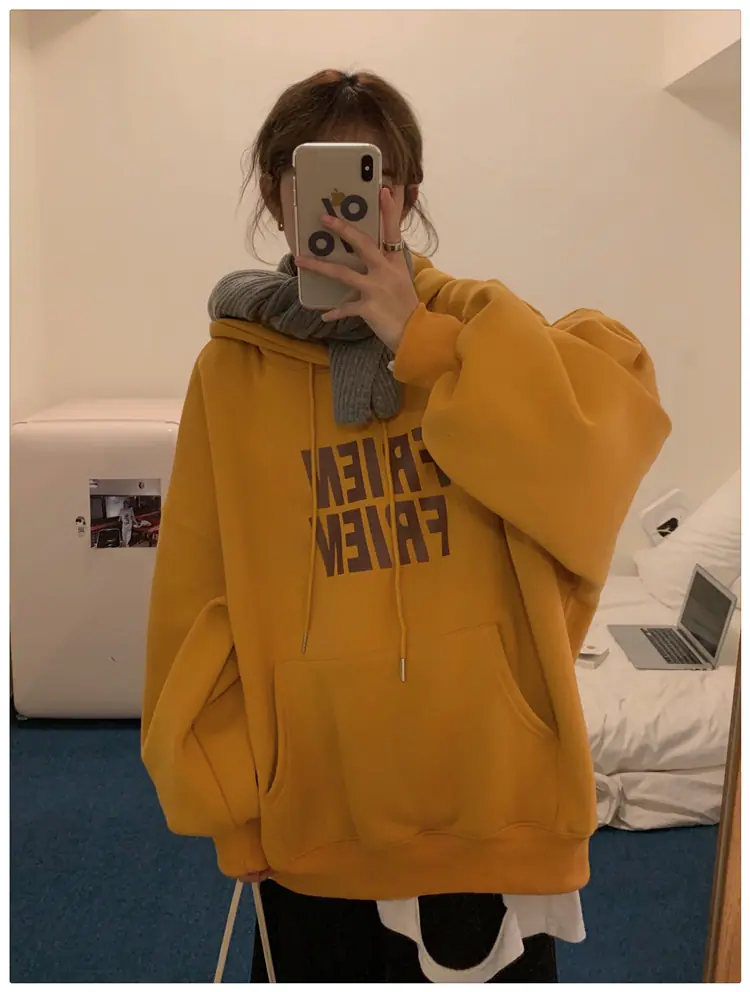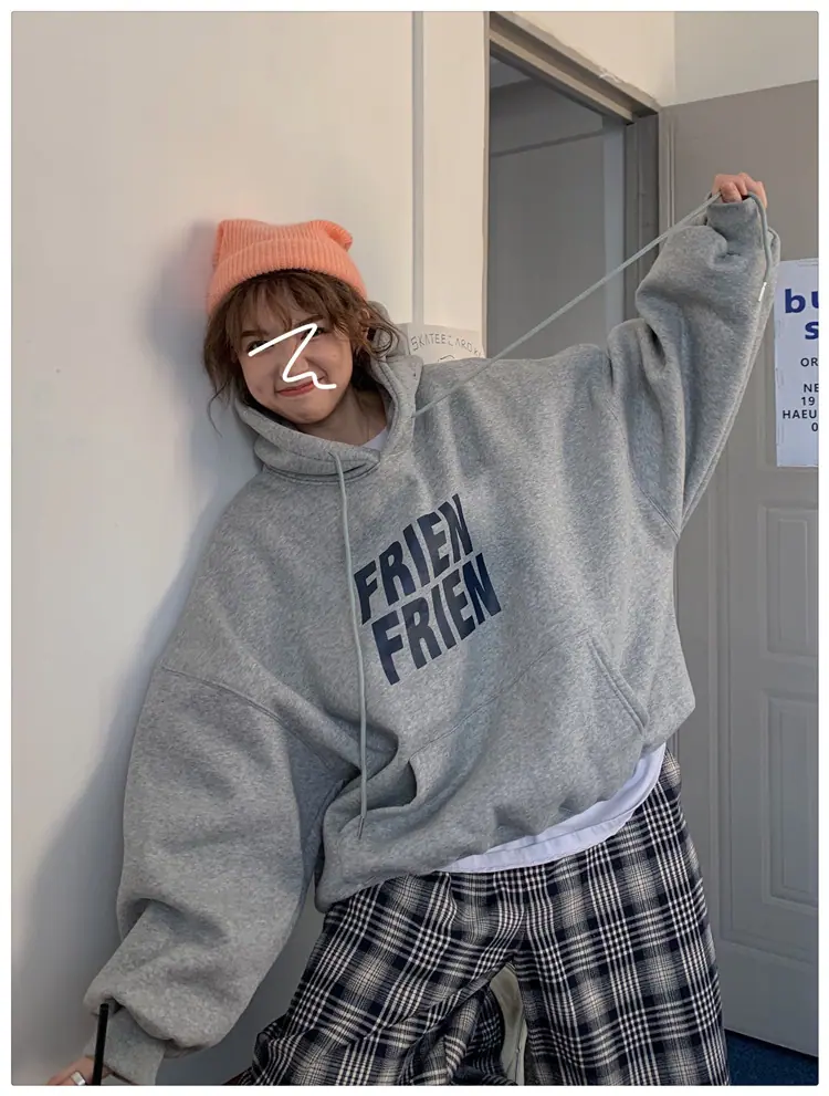 Sudadera de Mujer Gruesa con Forro Polar Nueva Otoño e Invierno Estampado de Alfabeto Japonés y Coreano Estudiante Holgada Talla Extra Jersey Manga Larga con Capucha