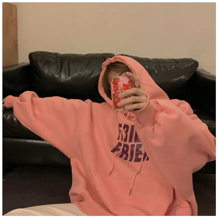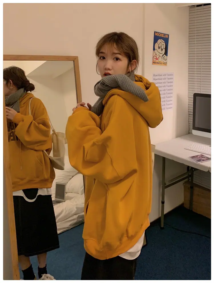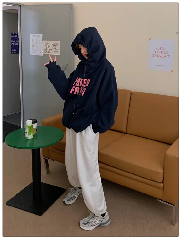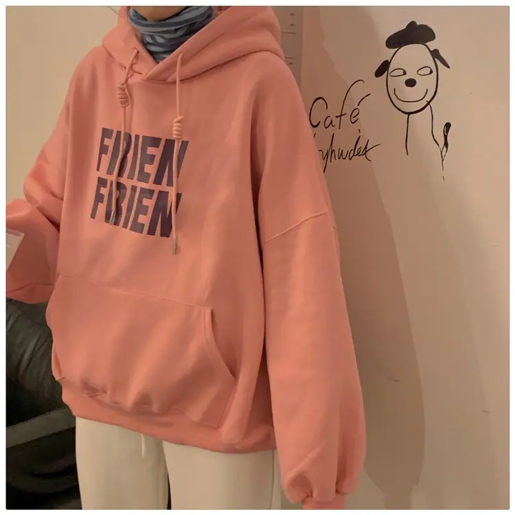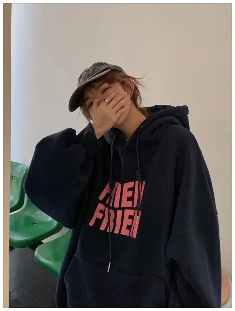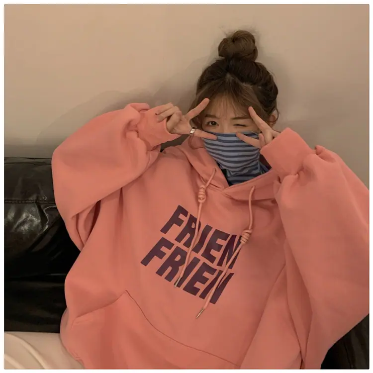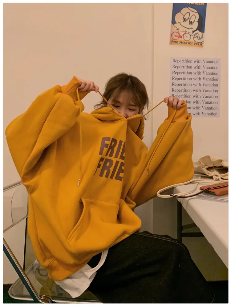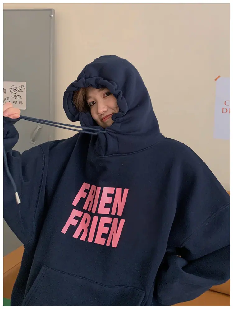 Sudadera de Mujer Gruesa con Forro Polar Nueva Otoño e Invierno Estampado de Alfabeto Japonés y Coreano Estudiante Holgada Talla Extra Jersey Manga Larga con Capucha