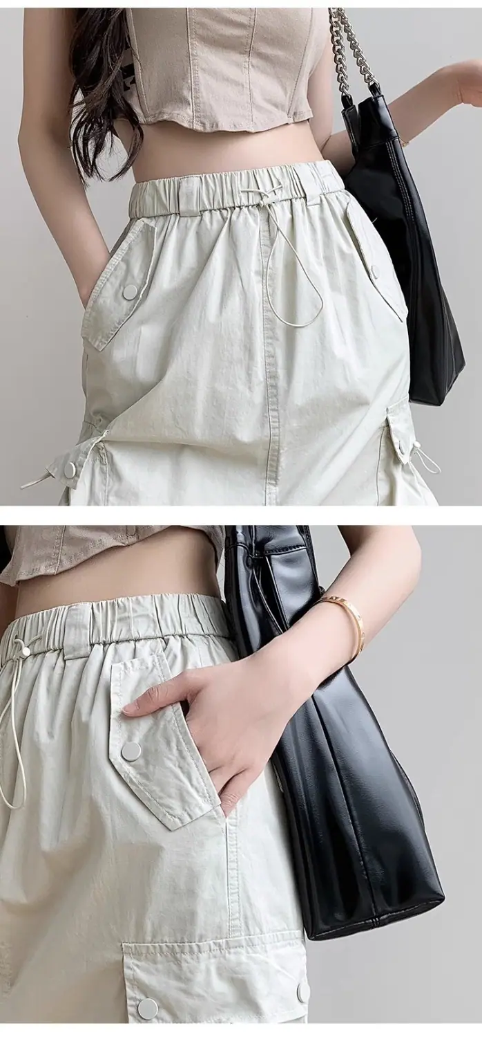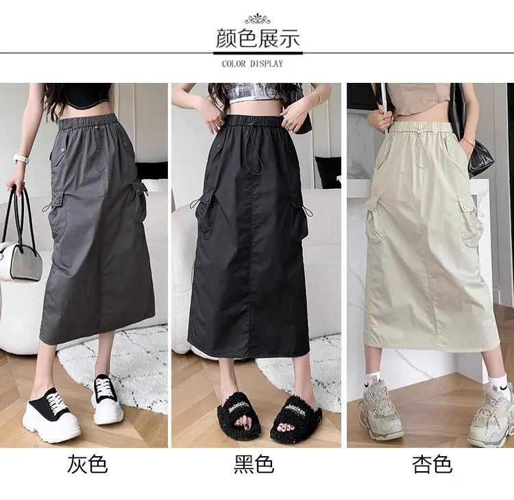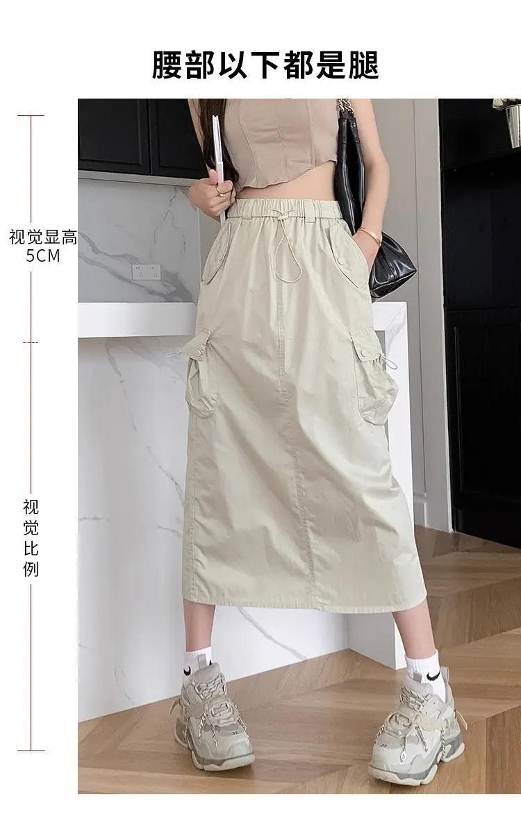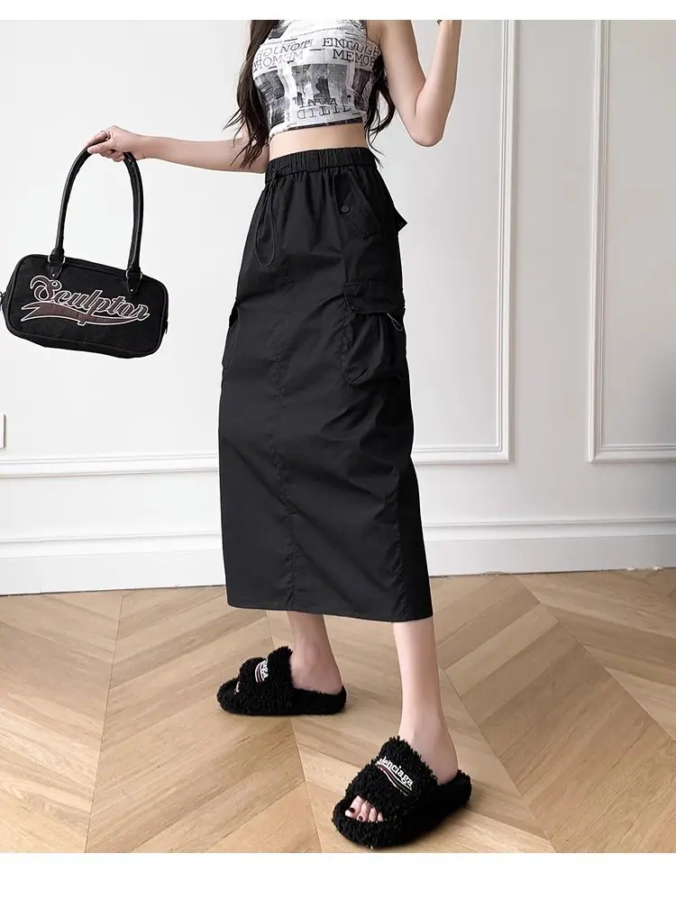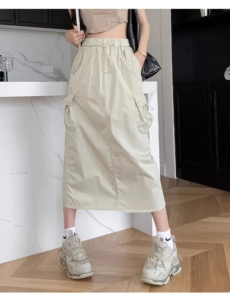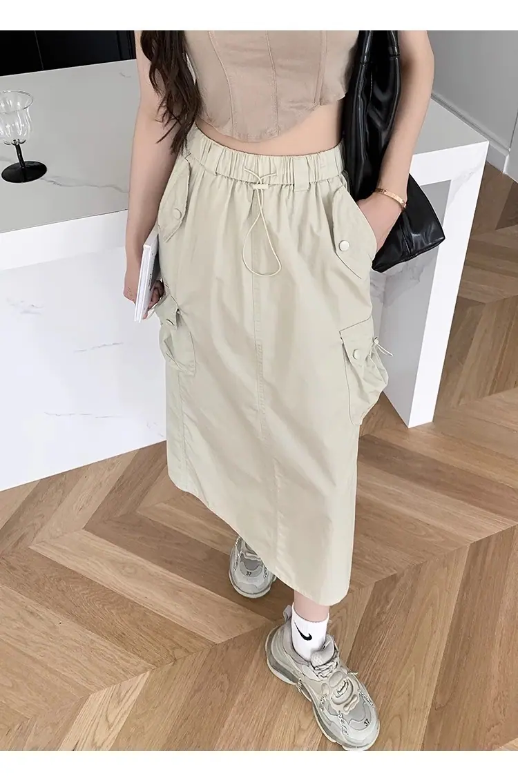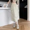 Falda Workwear Americana para Mujer Verano Nueva Cintura Elástica Diseño con Cordón Casual Adelgazante Corte A Falda Midi