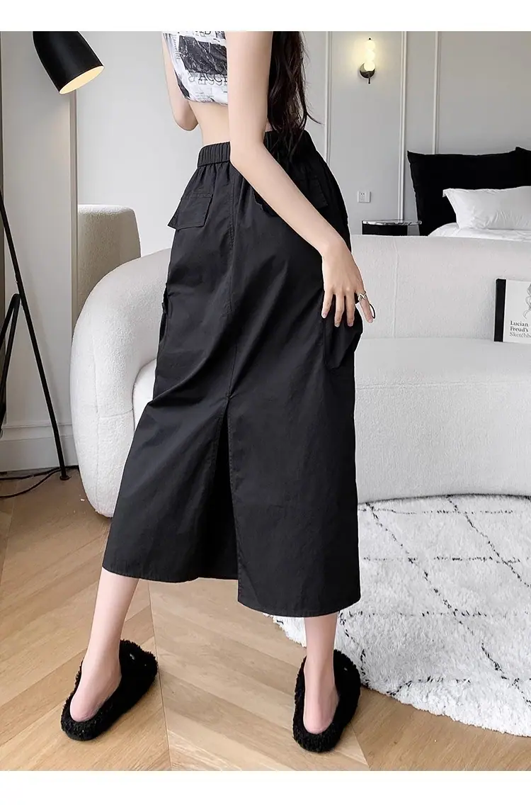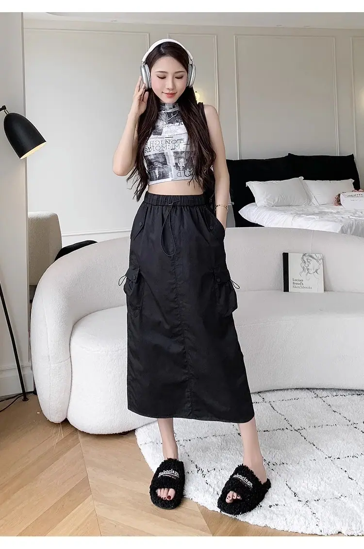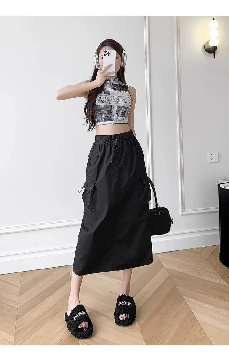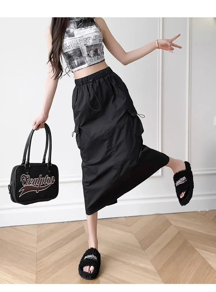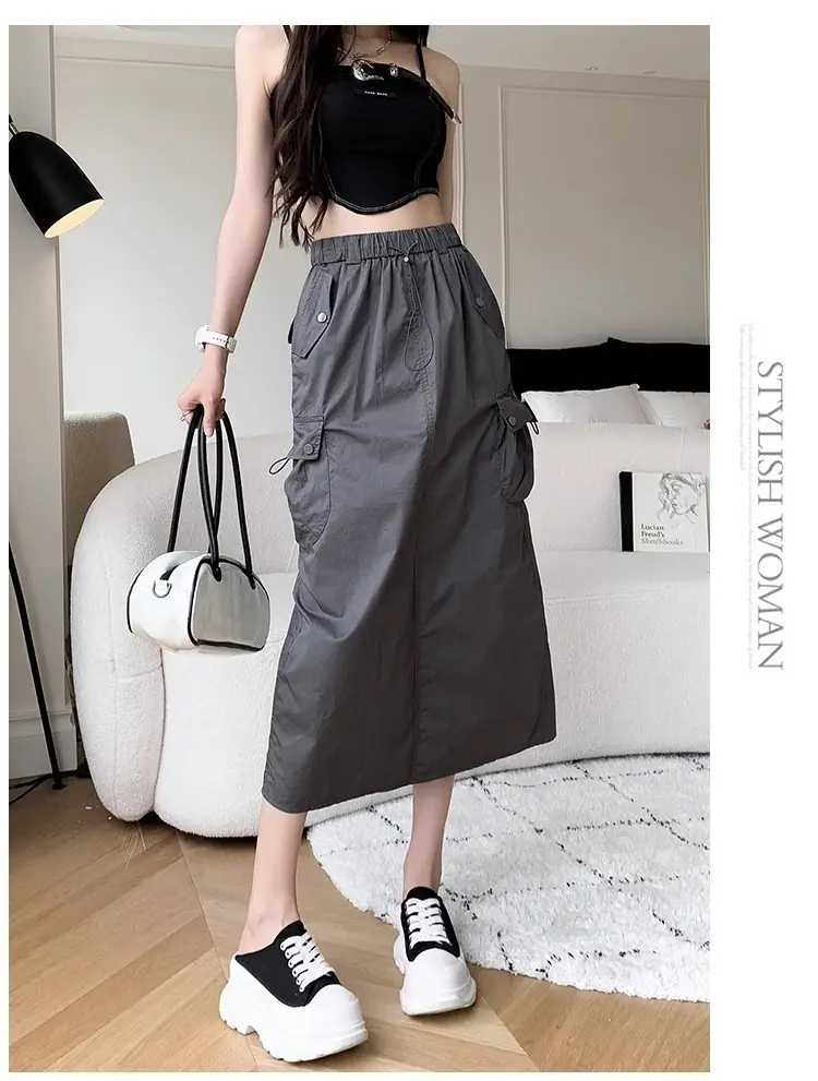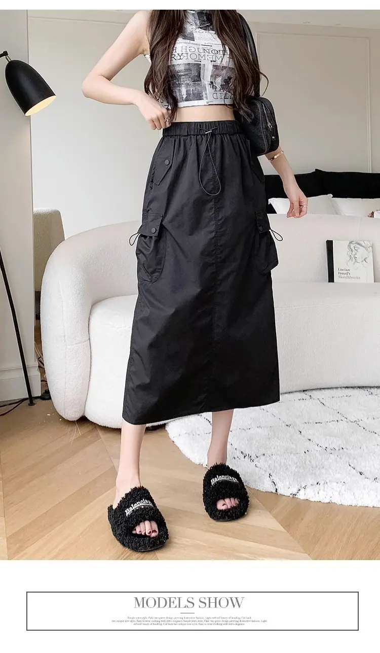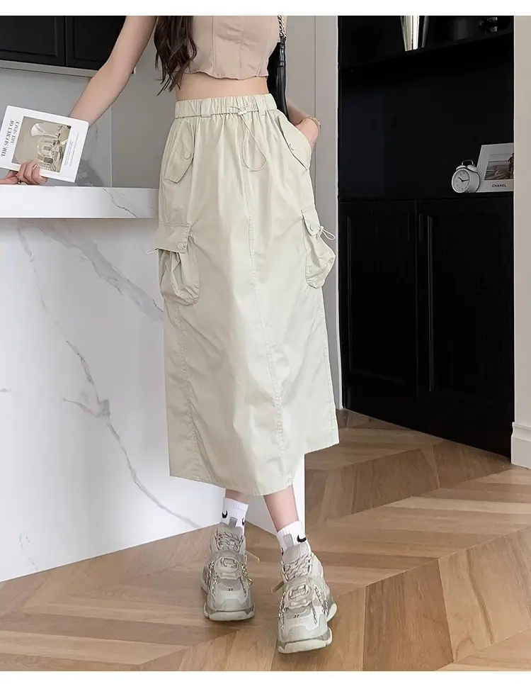 Falda Workwear Americana para Mujer Verano Nueva Cintura Elástica Diseño con Cordón Casual Adelgazante Corte A Falda Midi