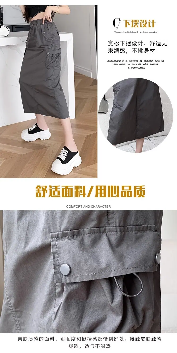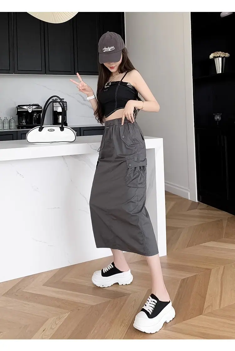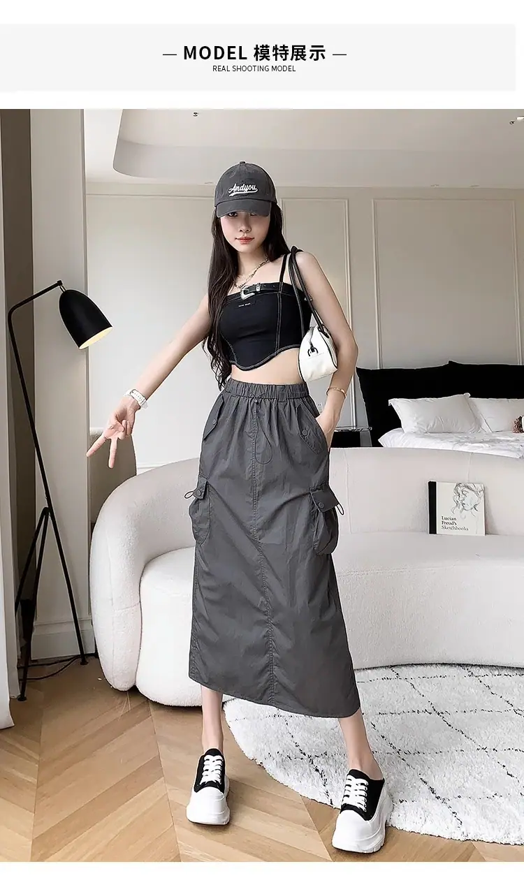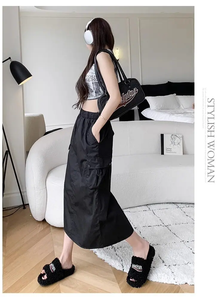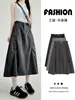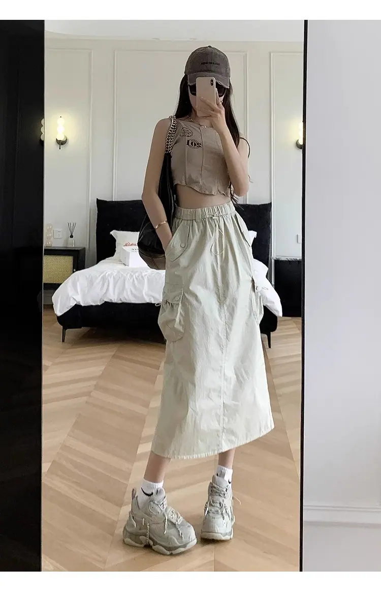 Falda Workwear Americana para Mujer Verano Nueva Cintura Elástica Diseño con Cordón Casual Adelgazante Corte A Falda Midi