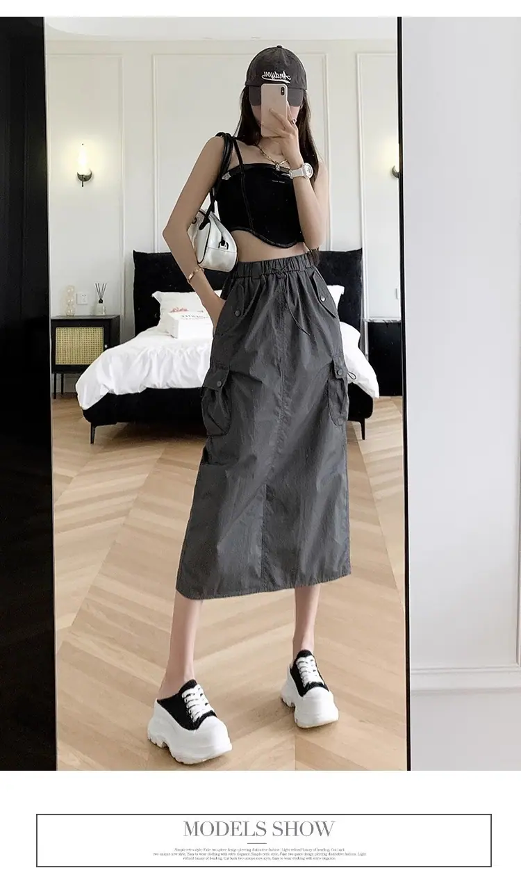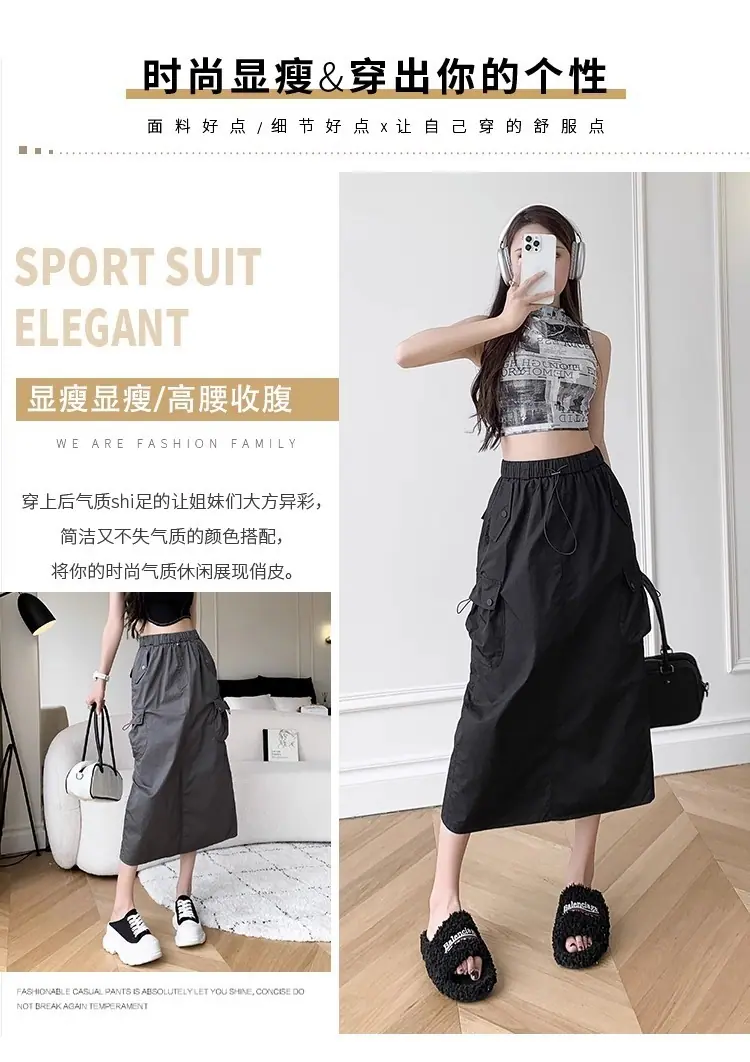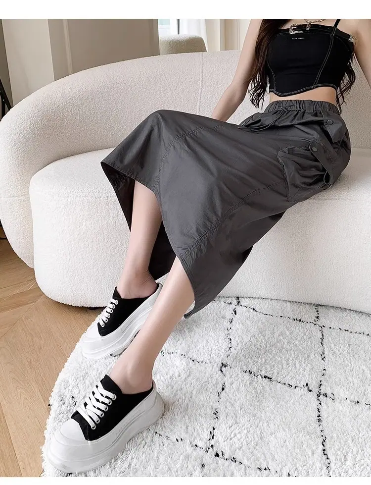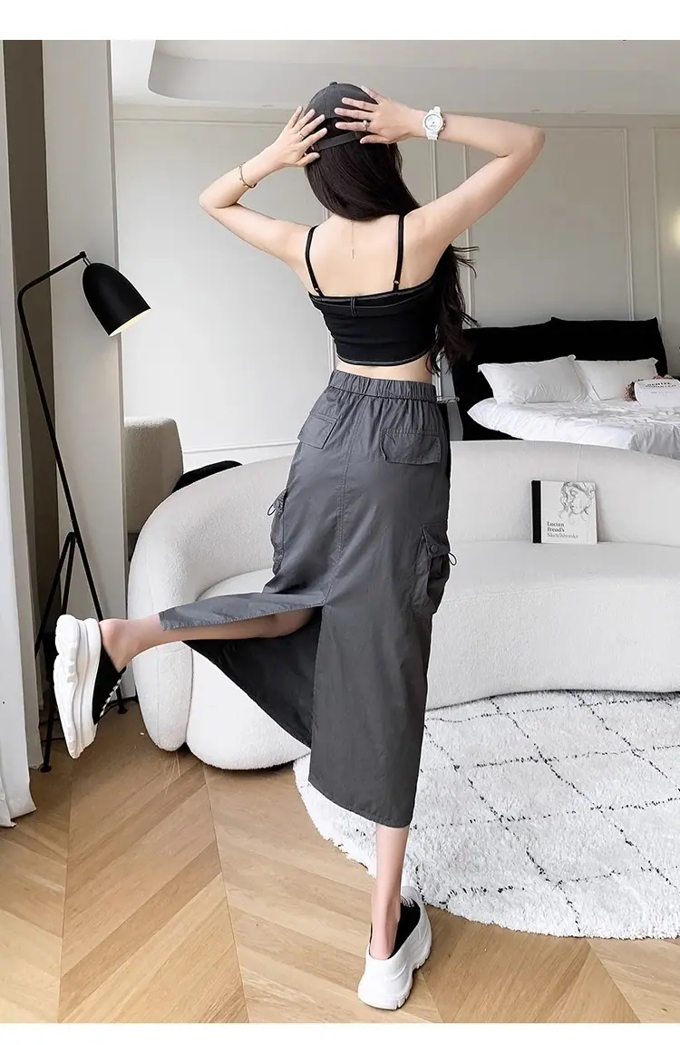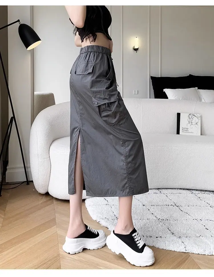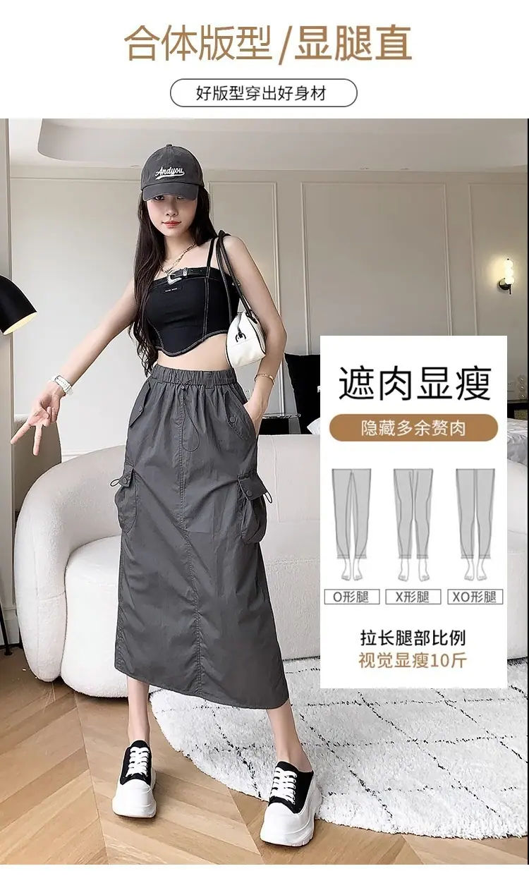 Falda Workwear Americana para Mujer Verano Nueva Cintura Elástica Diseño con Cordón Casual Adelgazante Corte A Falda Midi