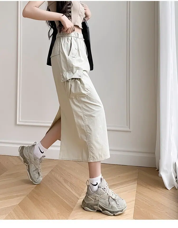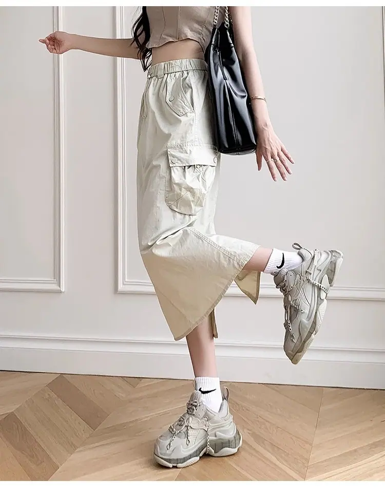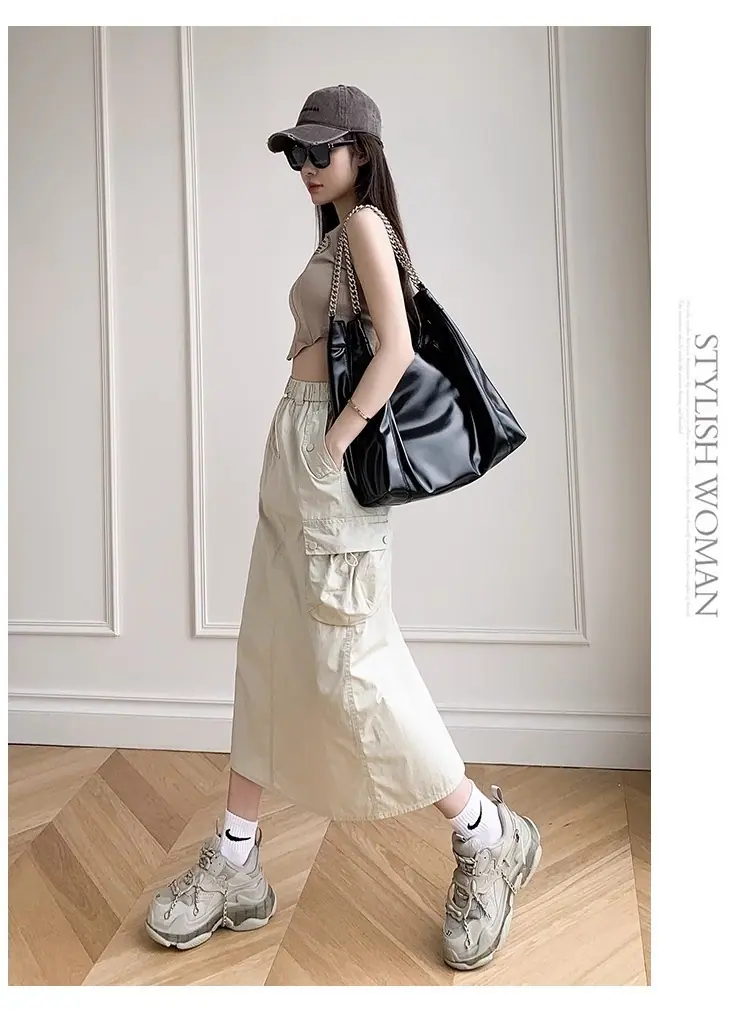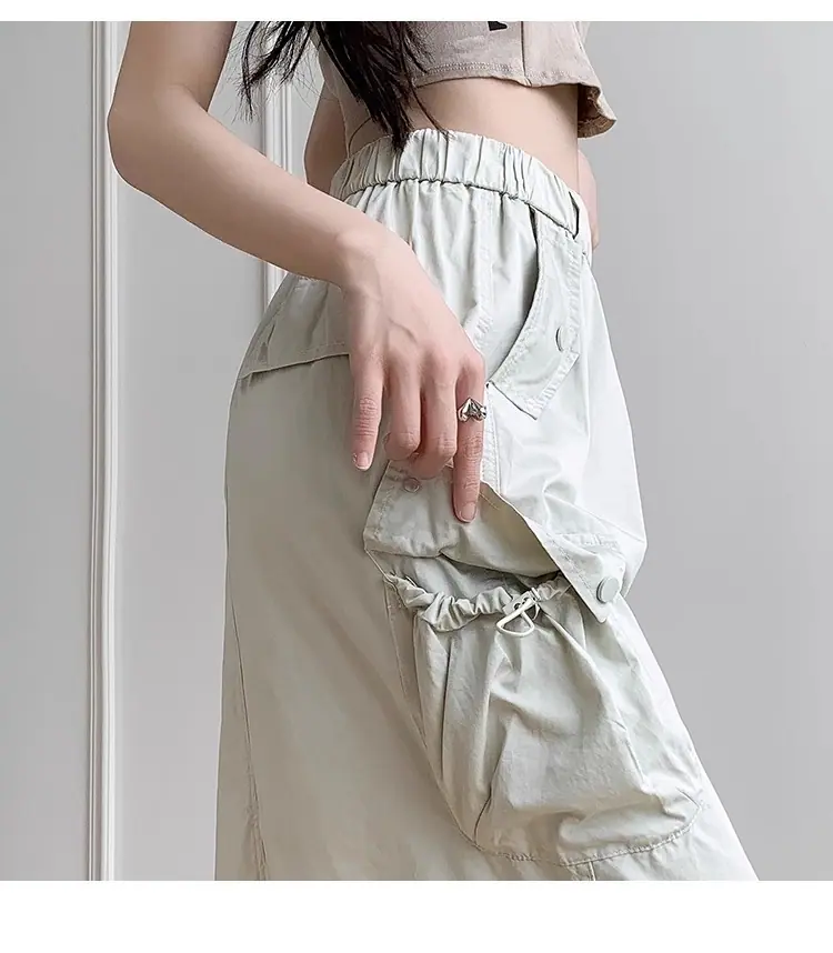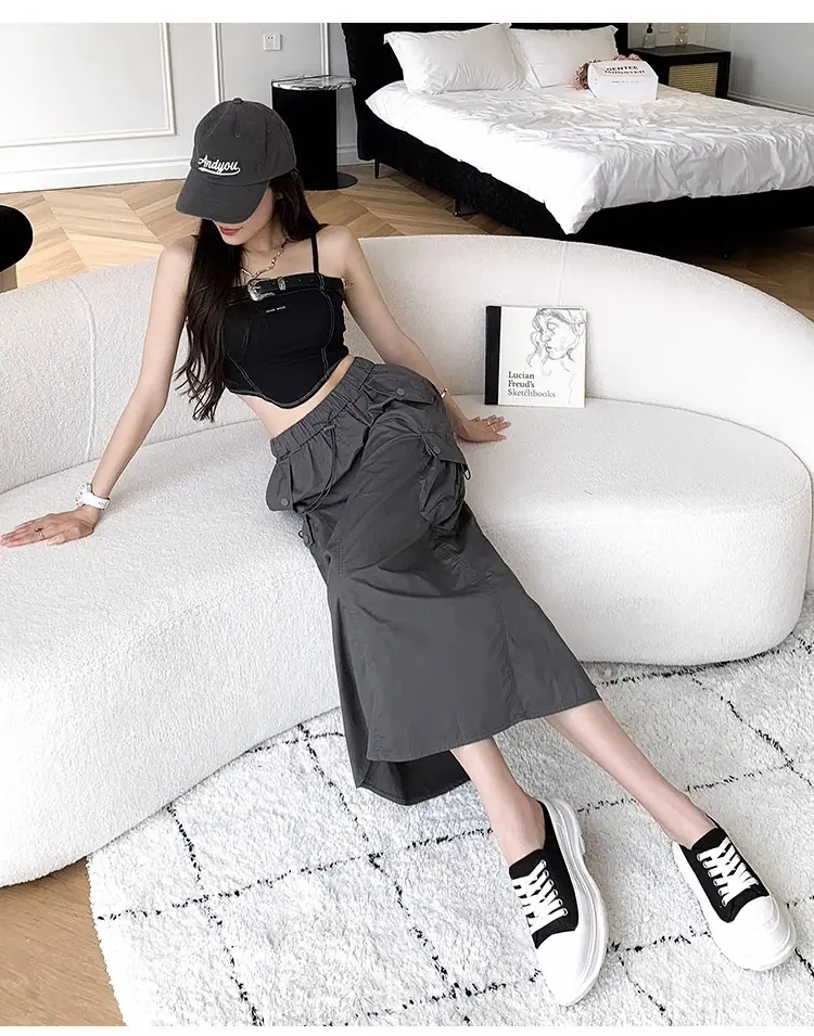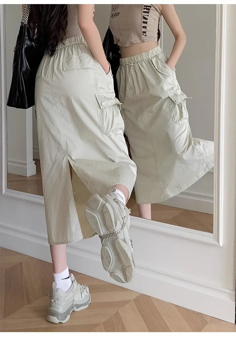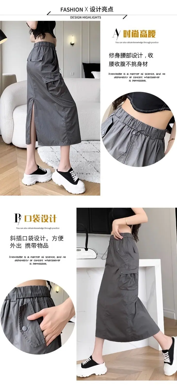 Falda Workwear Americana para Mujer Verano Nueva Cintura Elástica Diseño con Cordón Casual Adelgazante Corte A Falda Midi