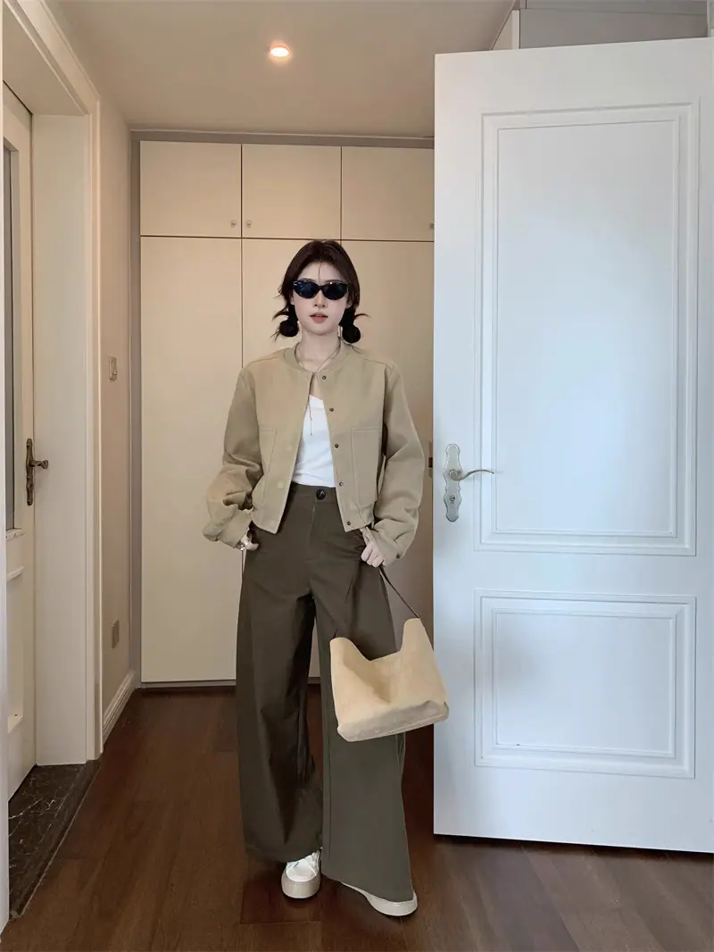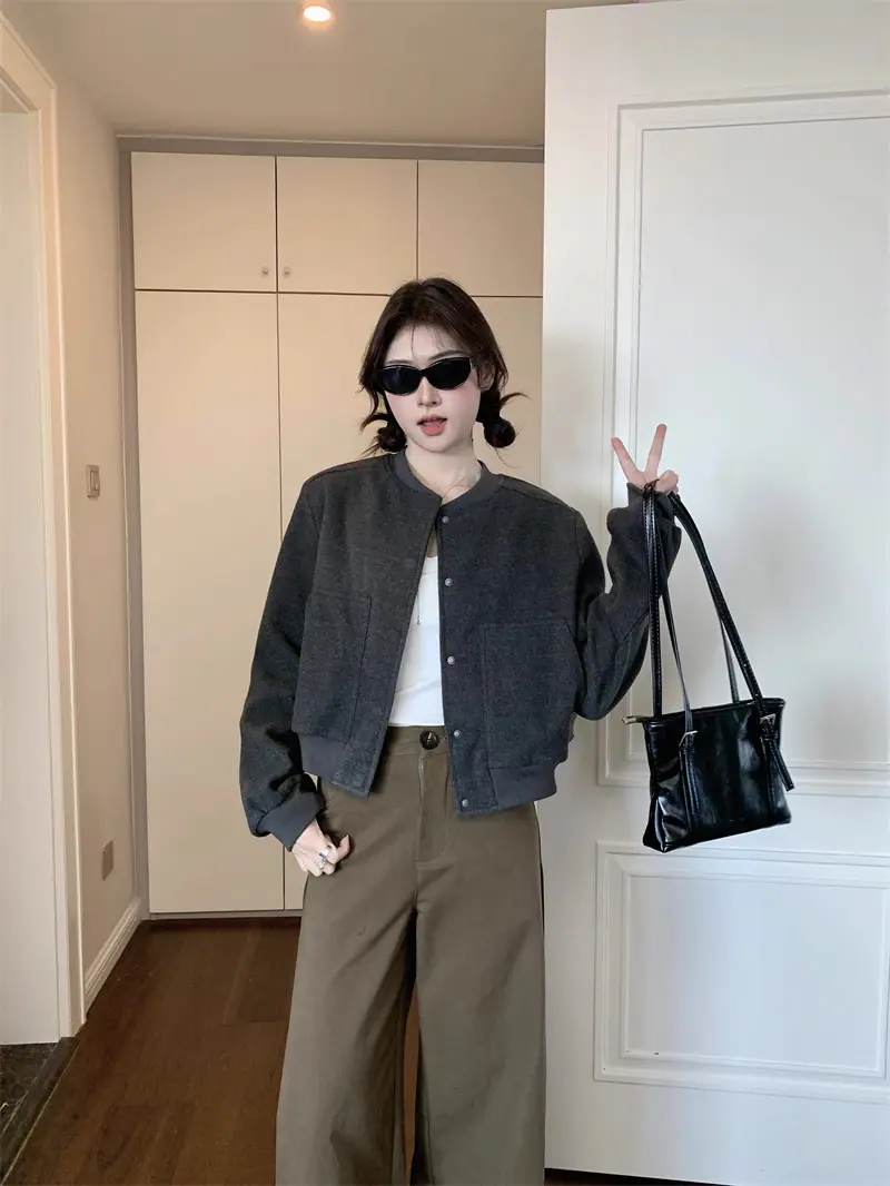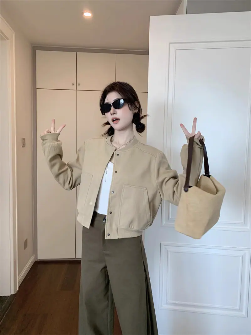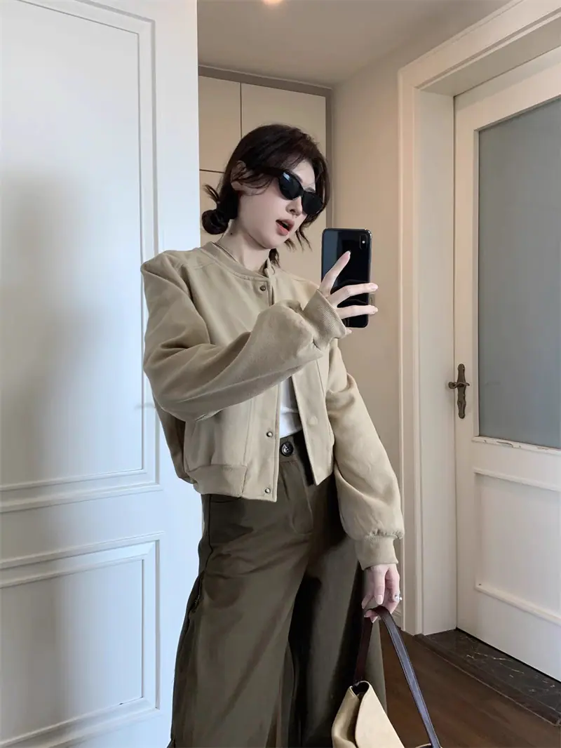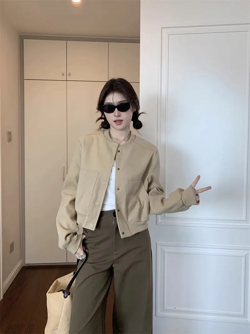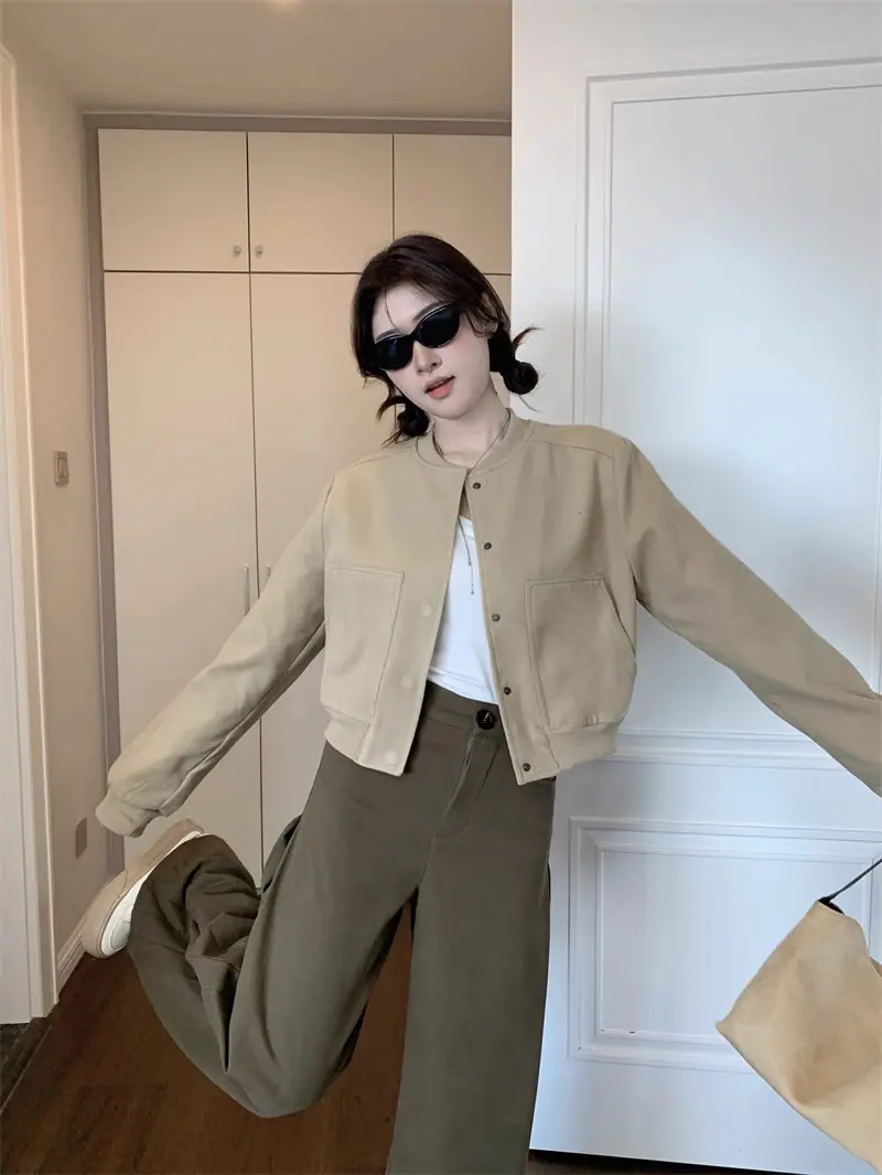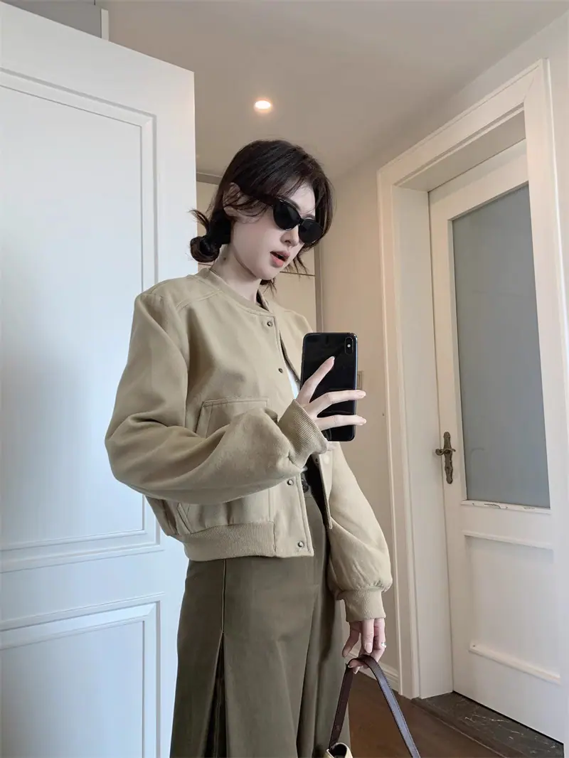 Traje de béisbol caqui de lana abrigo corto para mujer primavera 2025 nuevo estilo pequeño corto de alta gama chaqueta elegante
