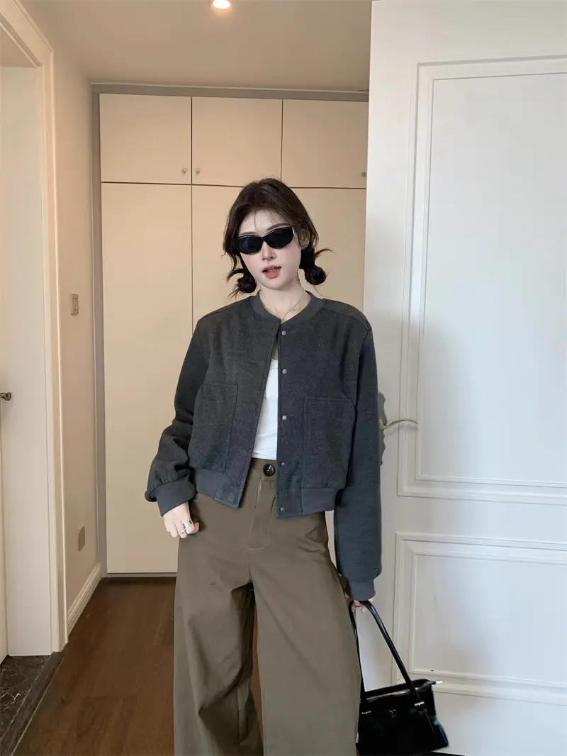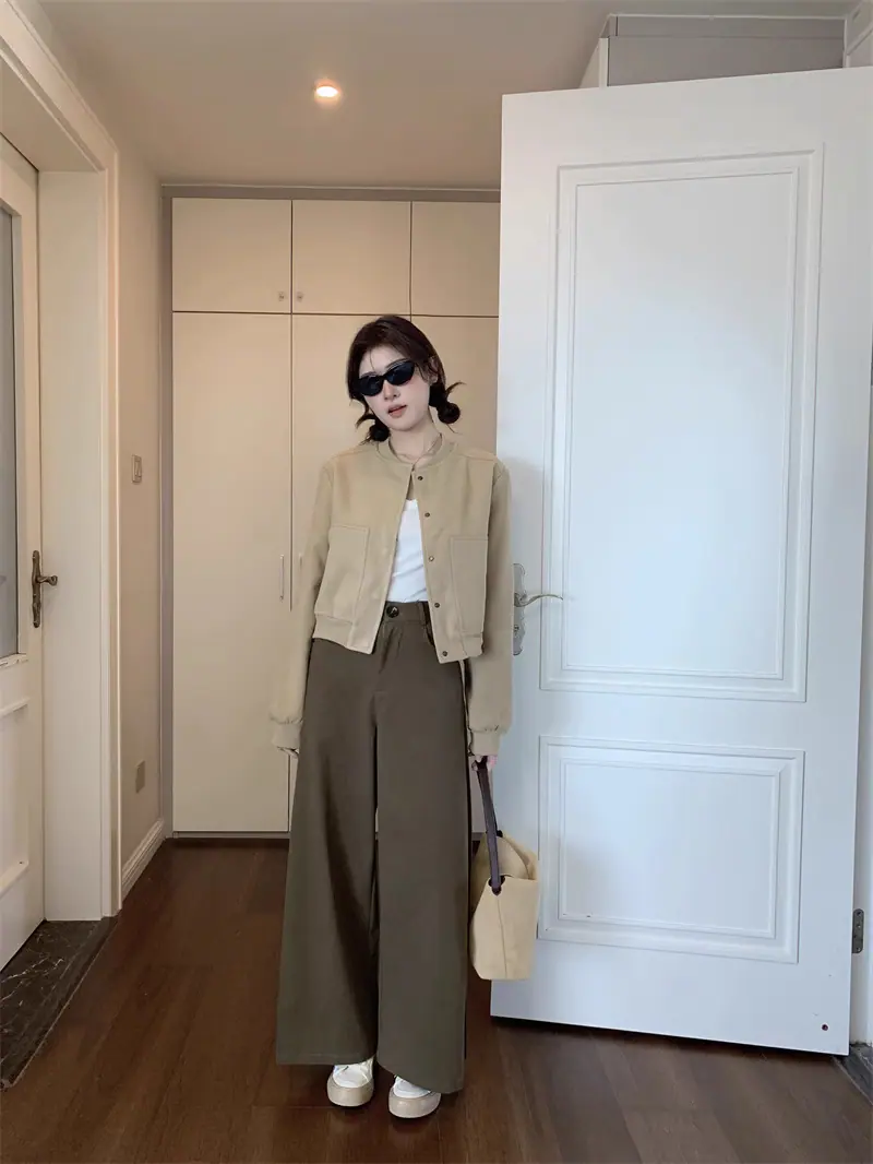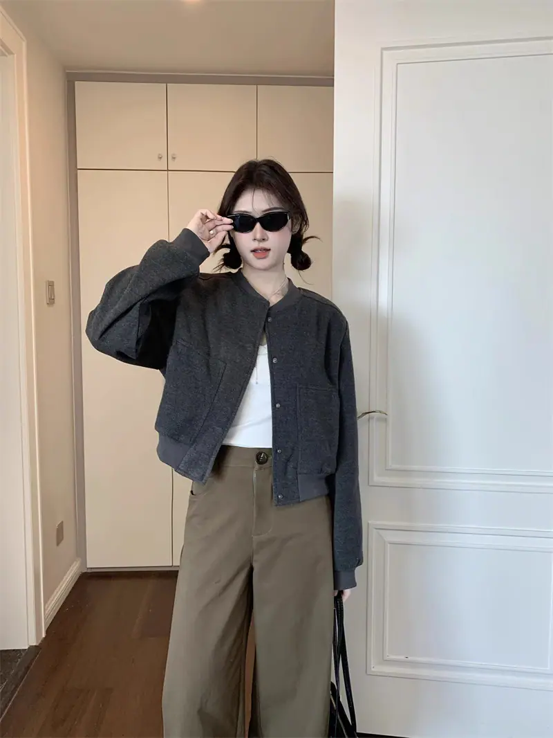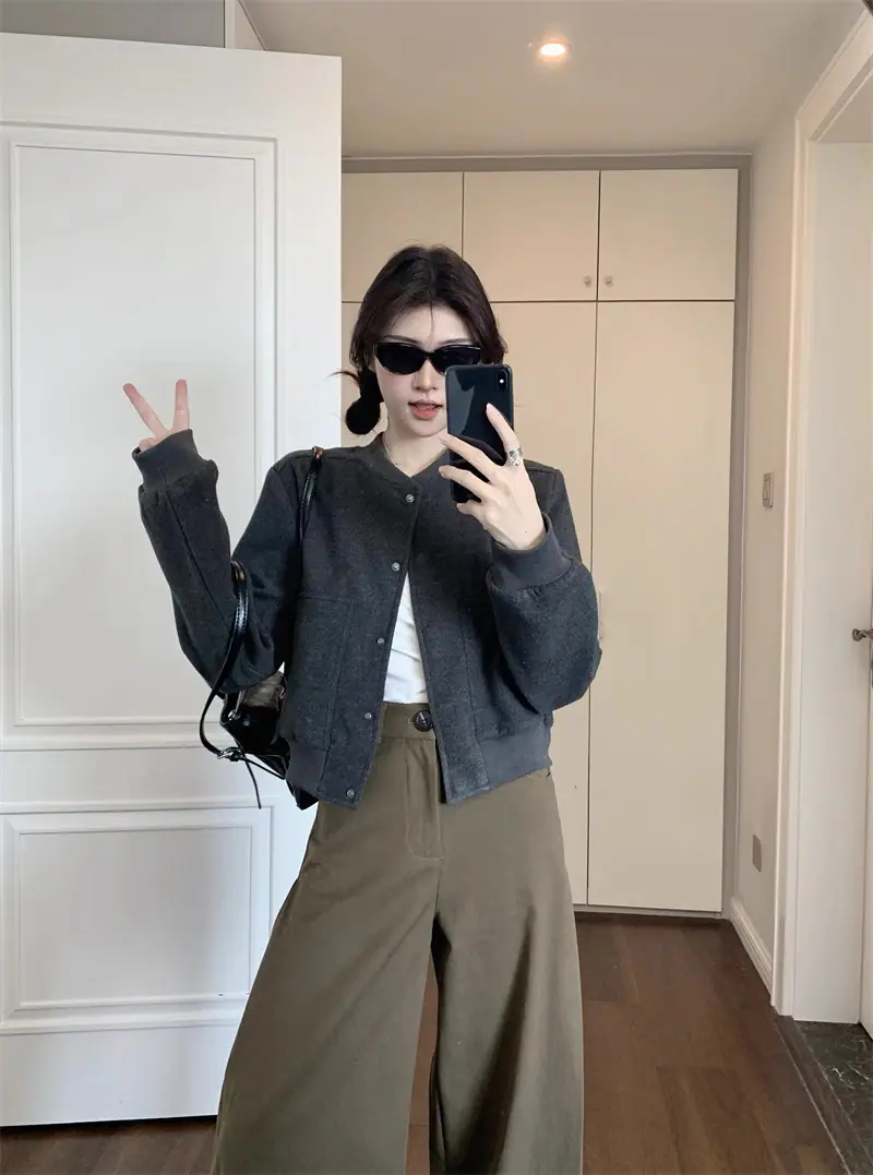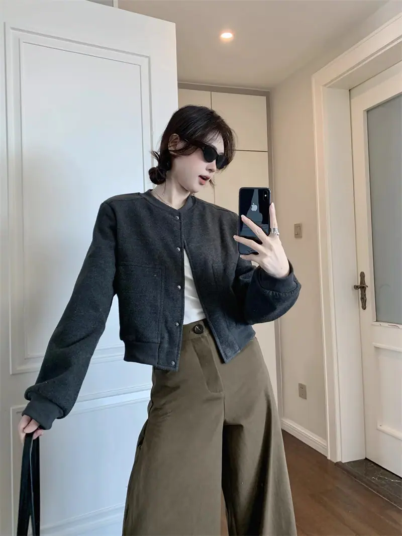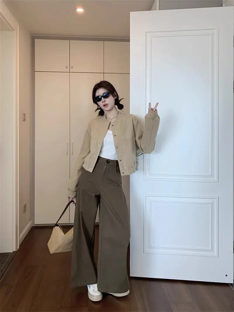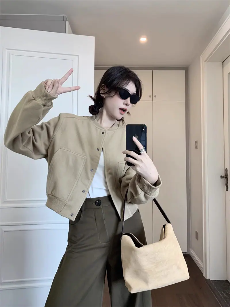 Traje de béisbol caqui de lana abrigo corto para mujer primavera 2025 nuevo estilo pequeño corto de alta gama chaqueta elegante