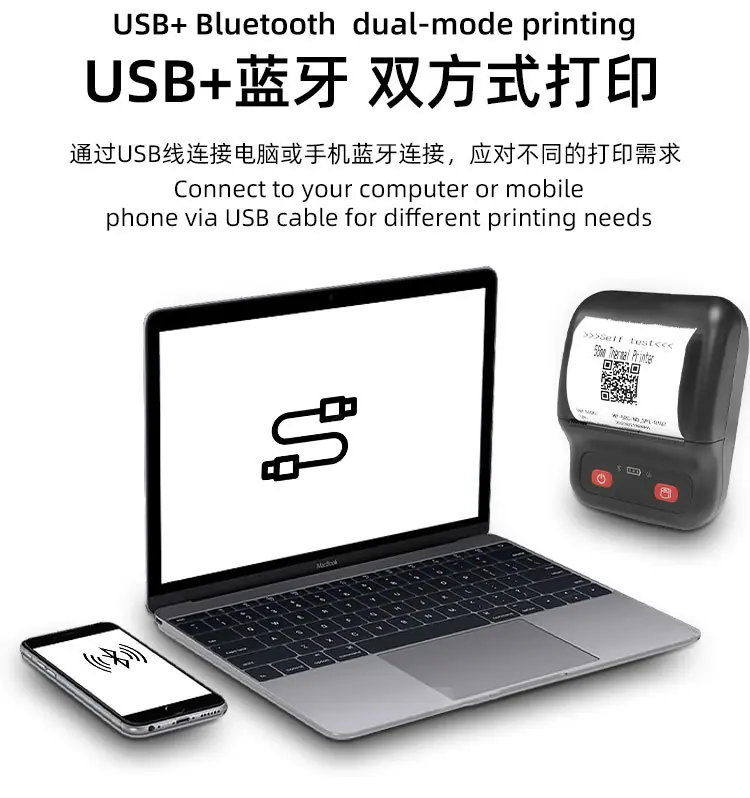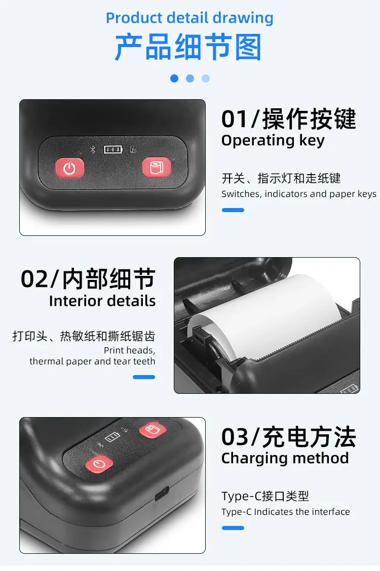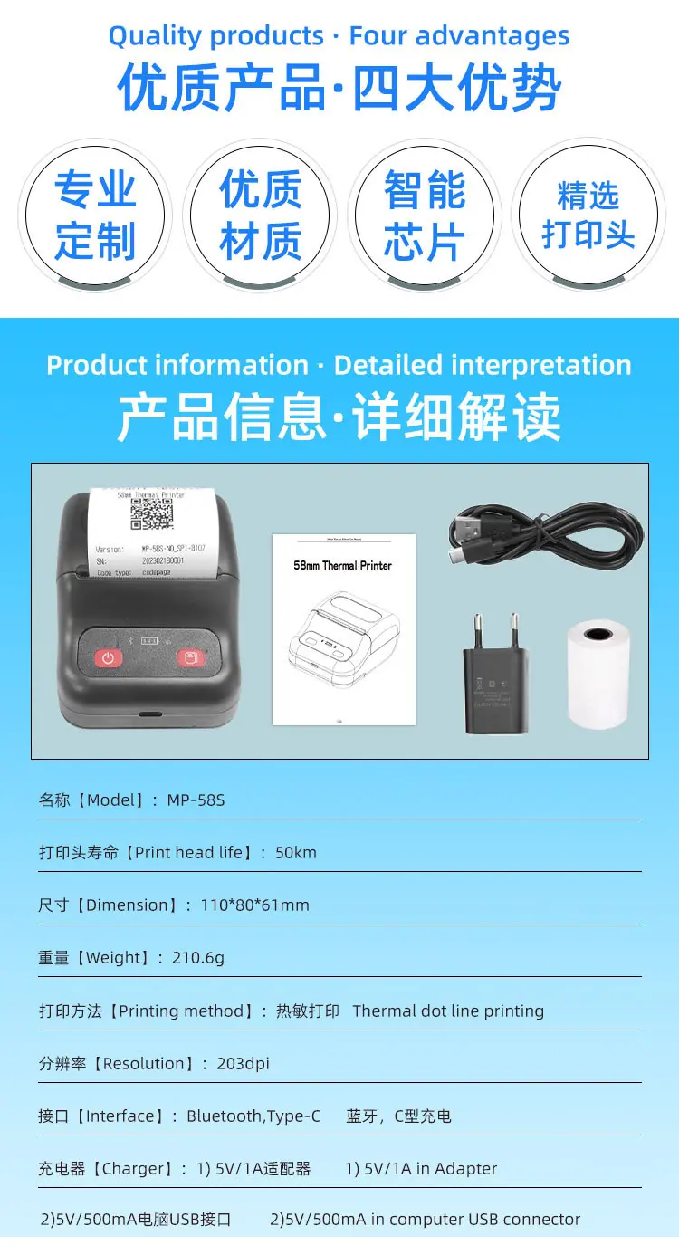 ¡Diga adiós a las impresoras matriciales tradicionales, ahora le proporcionamos impresoras portátiles más eficientes! Esta mini impresora térmica Bluetooth MP-58S combina ligereza, excelente conectividad y larga duración de la batería. La impresión de datos portátil la hace utilizada con éxito en diversos campos. La impresora puede ser alimentada por una batería recargable. El diseño compacto le permite guardarla en su bolso para usarla fácilmente en cualquier momento y lugar.