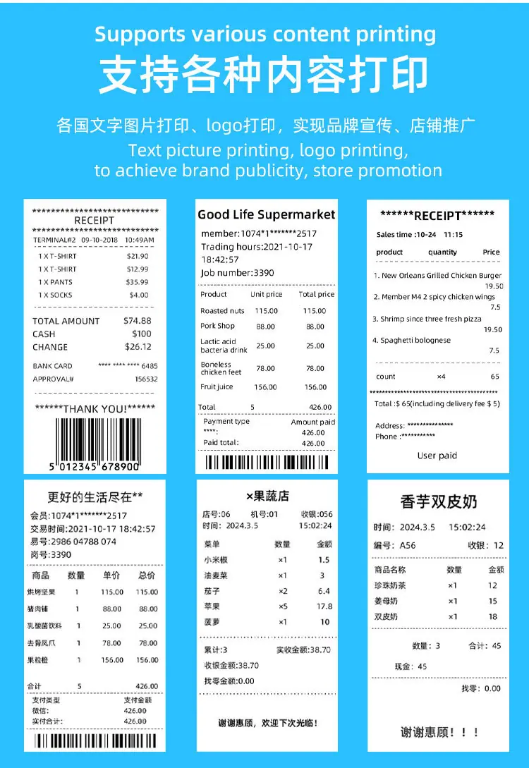 - Impresión de boletos de taxi, impresión de recibos de tarifa de gestión, impresión de recibos, impresión de información de pedidos de restaurantes, etc. Pequeño y ligero, fácil de llevar al trabajo.