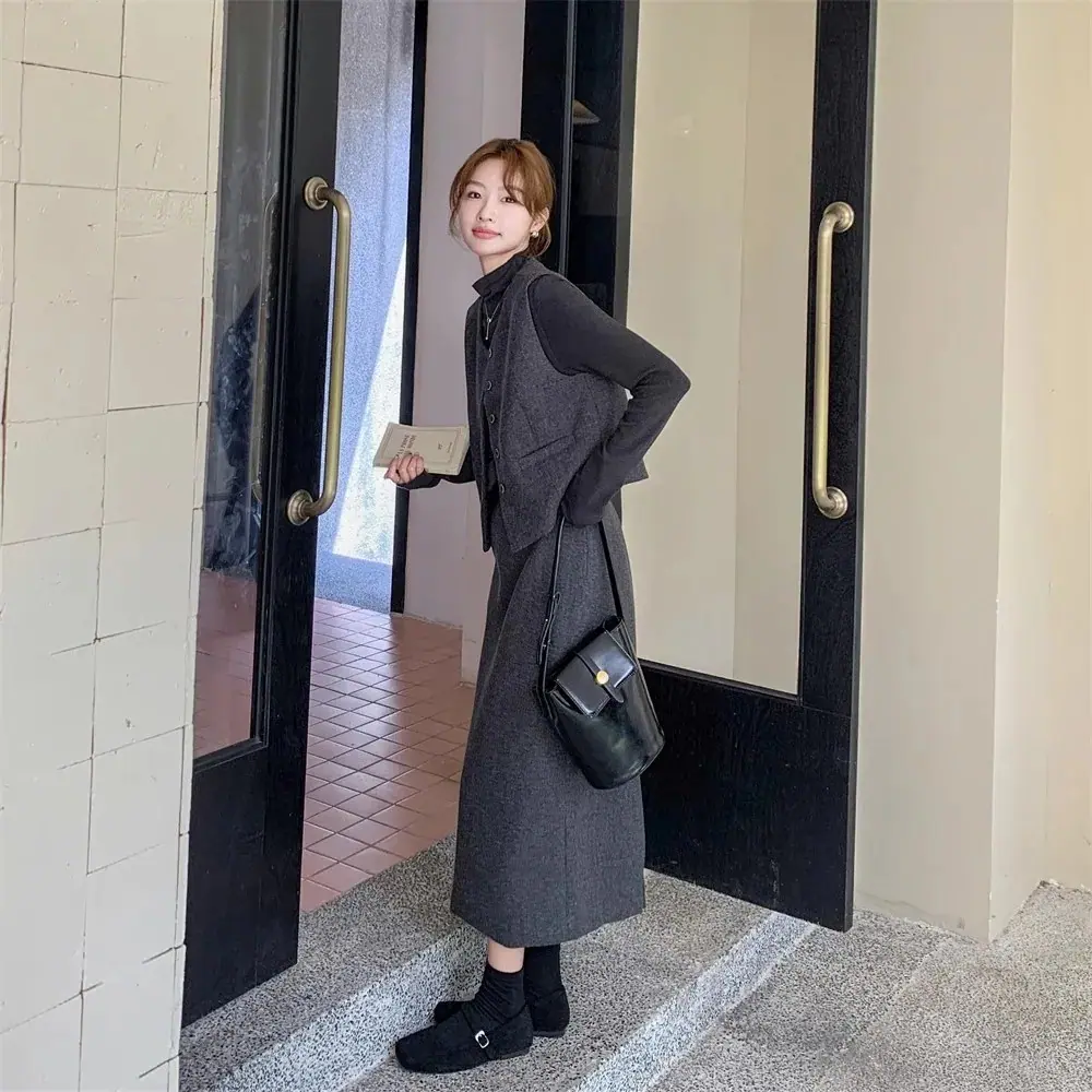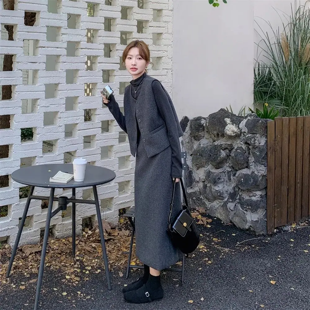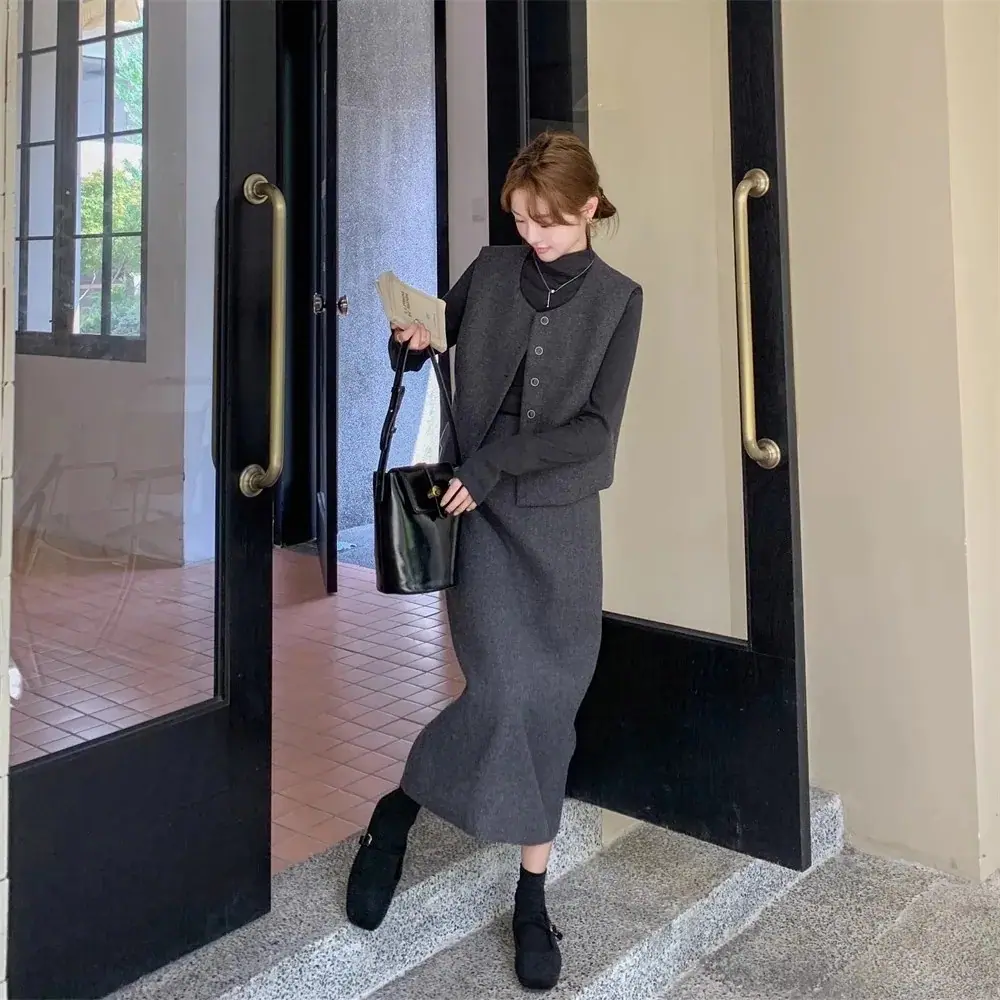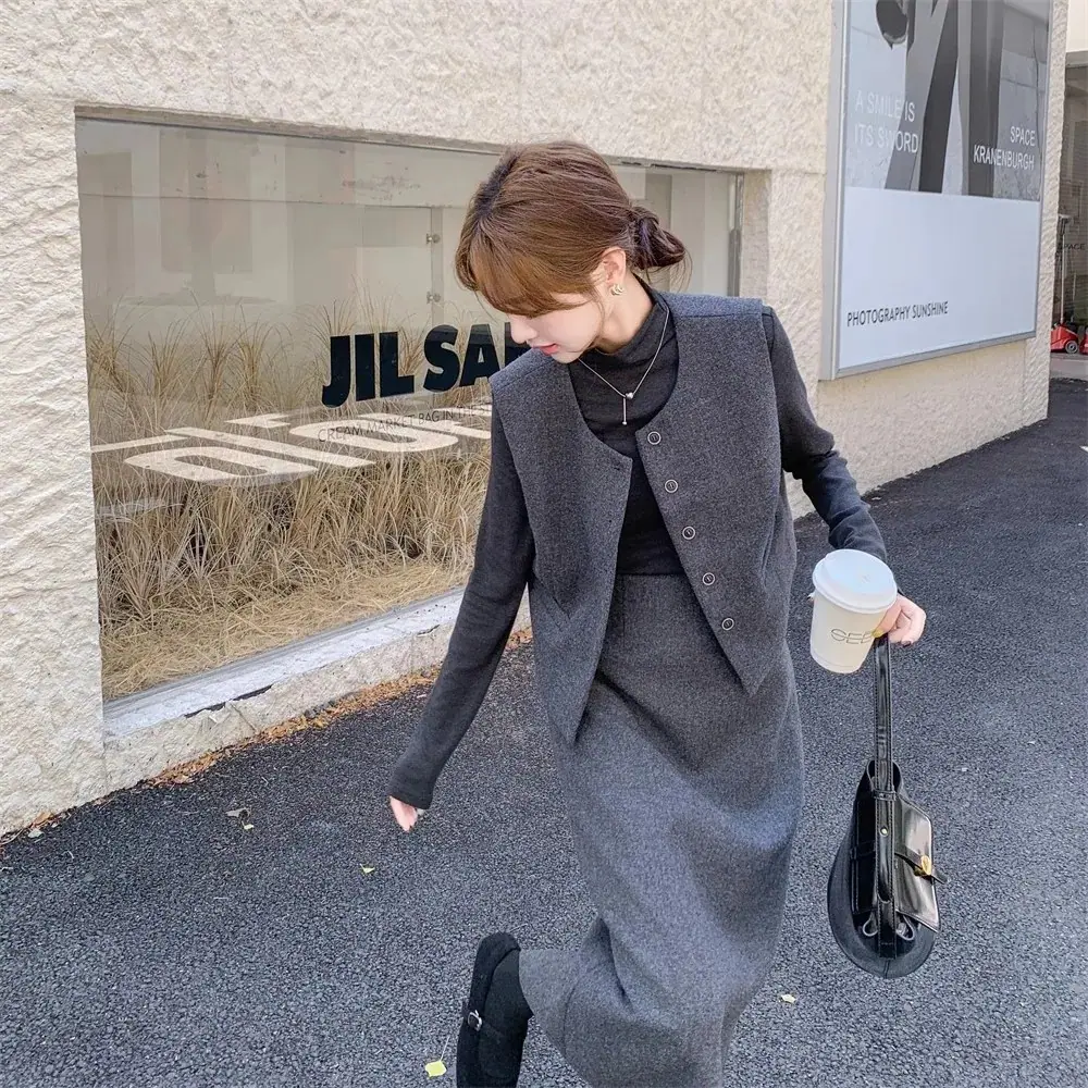 Vestido Chaleco Fino de Moda Gris para Mujer Otoño Estilo Chanel Set de Tres Piezas Abrigo Coreano Explosivo de Alta Gama