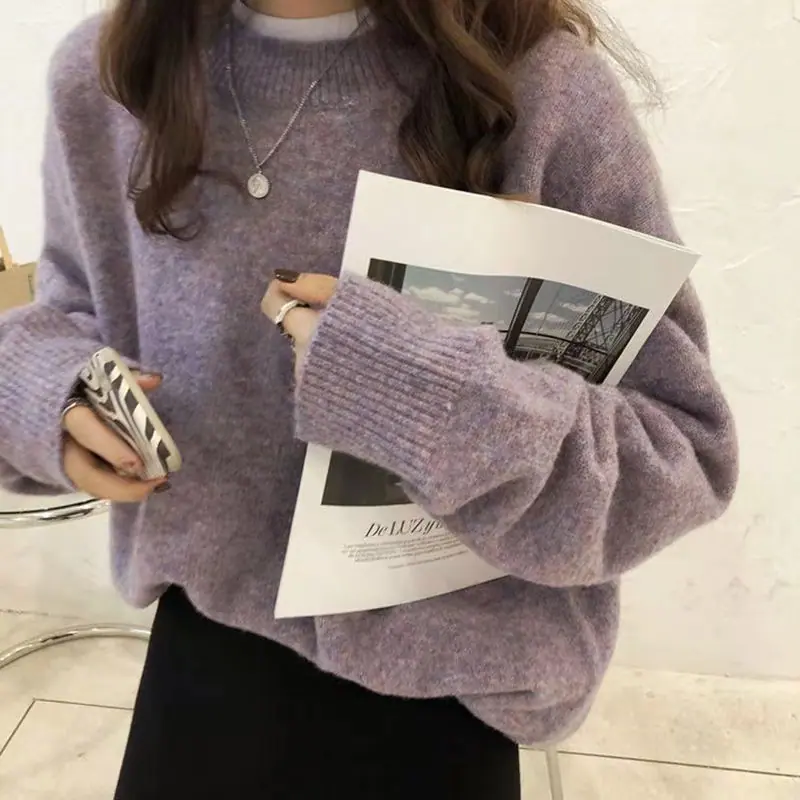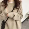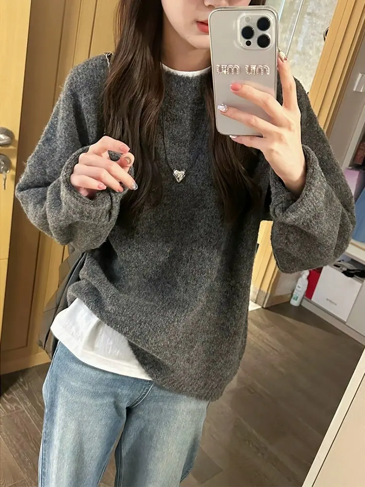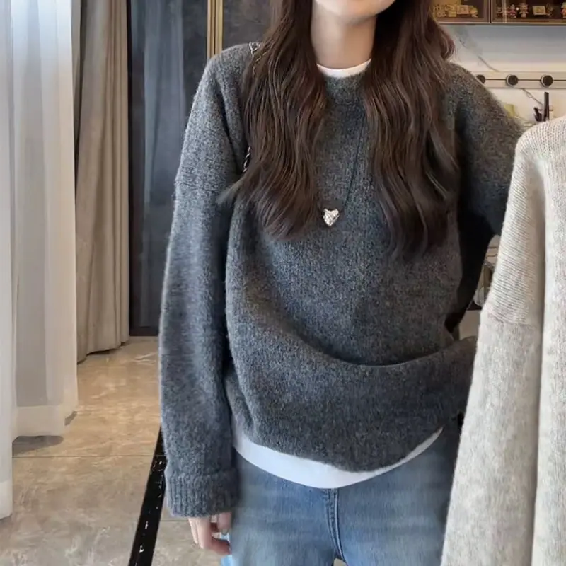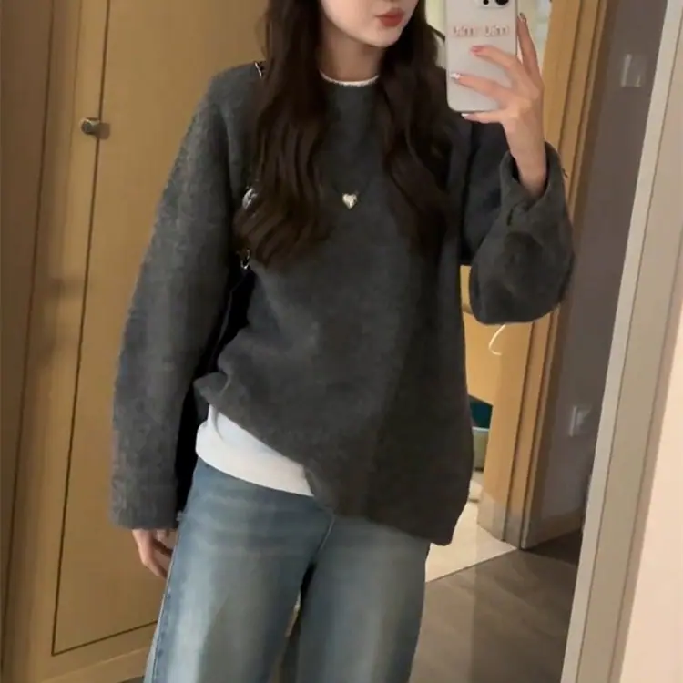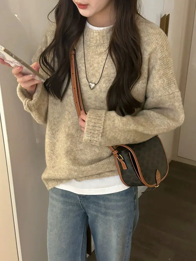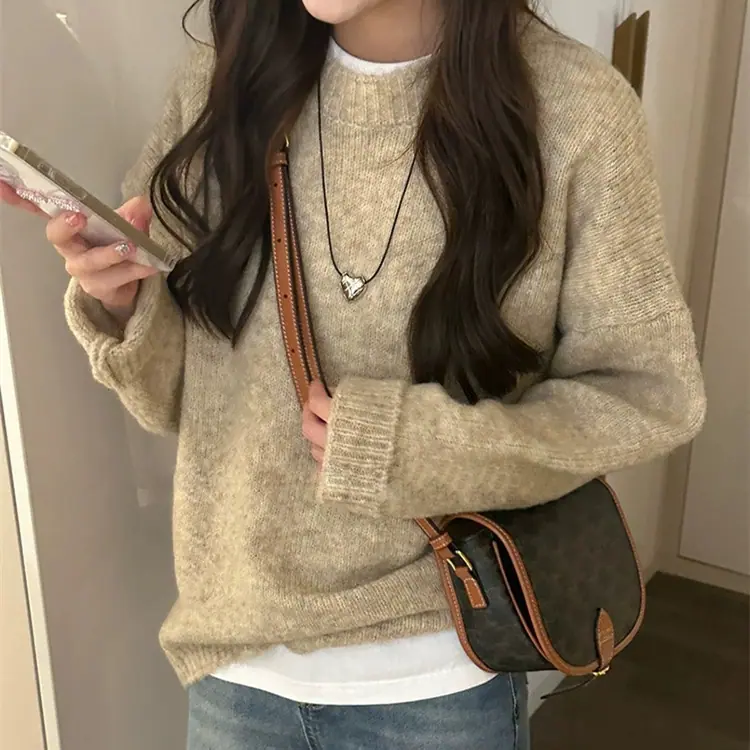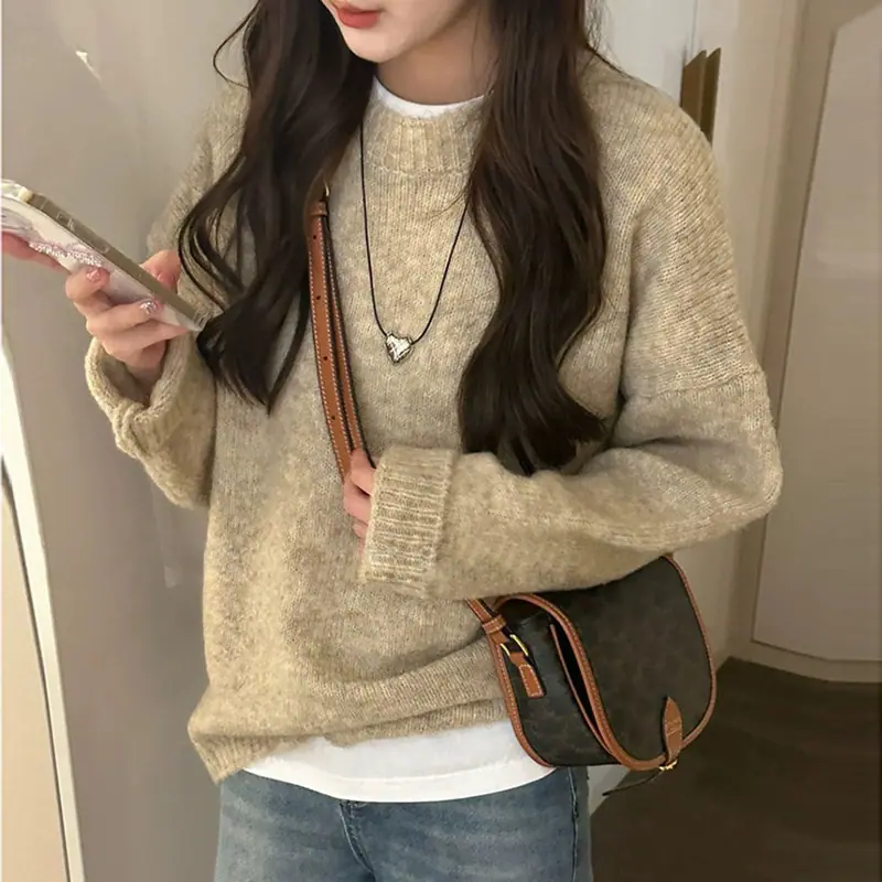 Suéter Jersey de Color Sólido Suave Ceroso para Mujer Otoño e Invierno 2025 Nuevo Estilo Relajado Básico Combinable Cuello Redondo Top
