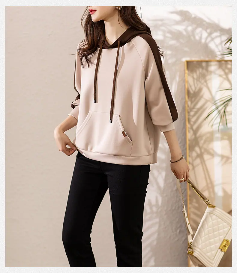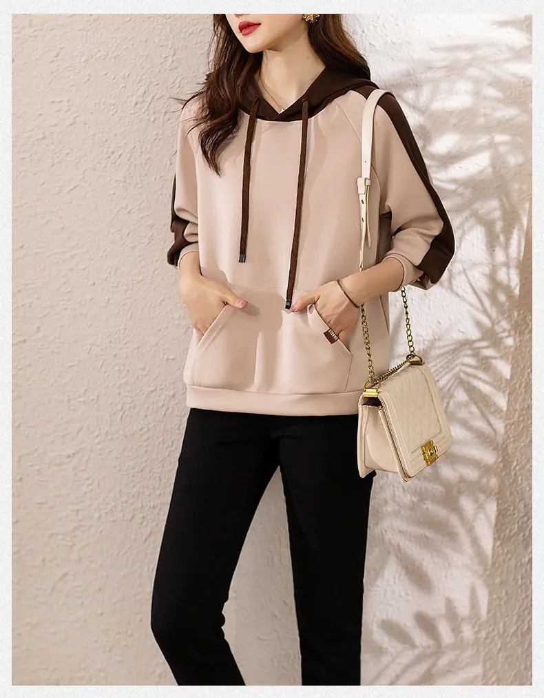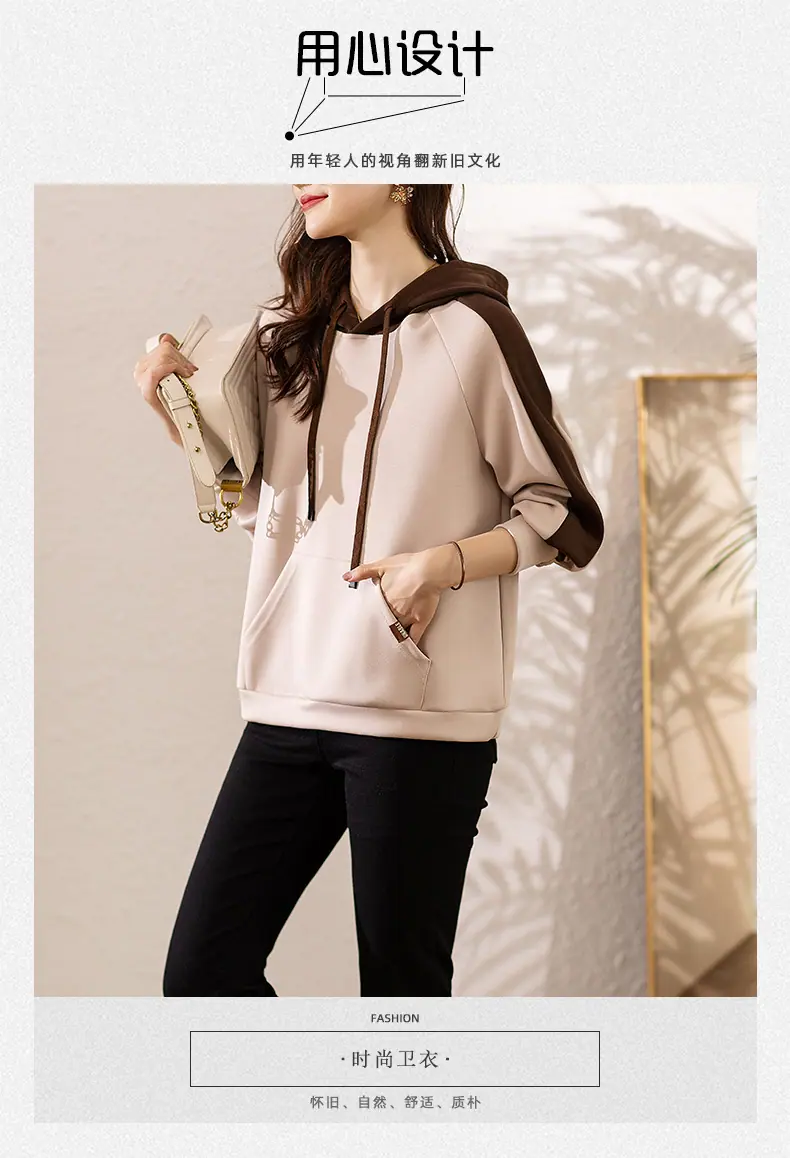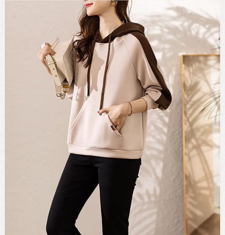Sudadera Holgada para Mujer Nueva de Primavera y Otoño 2025 Sencilla Versátil Bloque de Color con Capucha Costuras en Contraste