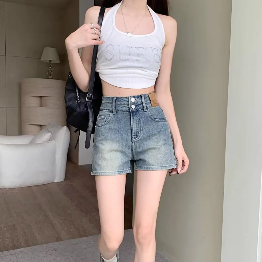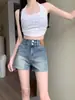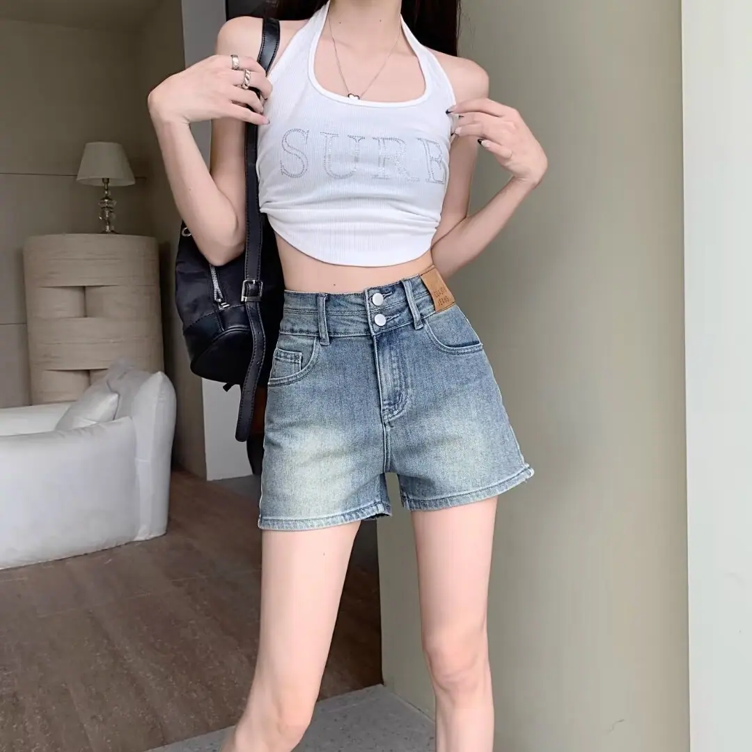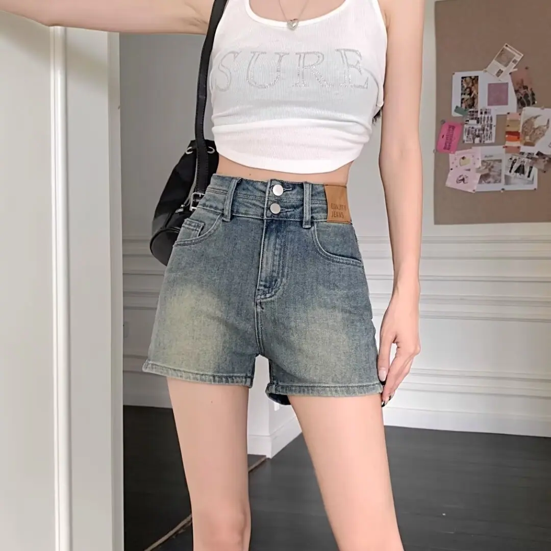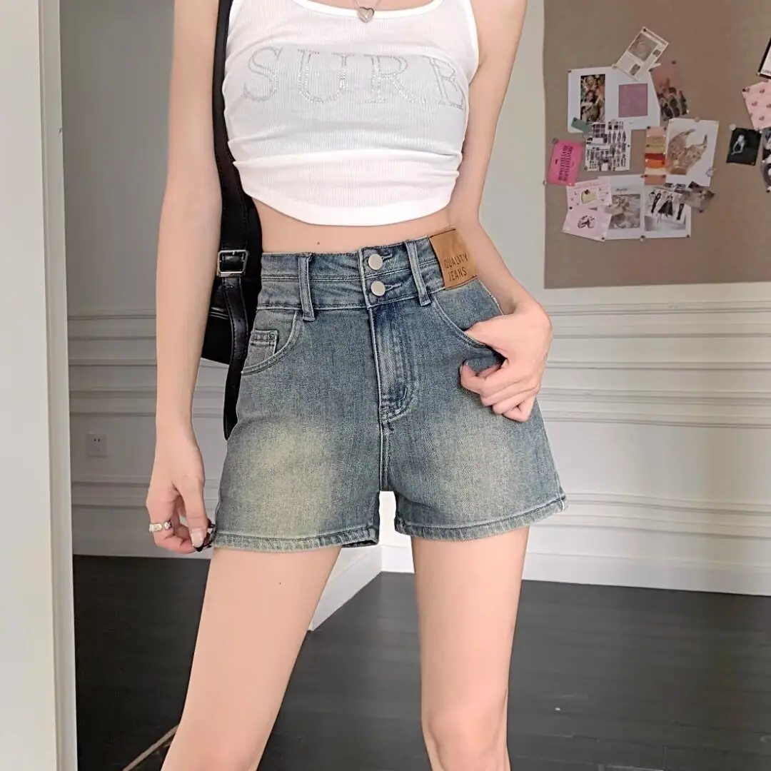 Pantalones cortos vaqueros de cintura alta estilo retro americano para mujer, verano 2024, nuevos pantalones cortos para Spice Girls, pequeños, adelgazantes, de pierna ancha, en forma de A.