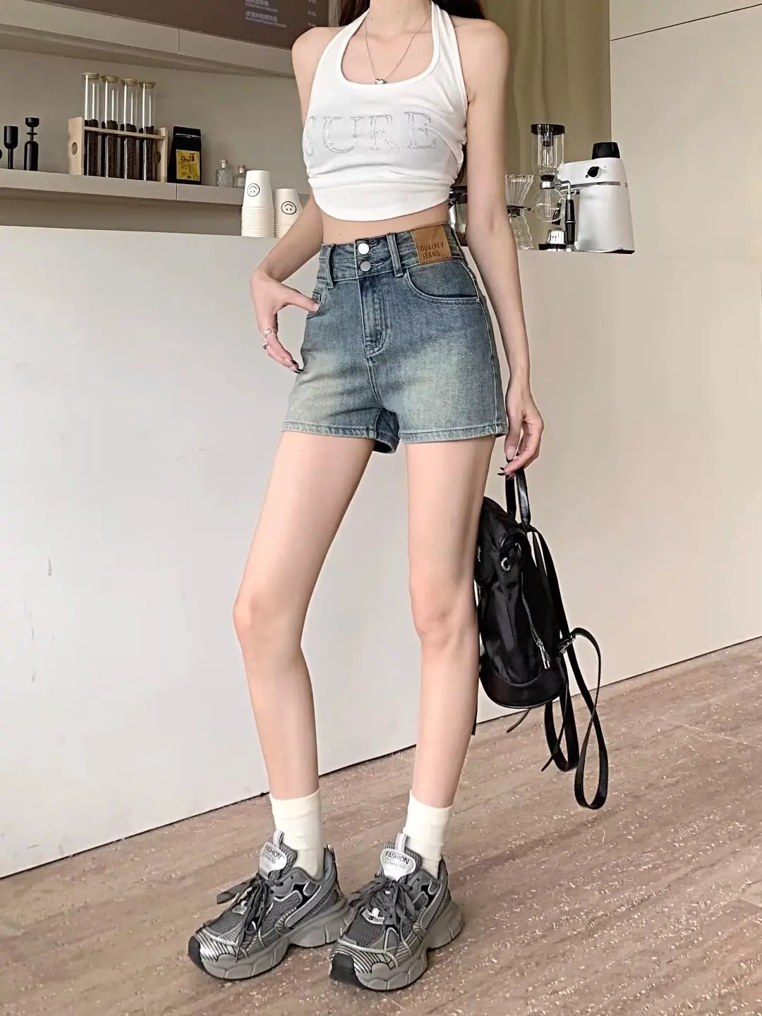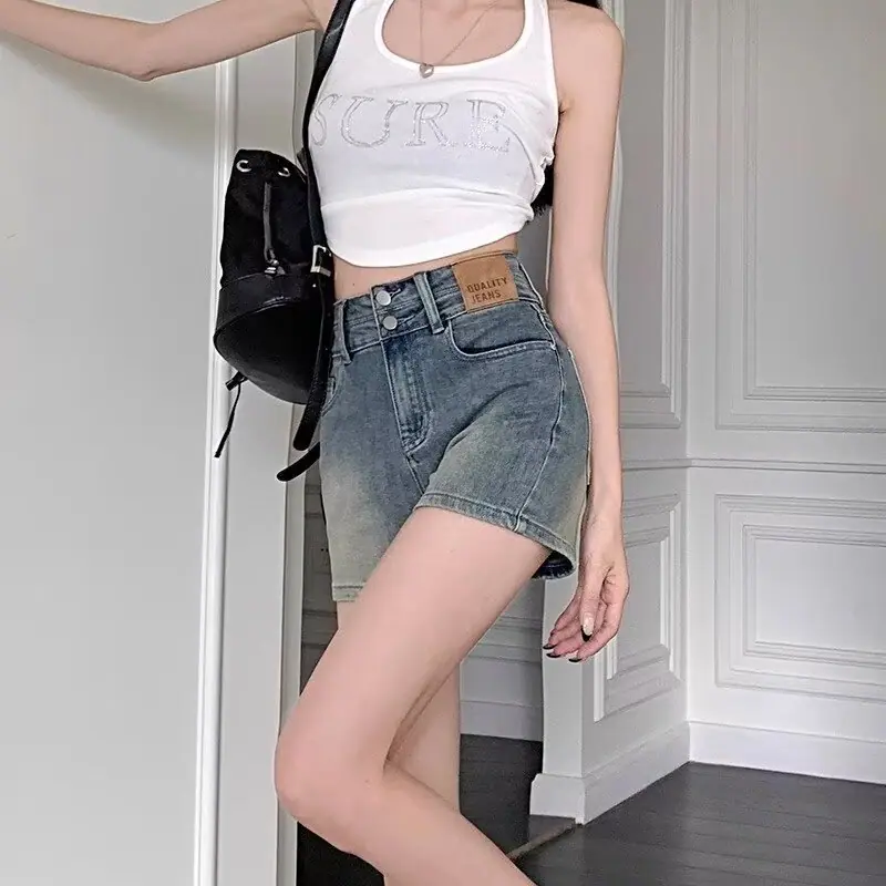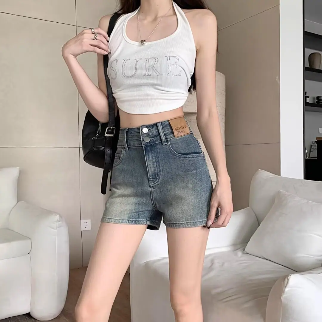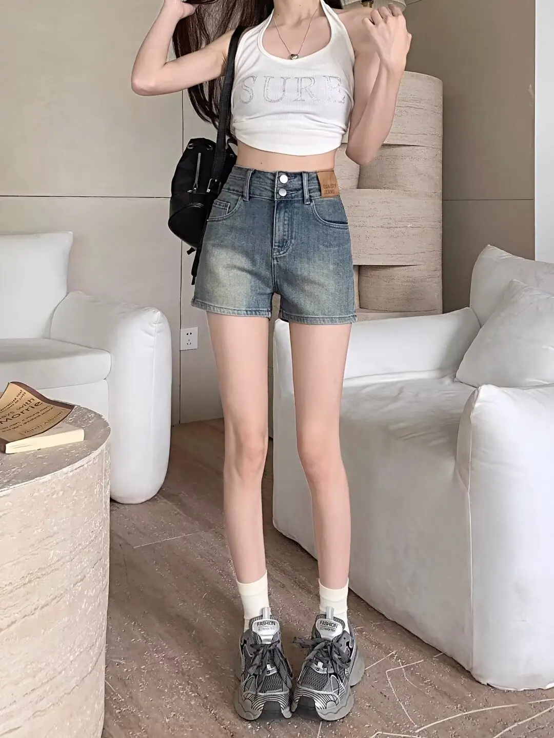 Pantalones cortos vaqueros de cintura alta estilo retro americano para mujer, verano 2024, nuevos pantalones cortos para Spice Girls, pequeños, adelgazantes, de pierna ancha, en forma de A.