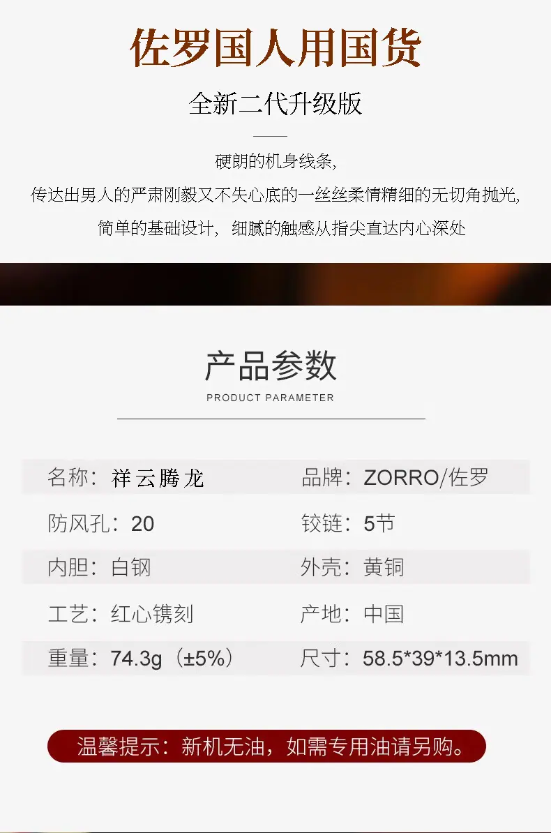 ZORRO ZORRO segunda generación mejorado Xiangyun Tenglong encendedor de queroseno a prueba de viento moda nacional creativo personalizado regalo masculino