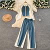 Traje Deportivo Casual para Mujer Estilo Hong Kong Retro Moda Combinación de Colores Cierre Top Manga Larga Cintura Alta Suelto Pantalón de Pierna Ancha Set
