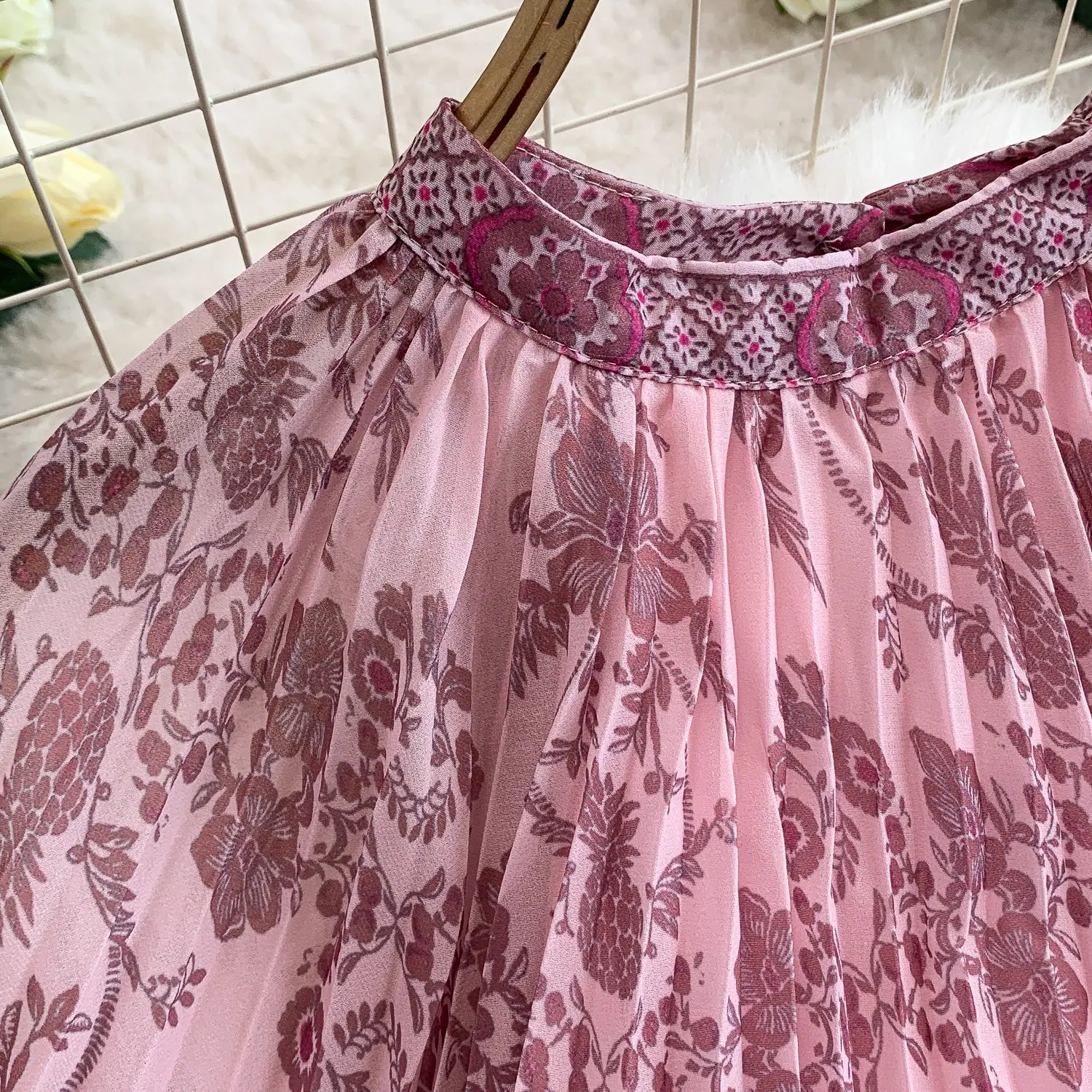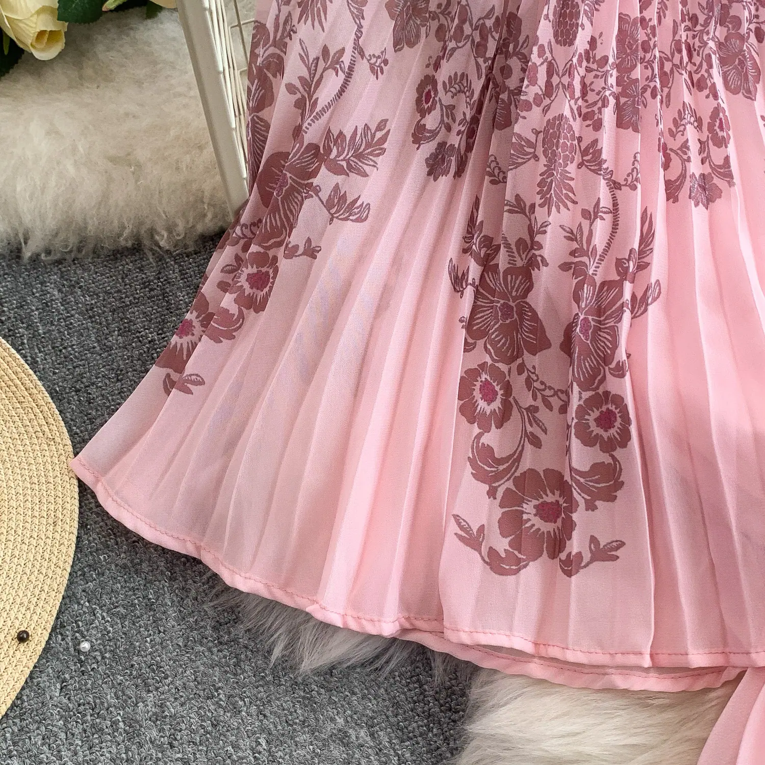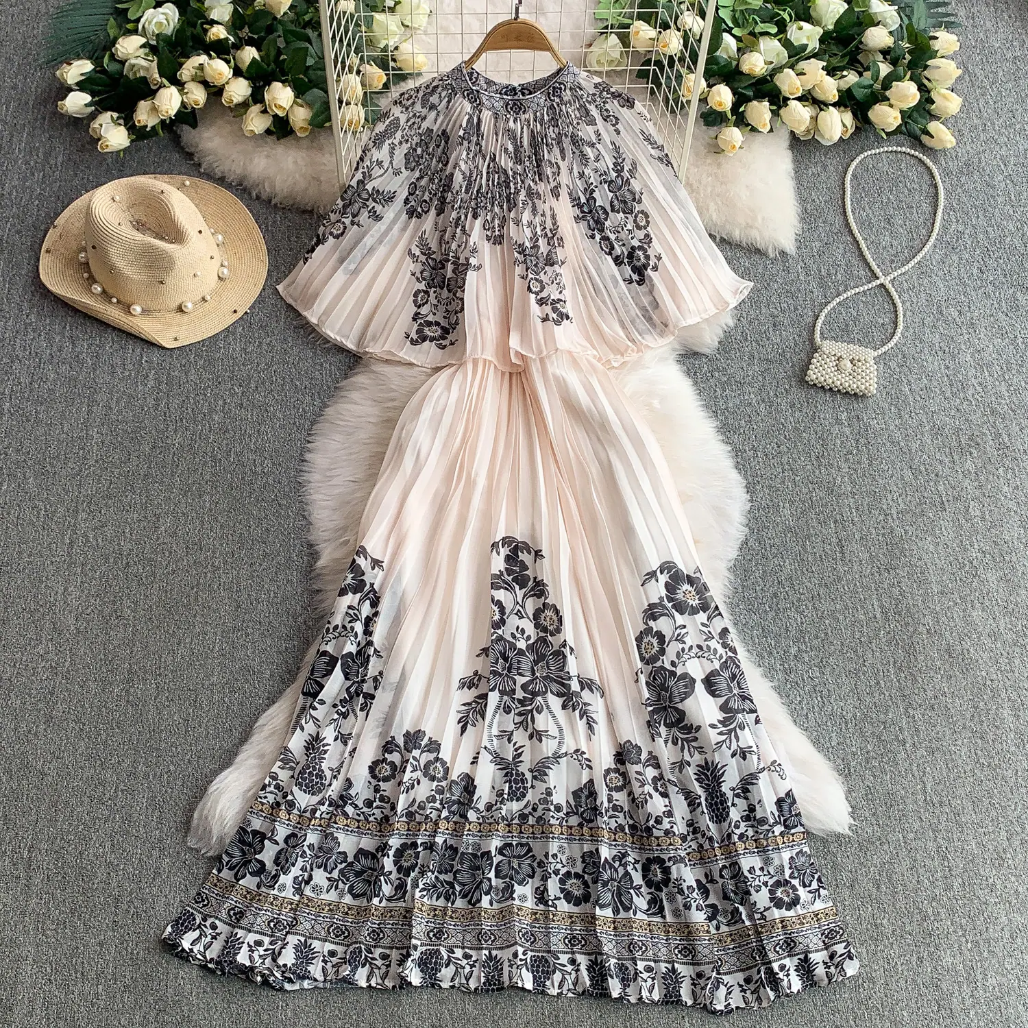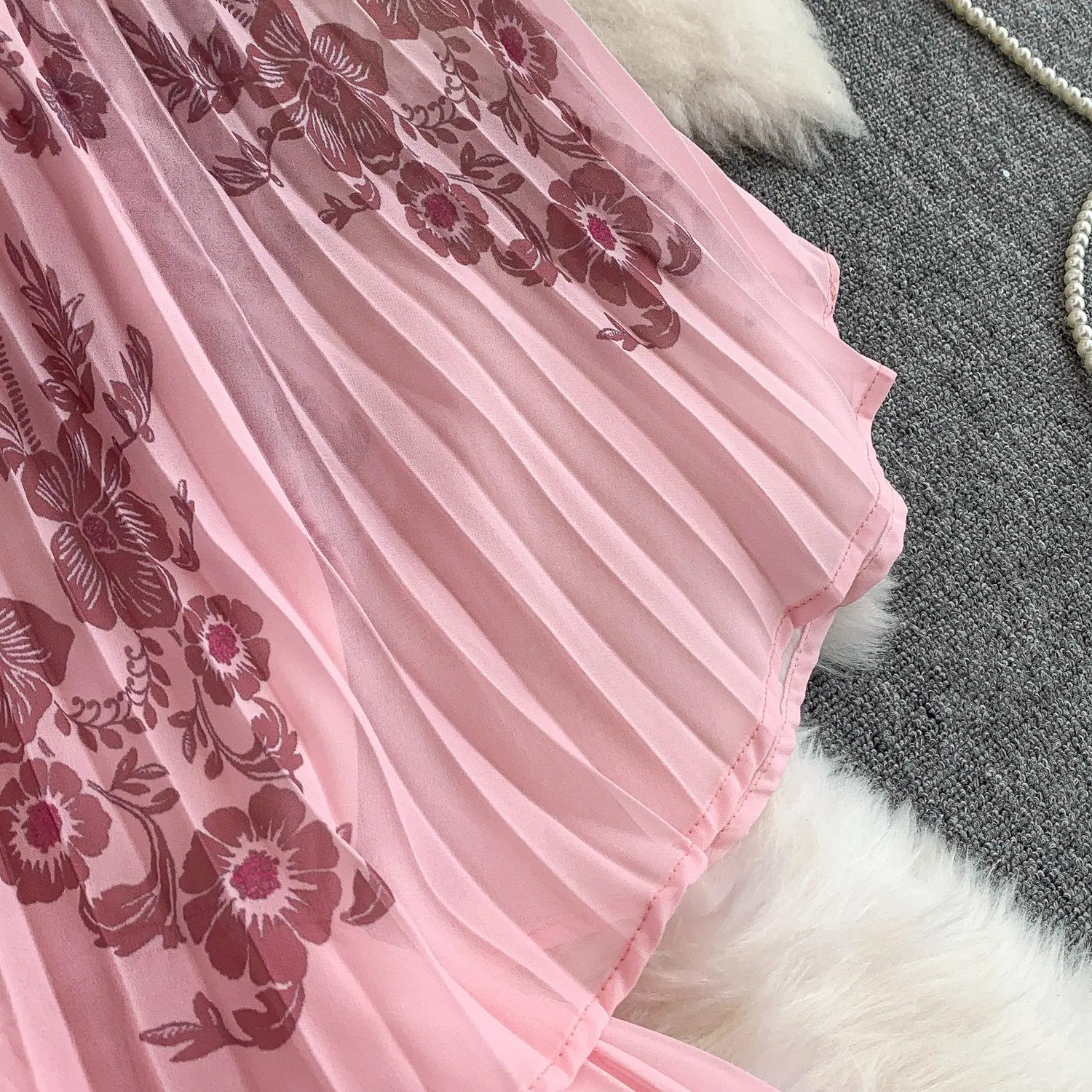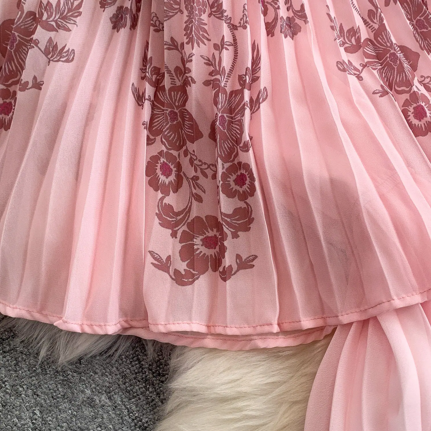 Blusa Vestido Retro Francés Estampado Cuello Redondo para Mujer Verano Europeo y Americano de Alta Gama Adelgazante de Cintura Falda Larga Plisada