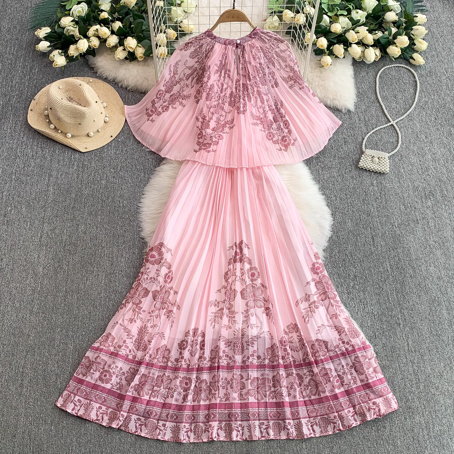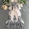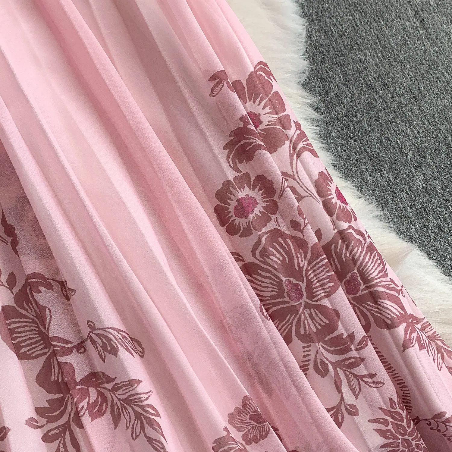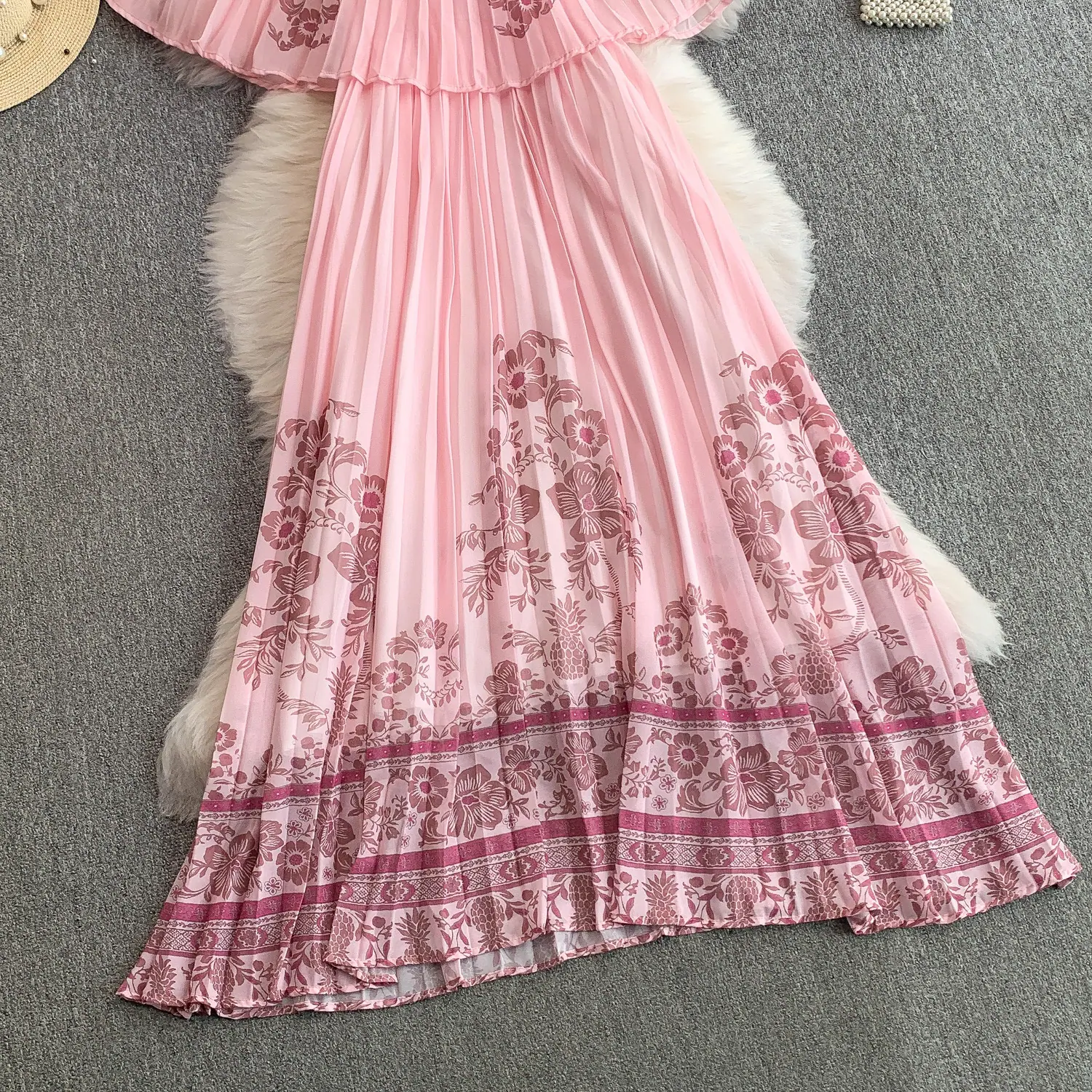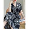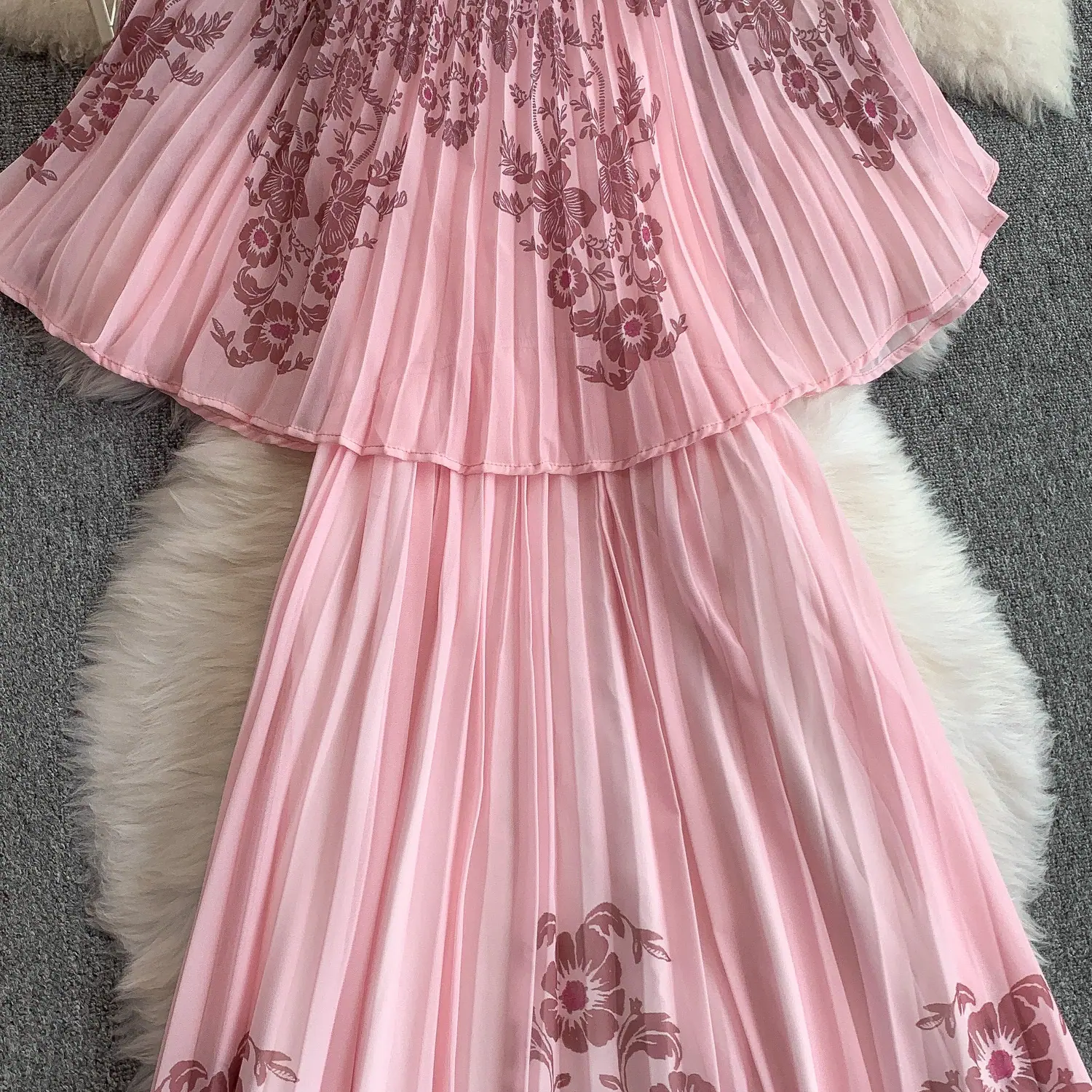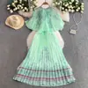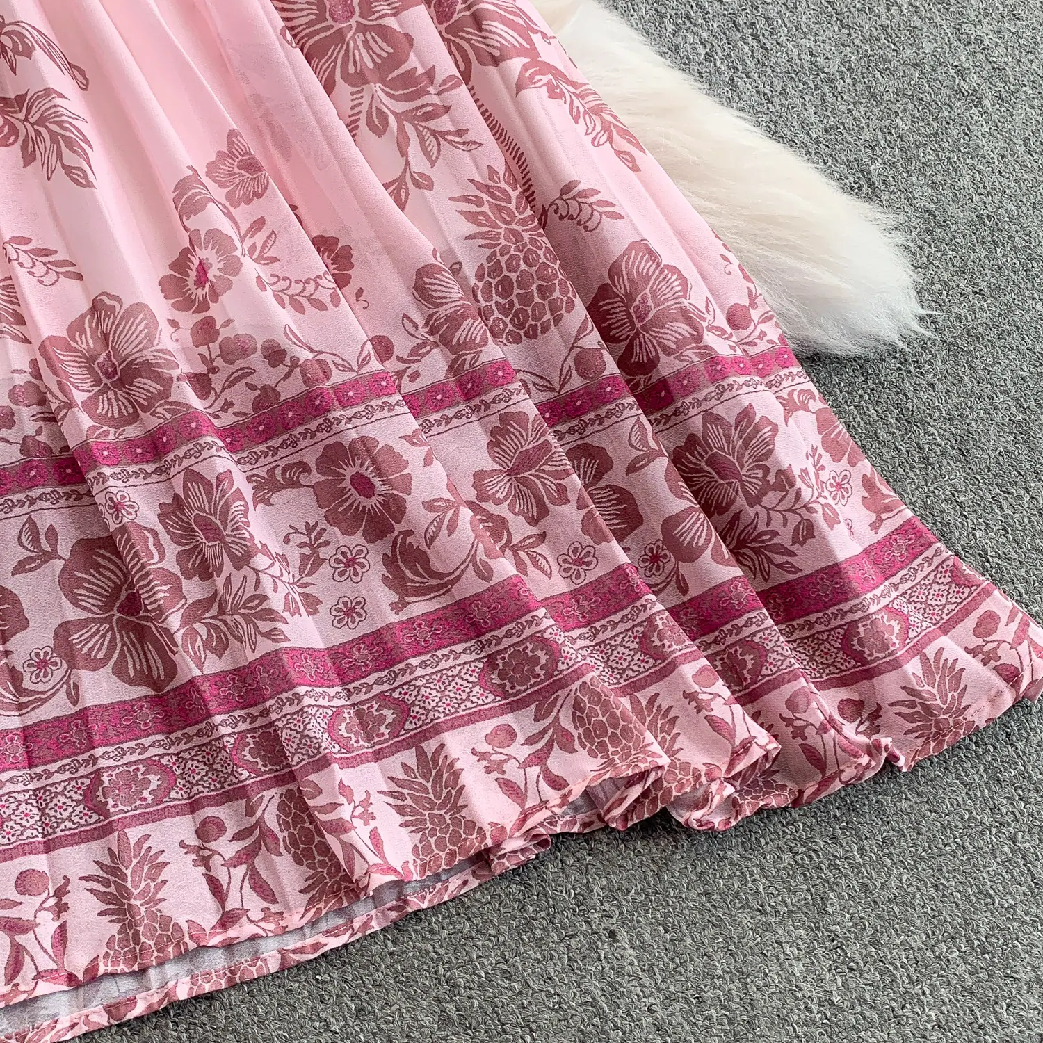 Blusa Vestido Retro Francés Estampado Cuello Redondo para Mujer Verano Europeo y Americano de Alta Gama Adelgazante de Cintura Falda Larga Plisada