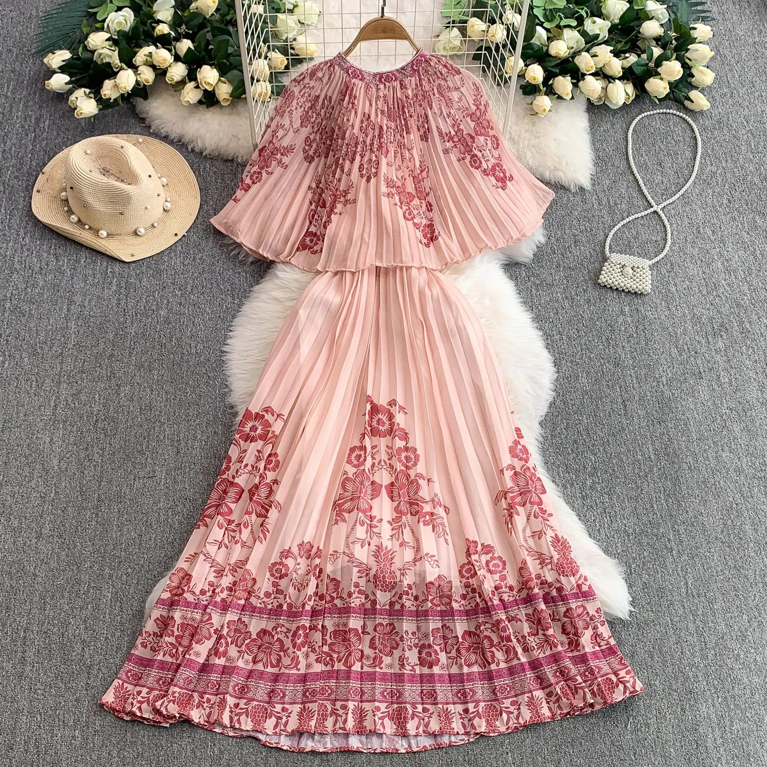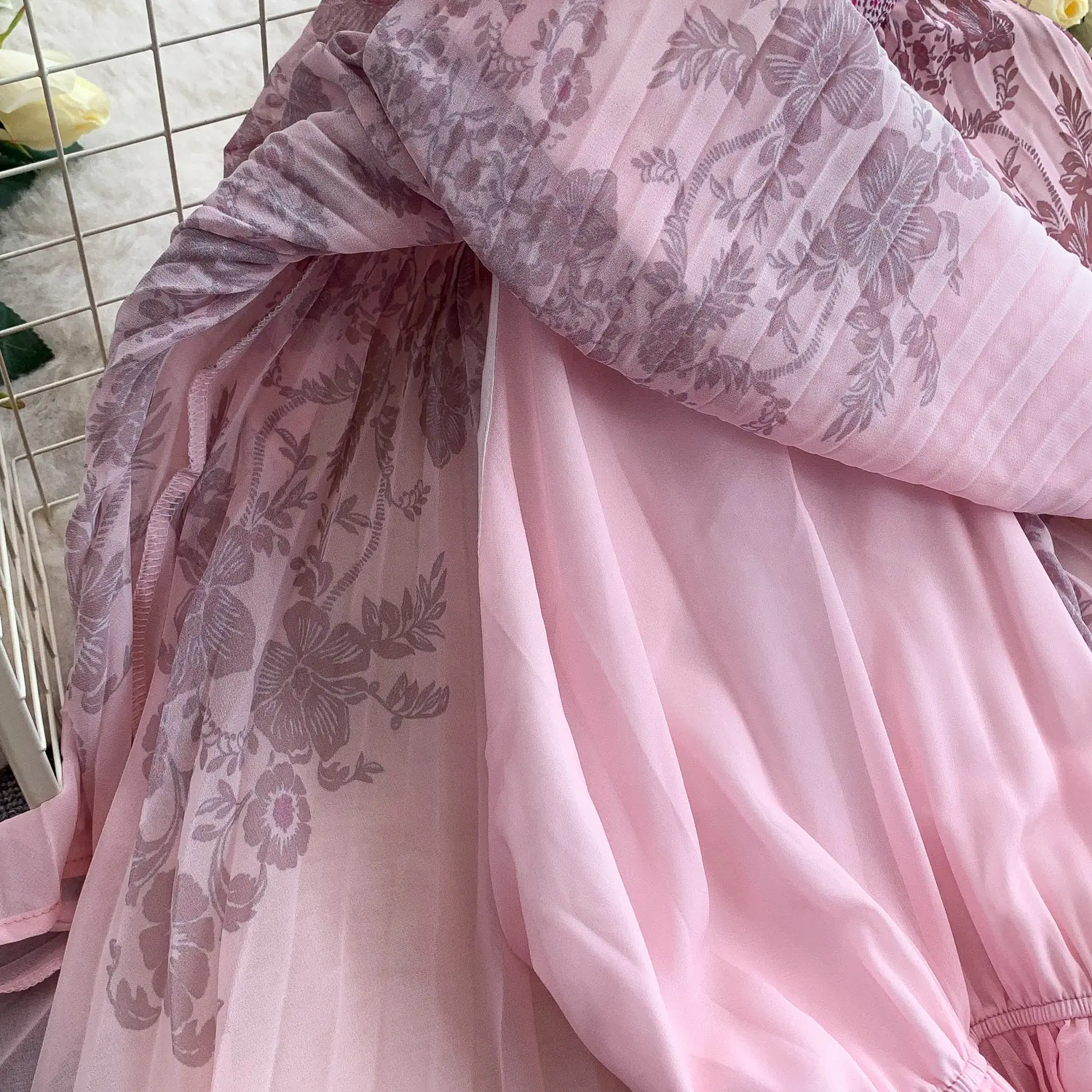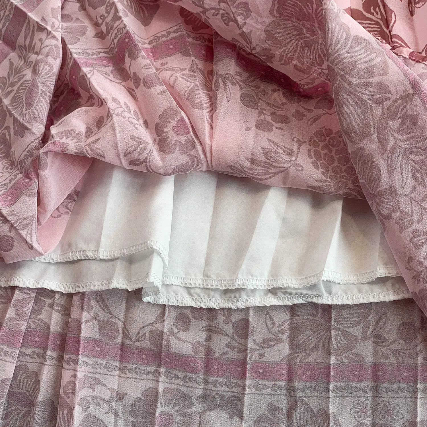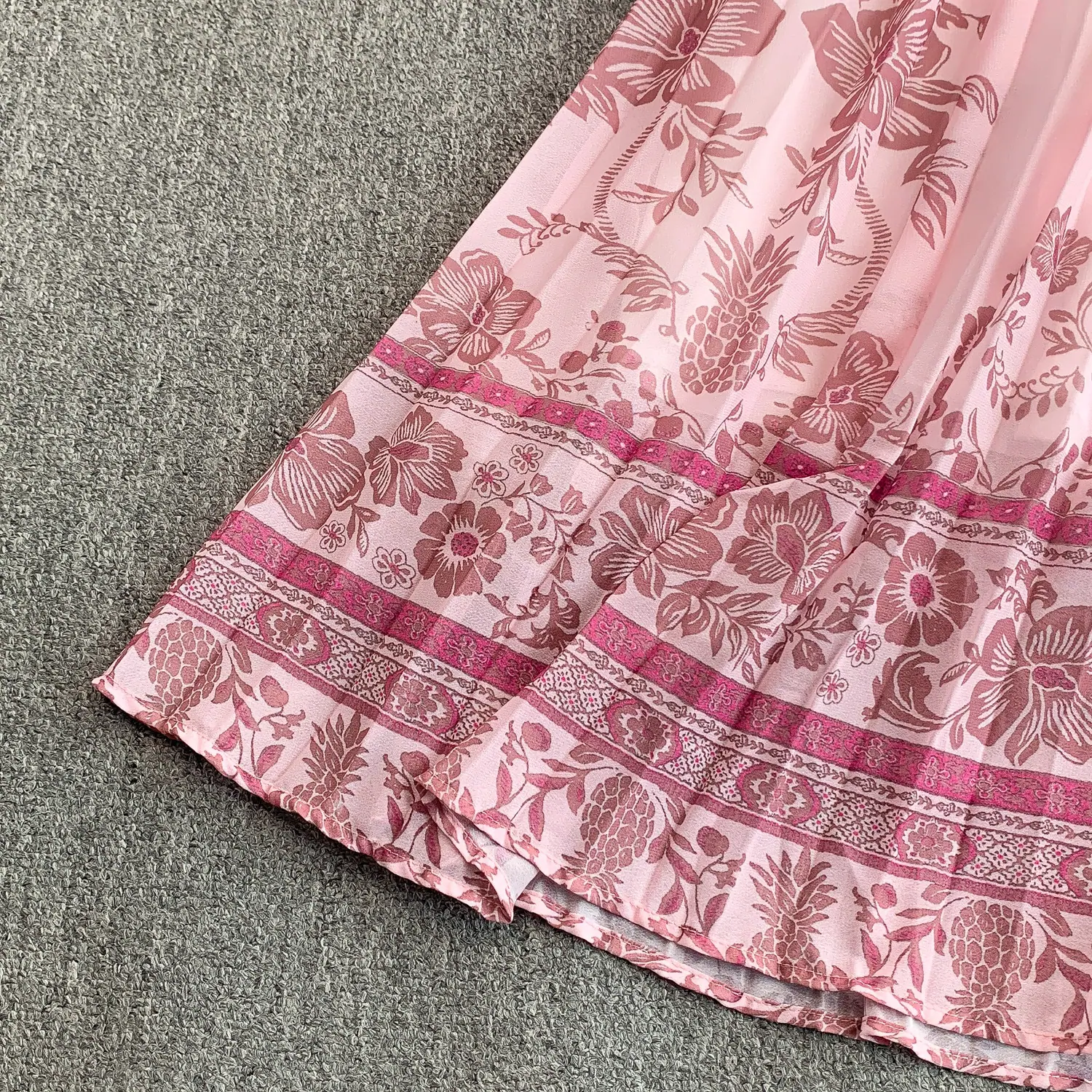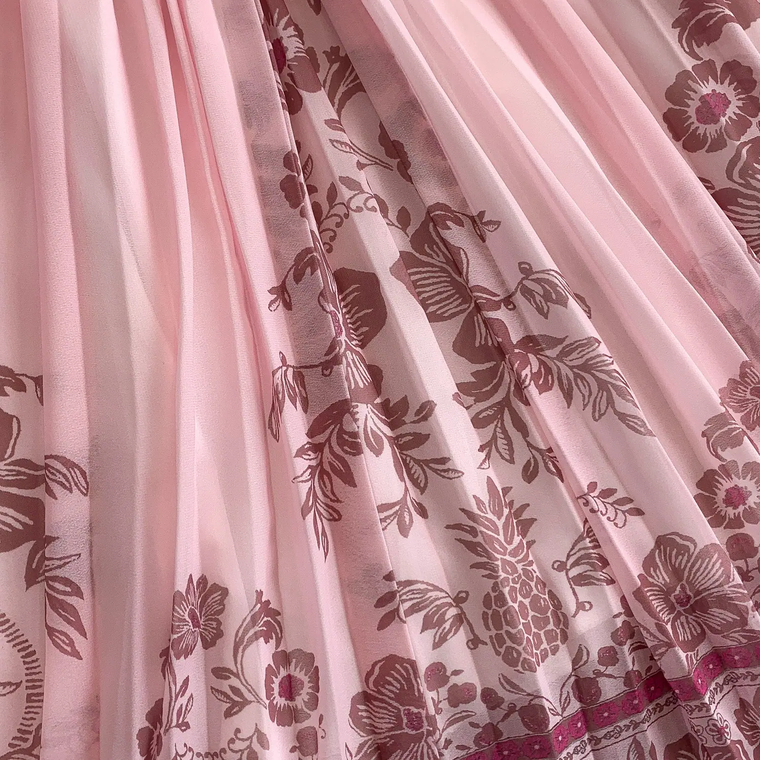 Blusa Vestido Retro Francés Estampado Cuello Redondo para Mujer Verano Europeo y Americano de Alta Gama Adelgazante de Cintura Falda Larga Plisada