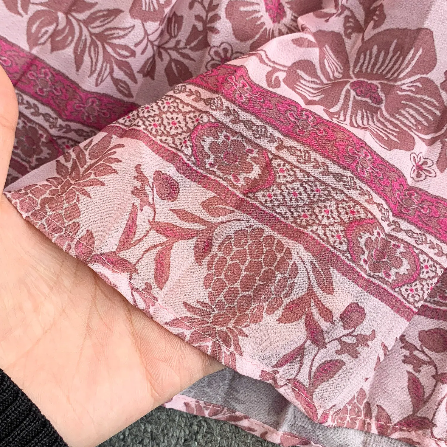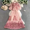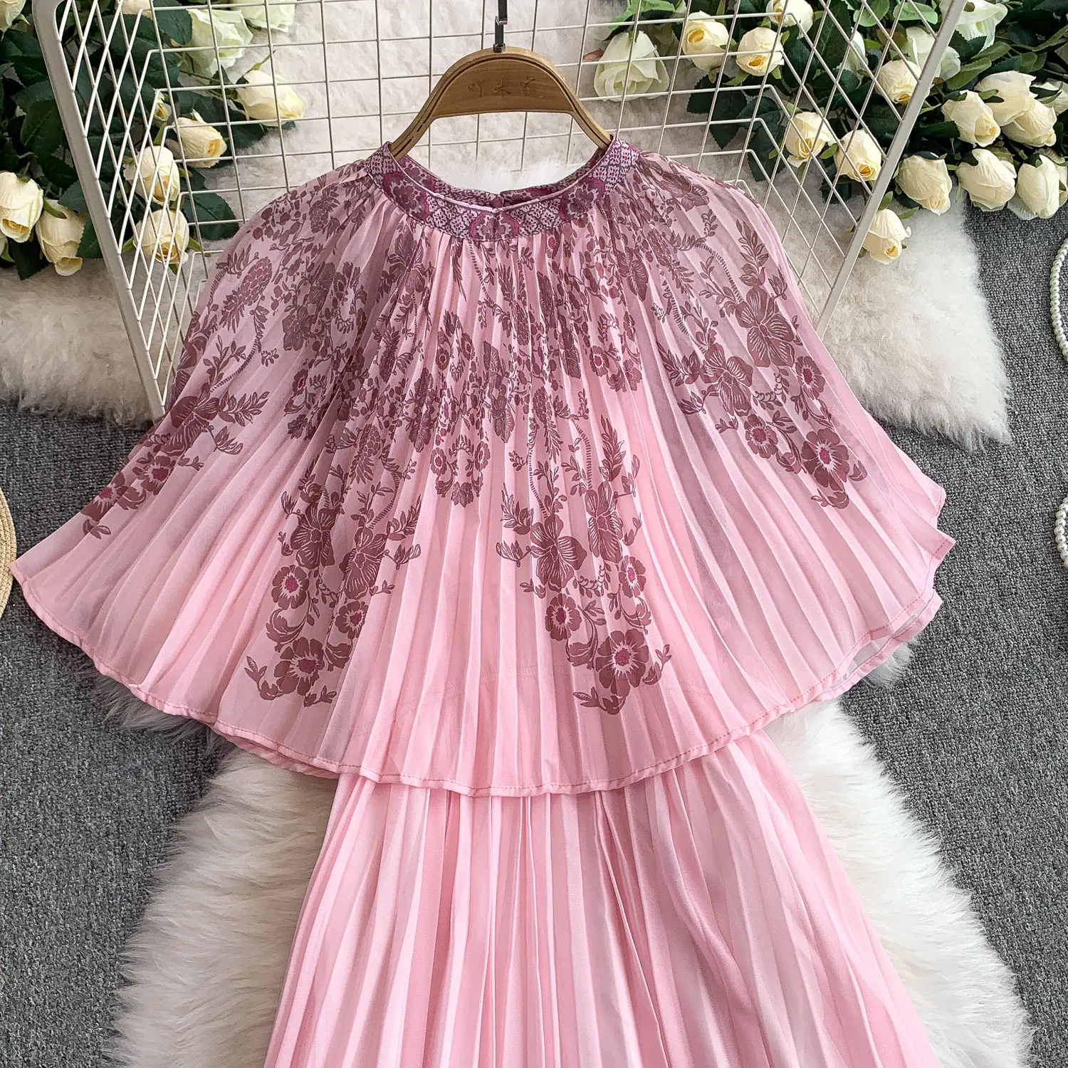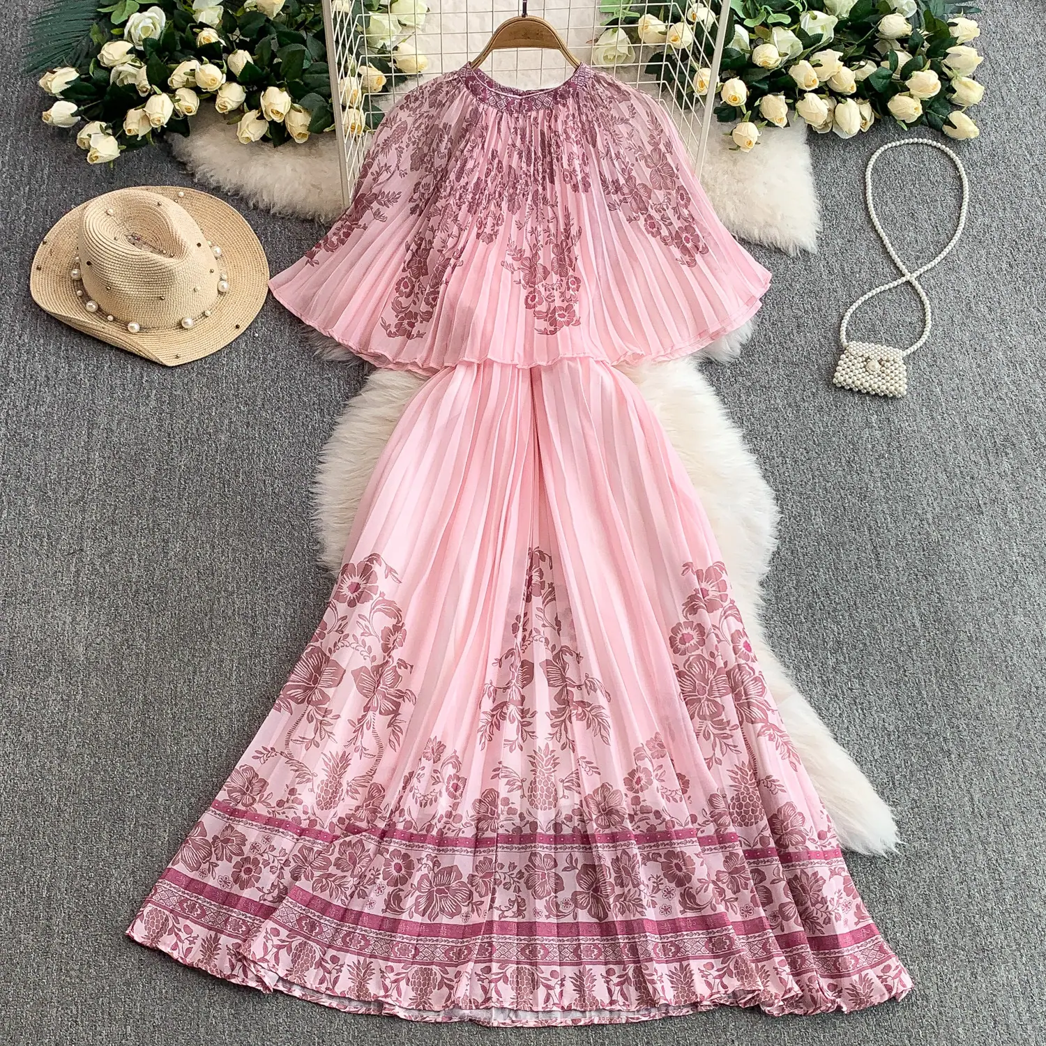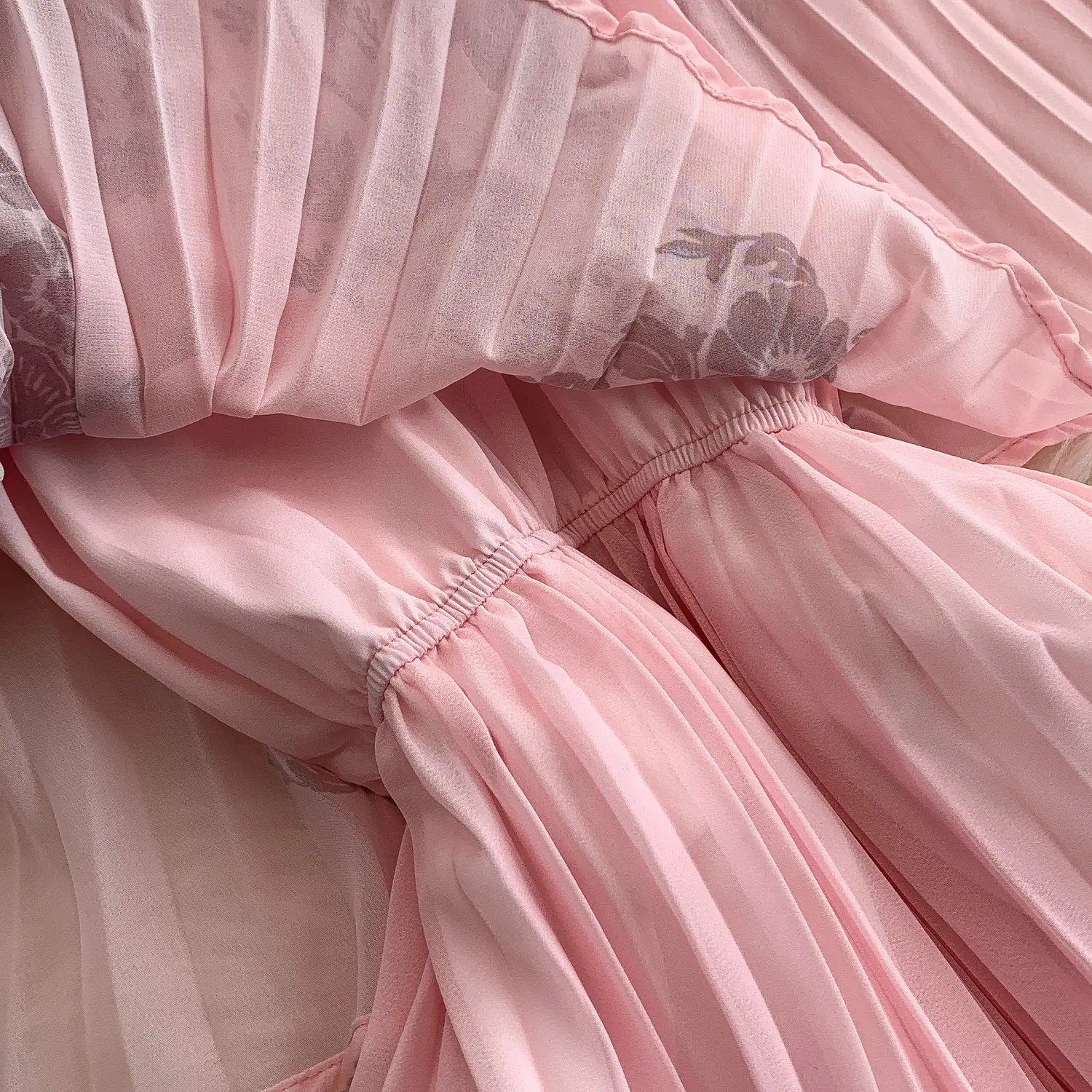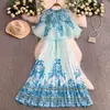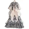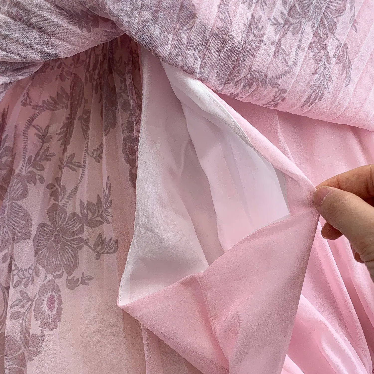 Blusa Vestido Retro Francés Estampado Cuello Redondo para Mujer Verano Europeo y Americano de Alta Gama Adelgazante de Cintura Falda Larga Plisada