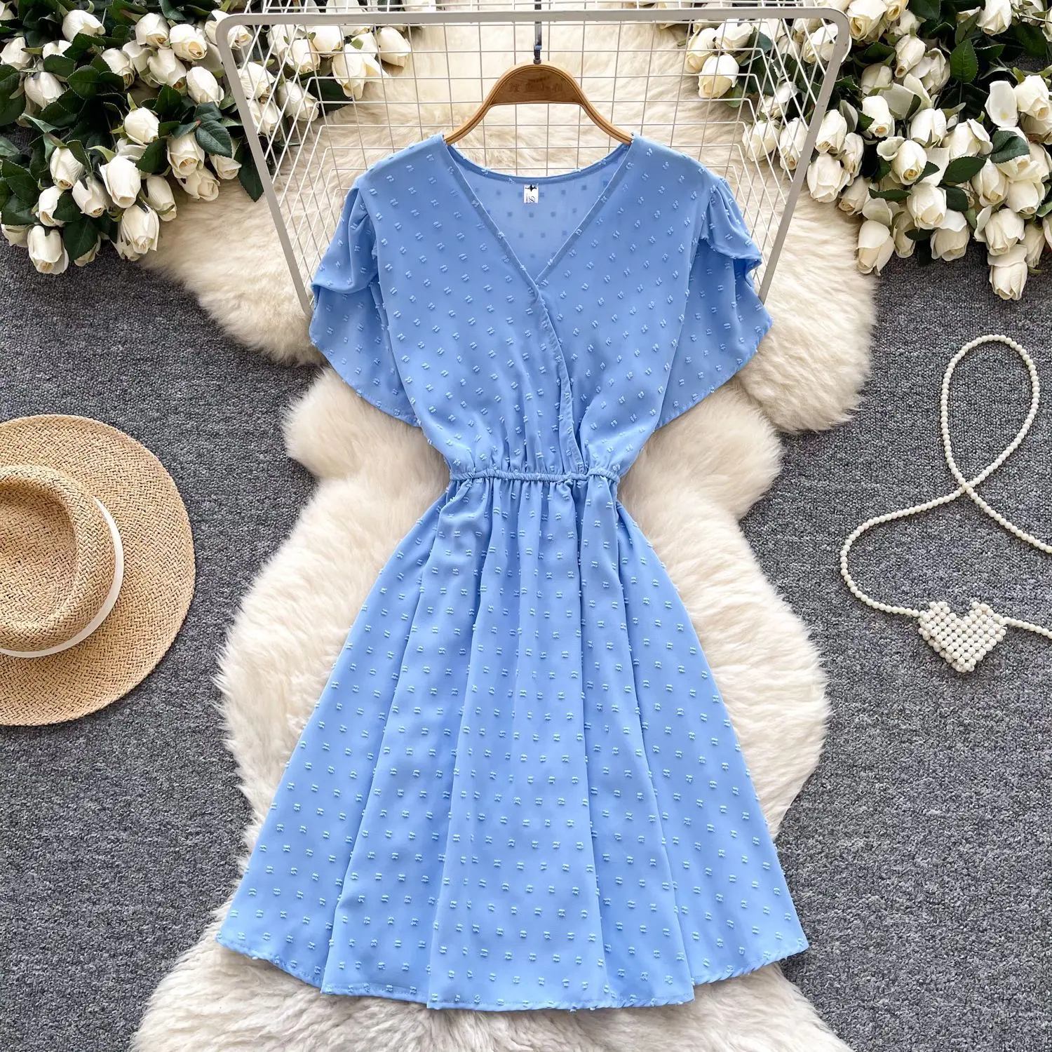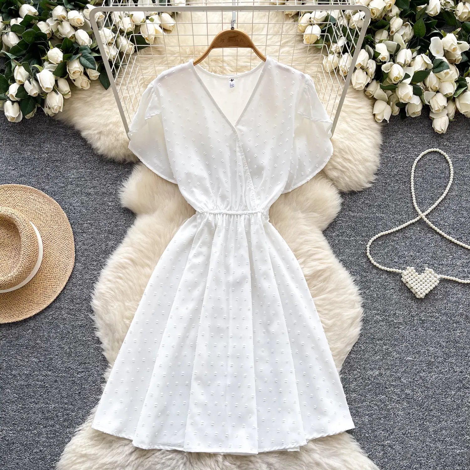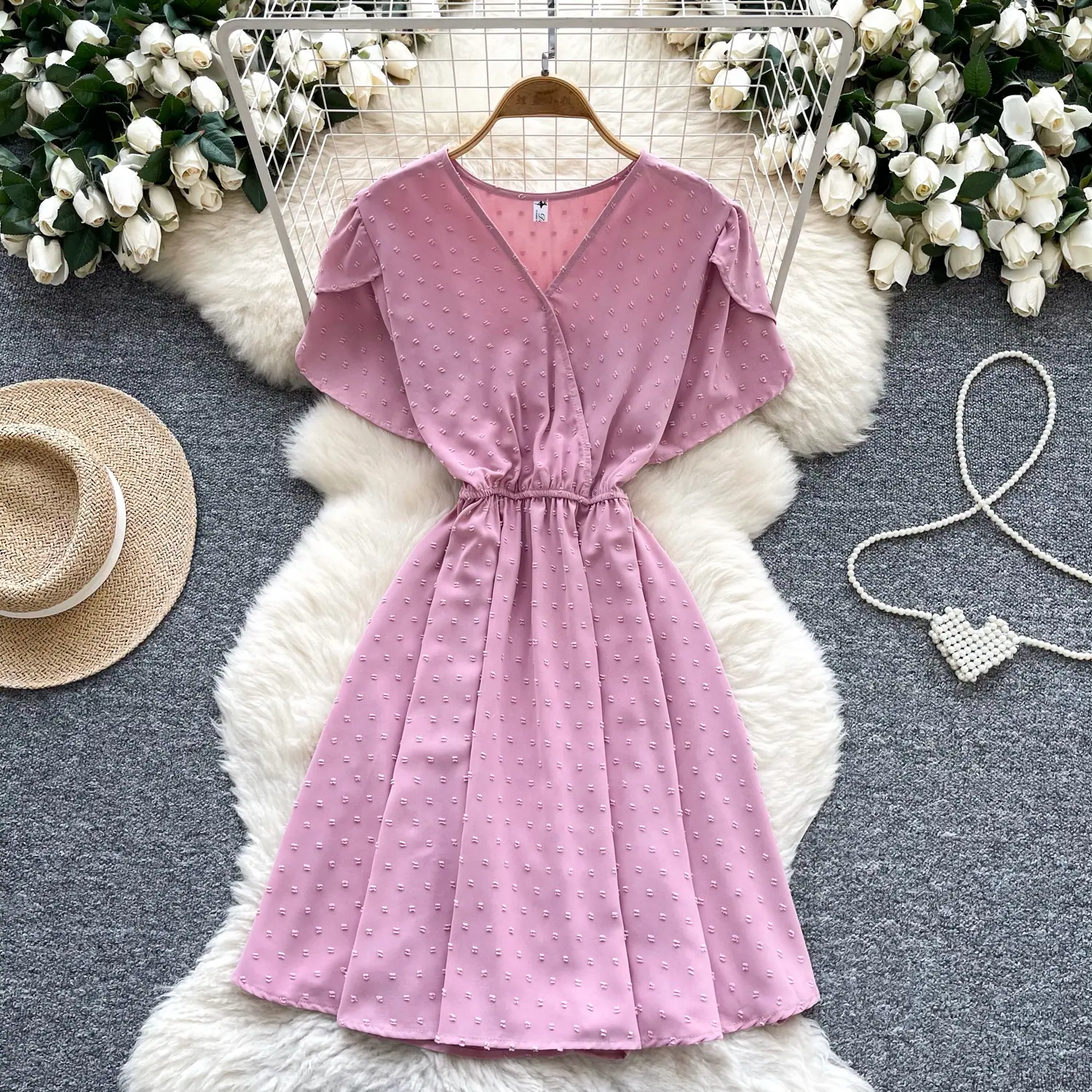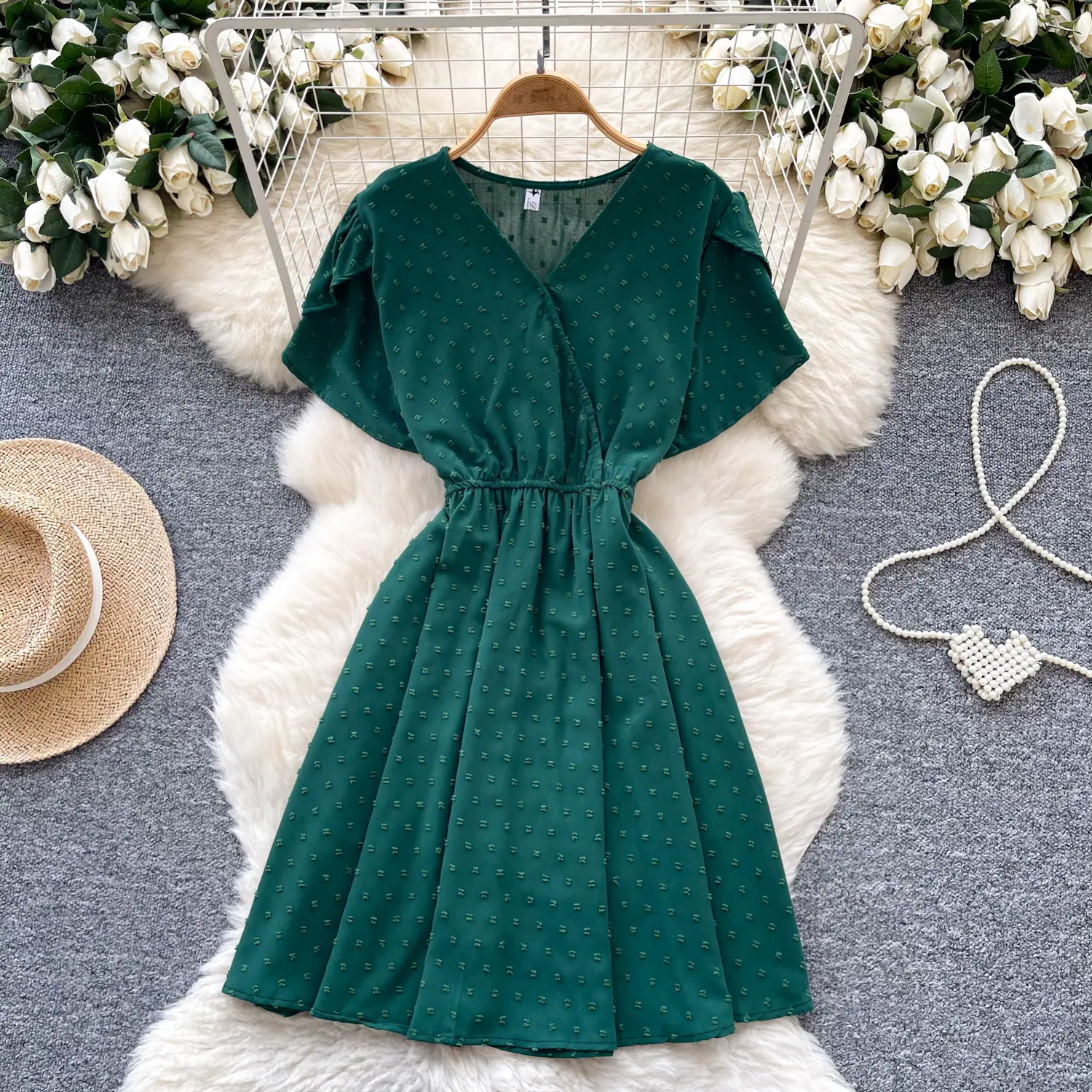 Vestido de Cintura de Manga Corta con Cuello en V de Estilo Dulce y Delicado para Mujer 2025 Verano Francés Look Adelgazante Elegante Súper Hada Falda Corta