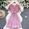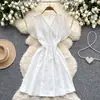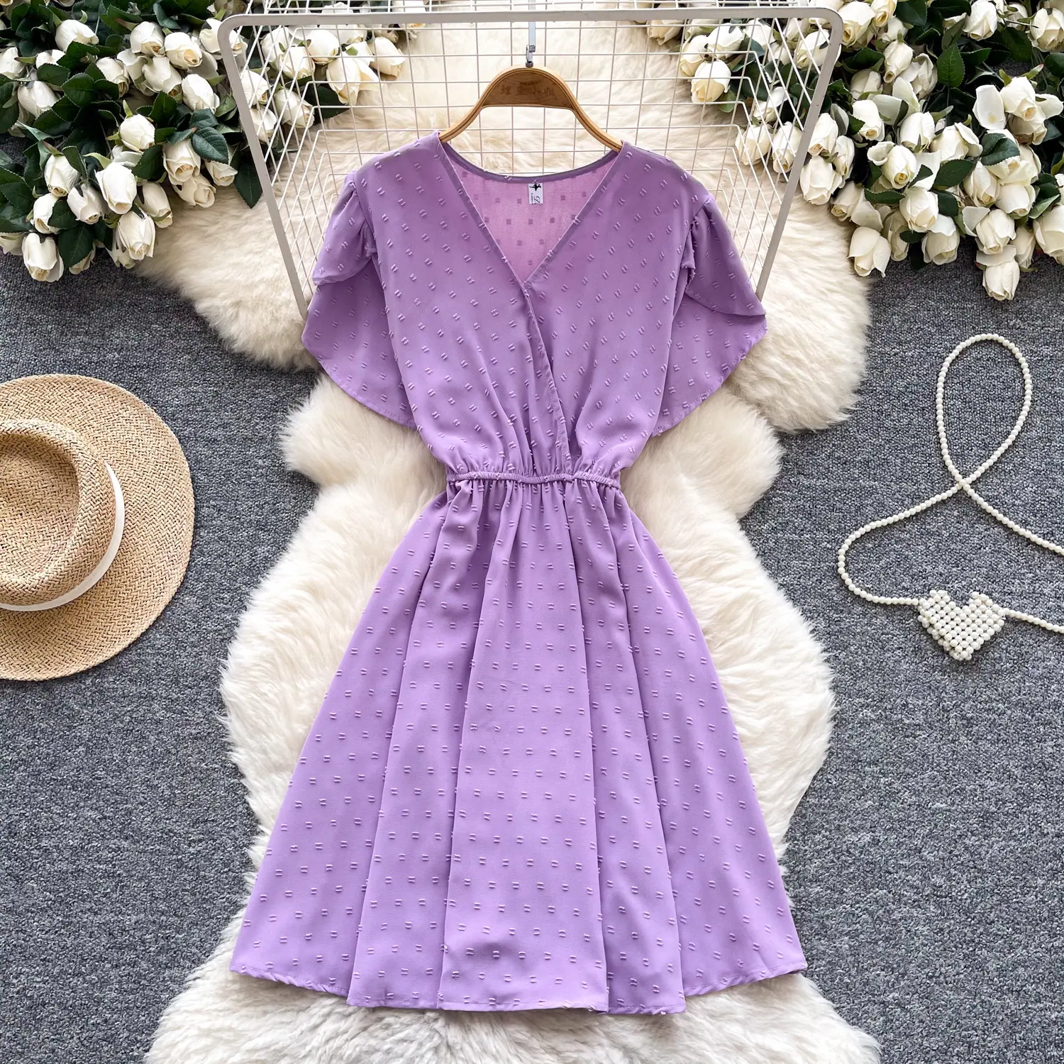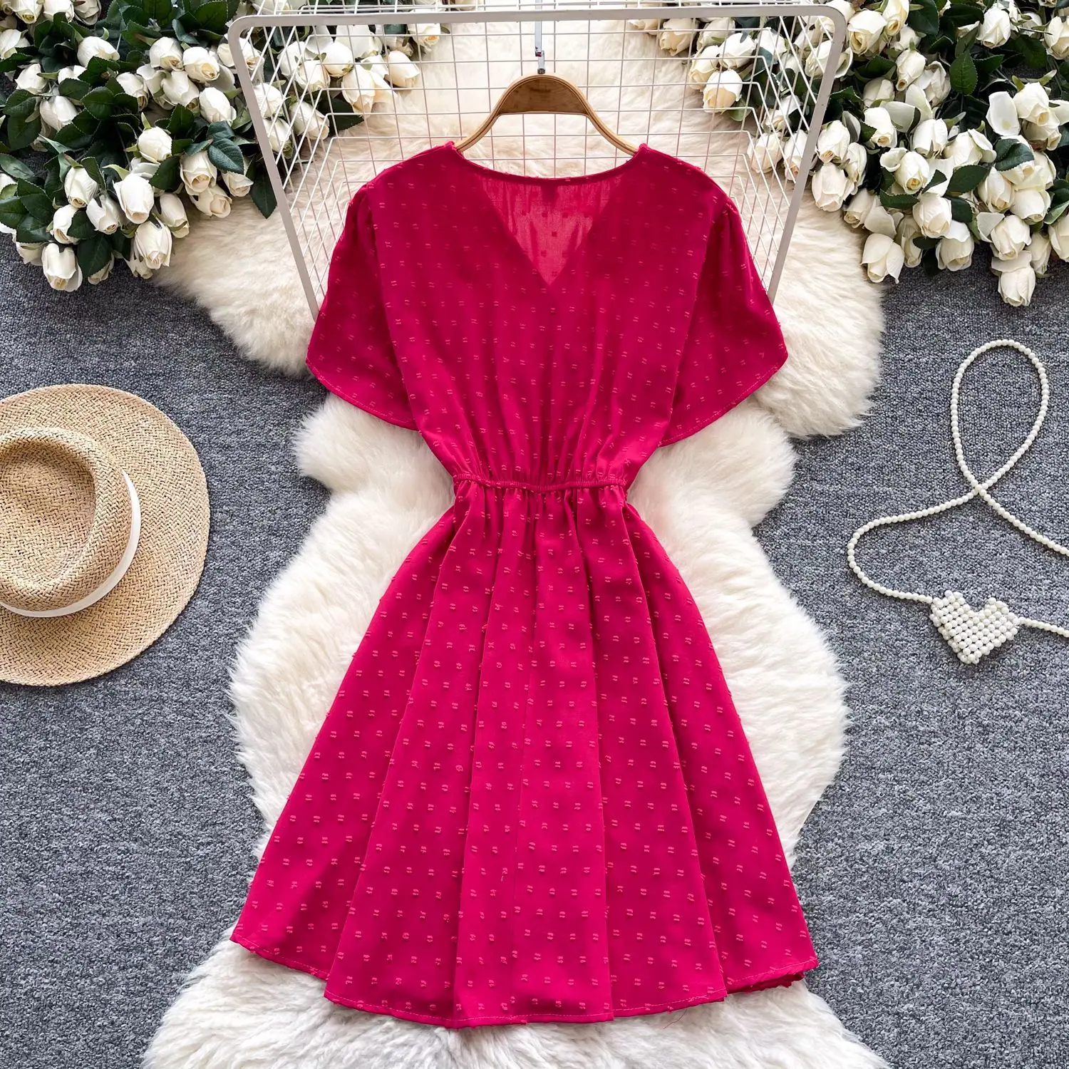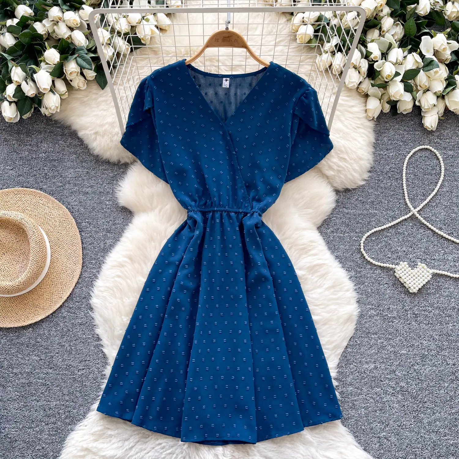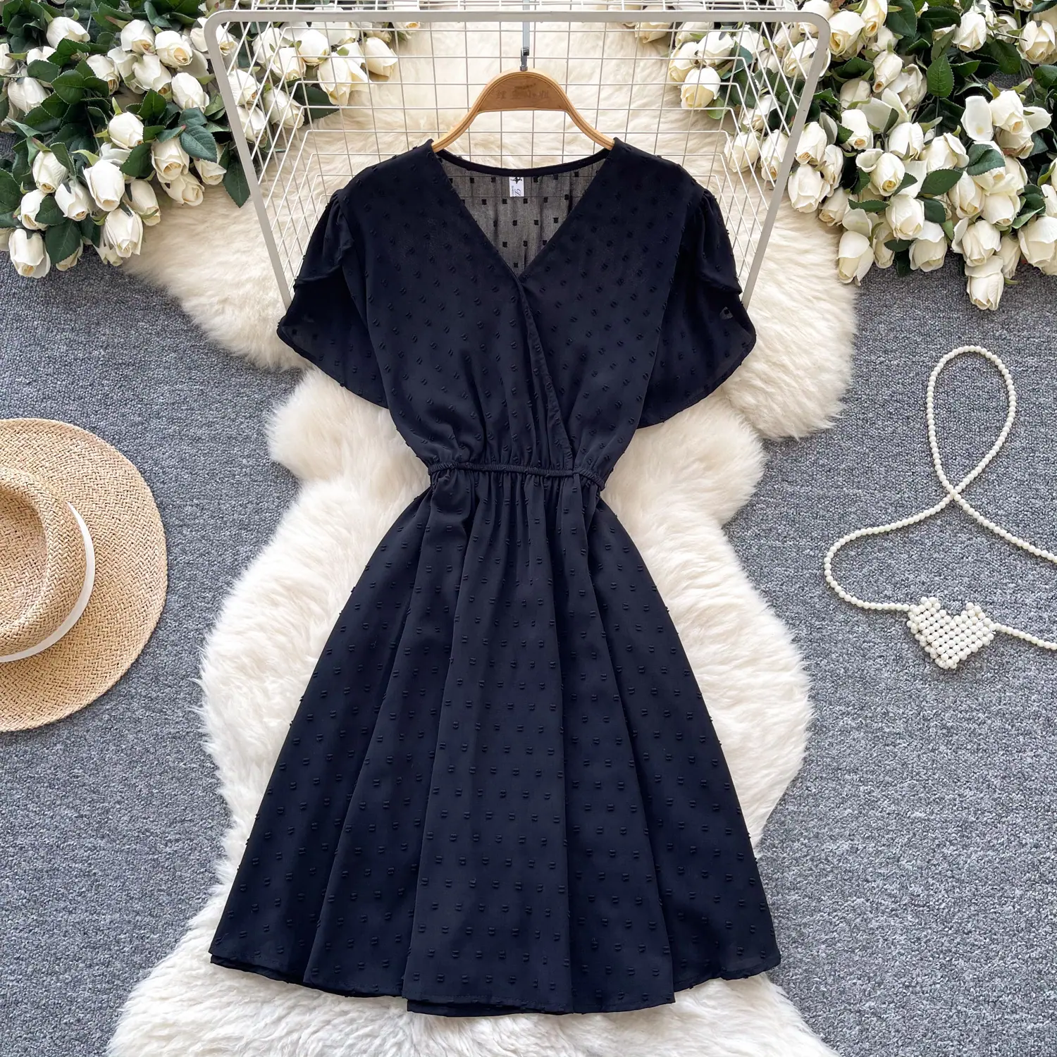 Vestido de Cintura de Manga Corta con Cuello en V de Estilo Dulce y Delicado para Mujer 2025 Verano Francés Look Adelgazante Elegante Súper Hada Falda Corta