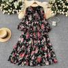 Vestido de Cintura Alta para Mujer Nuevo Estilo Francés de Principios de Otoño Retro Cuello Manga Linterna Adelgazante Elegante con Volantes Floral Largo