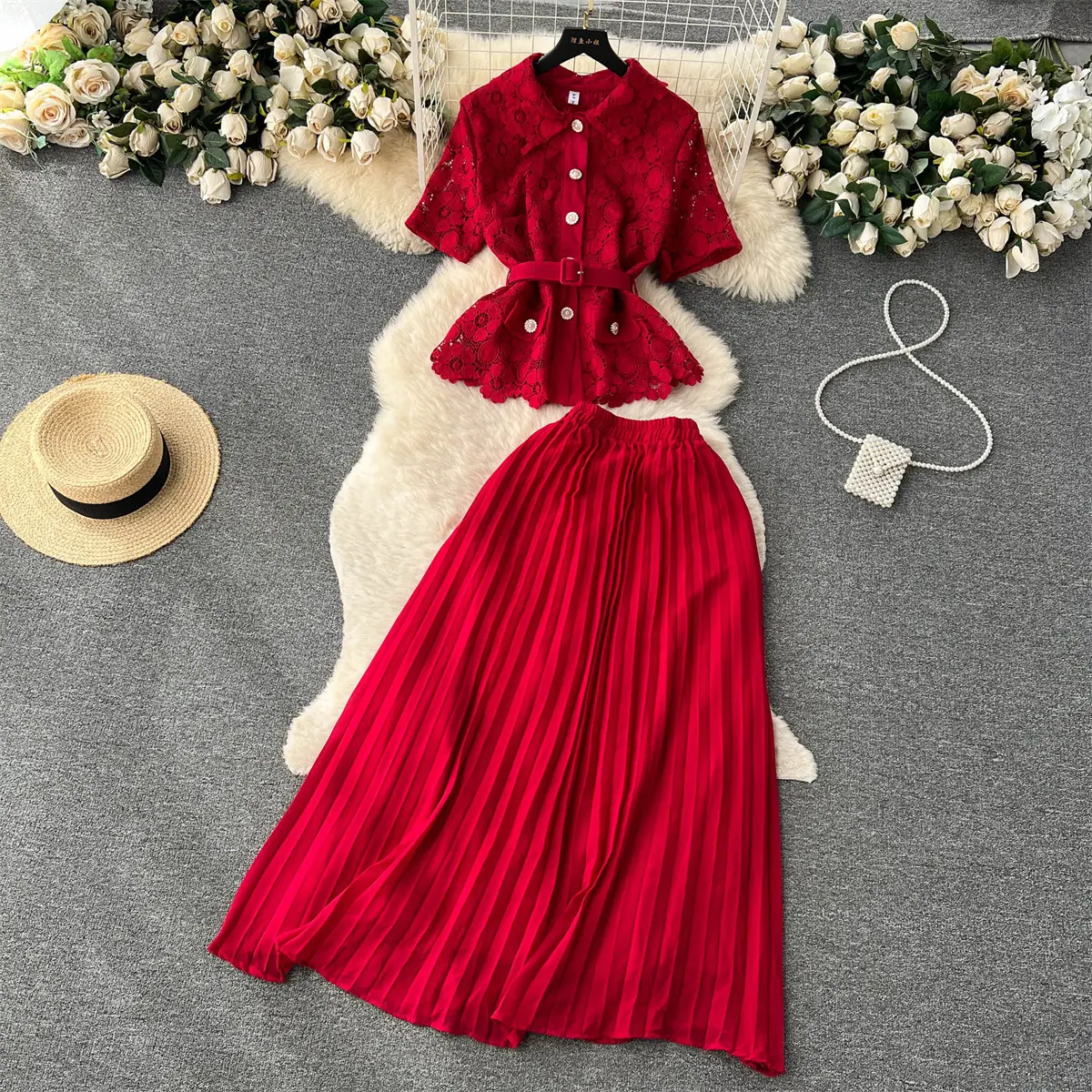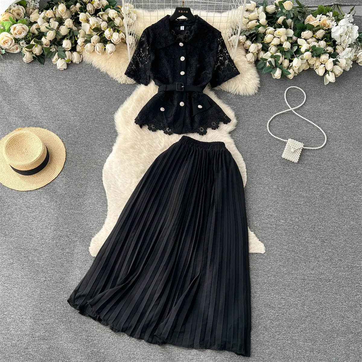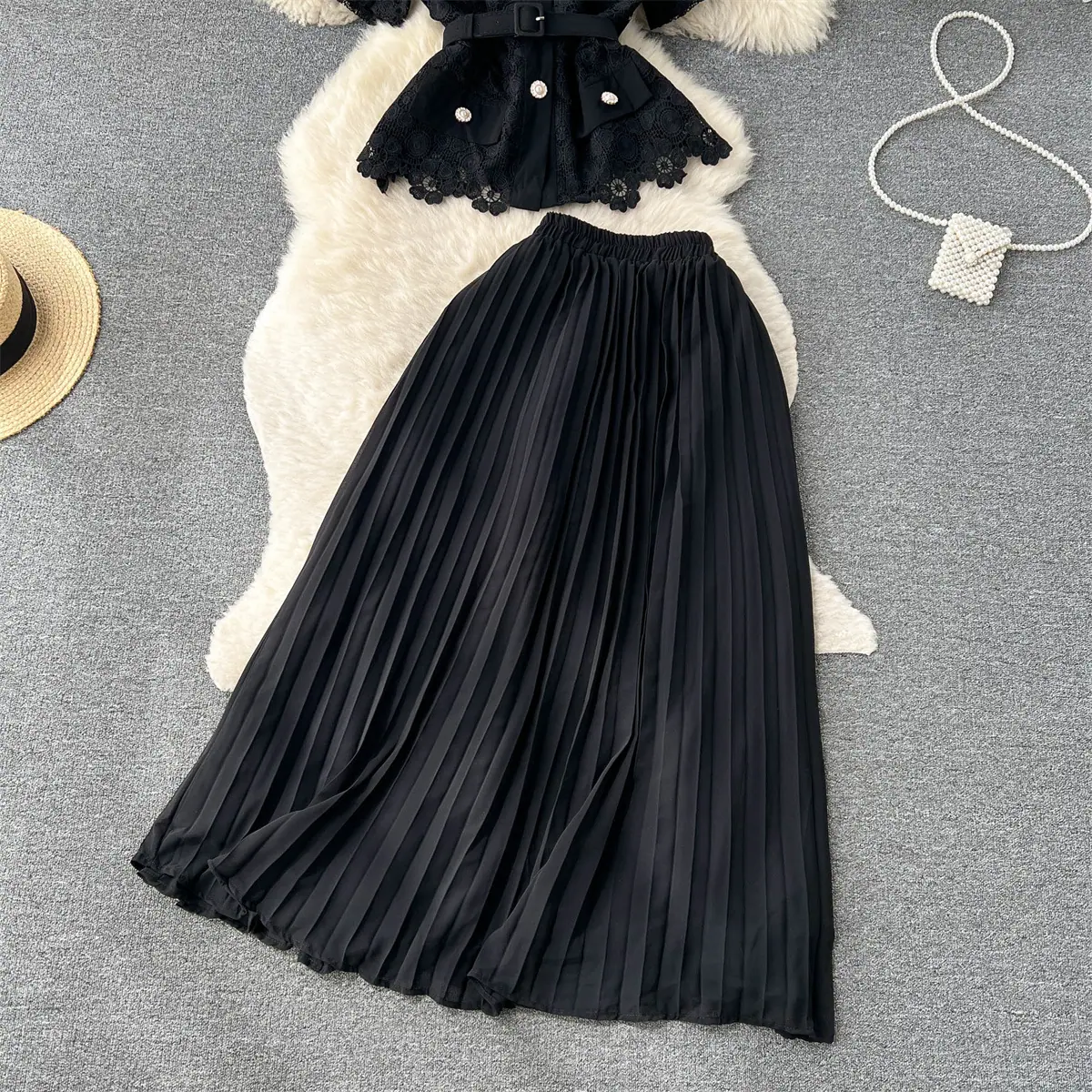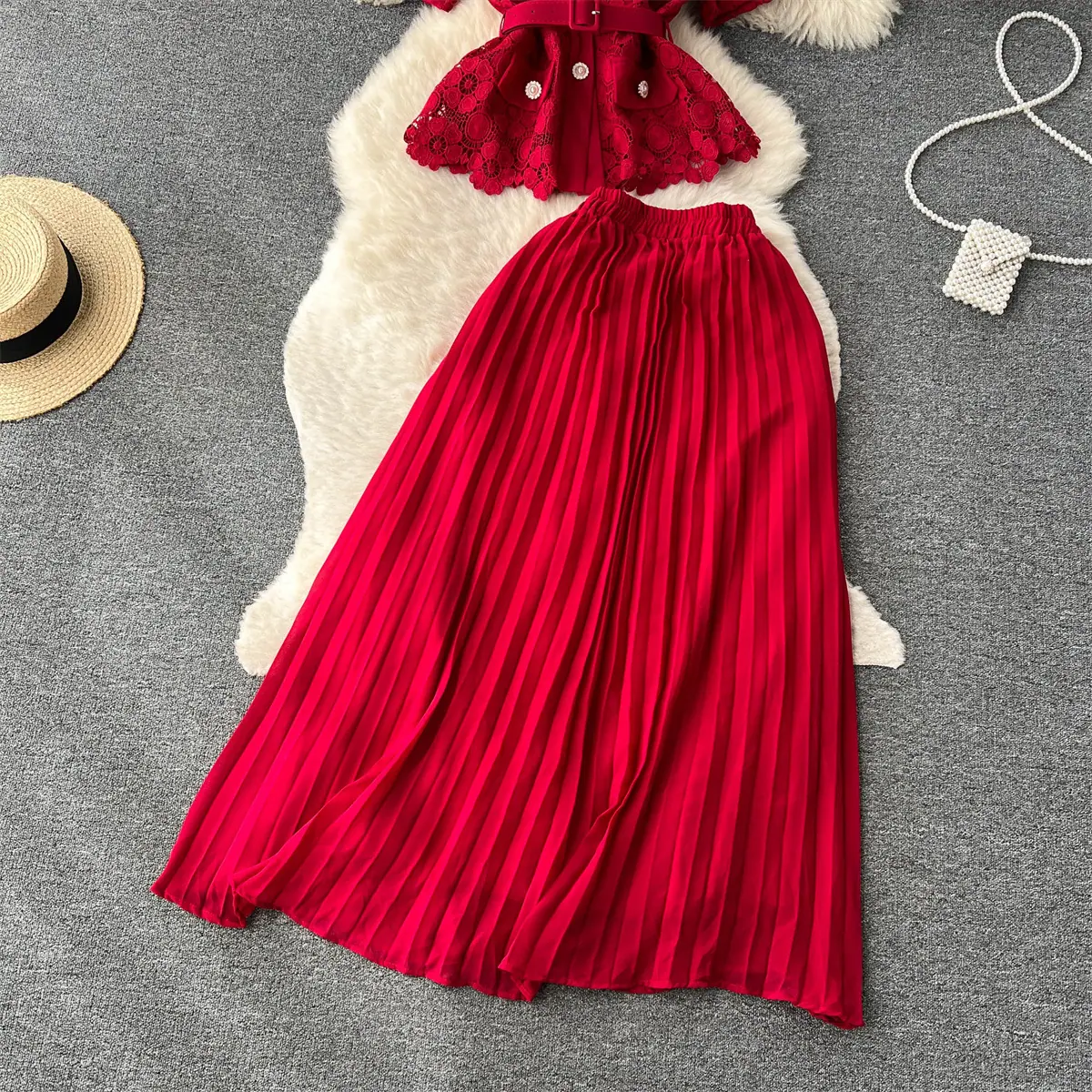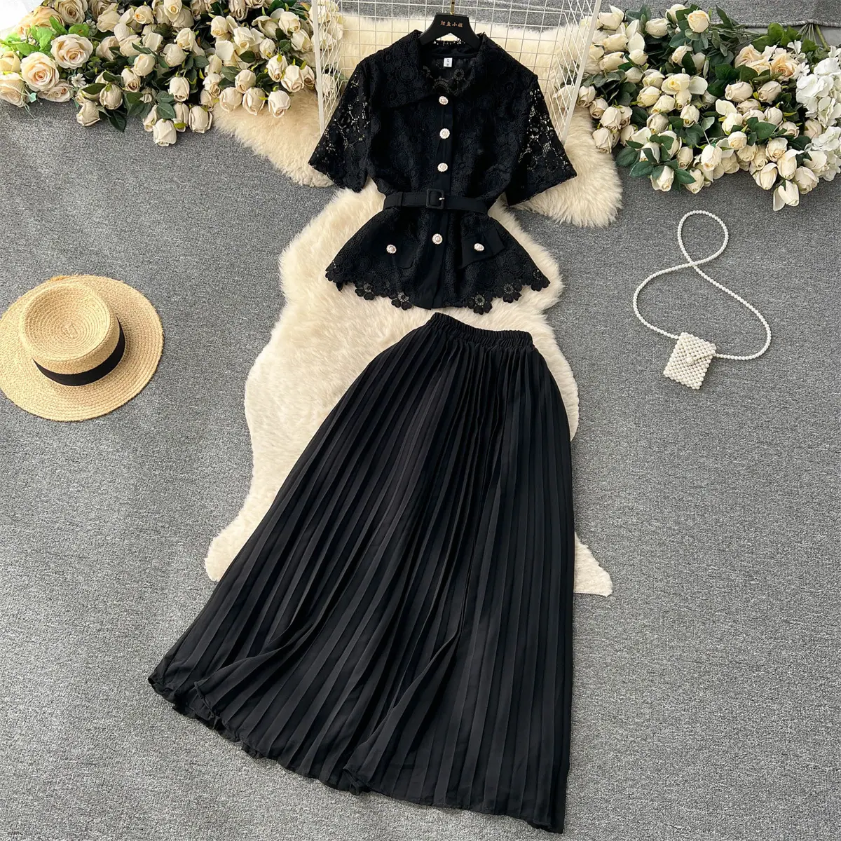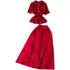Traje francés de alta gama para mujer, conjunto de dos piezas con solapa, manga corta, top ajustado y falda plisada de cintura alta.