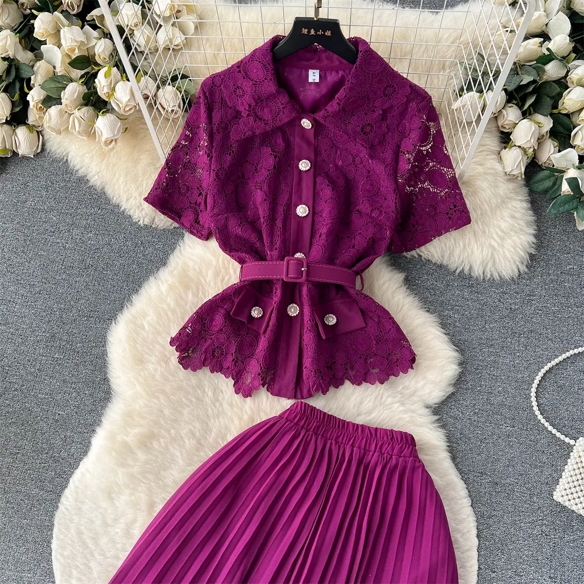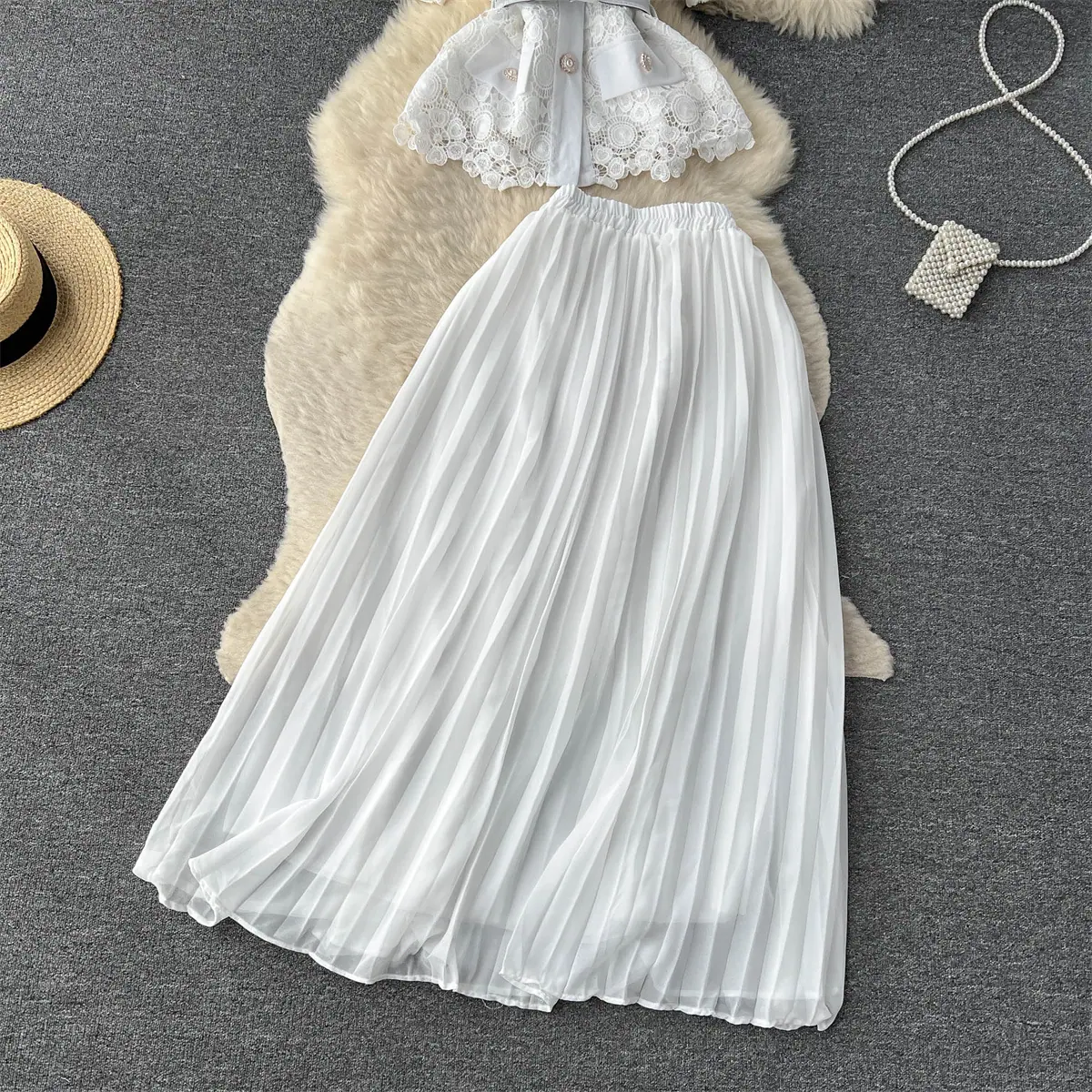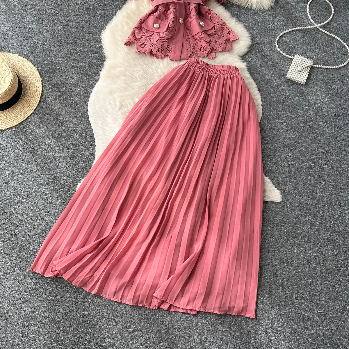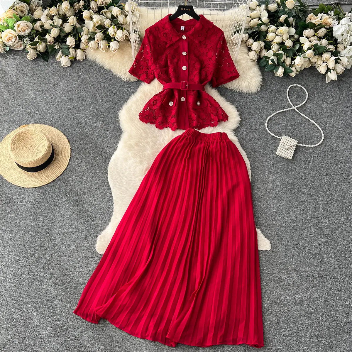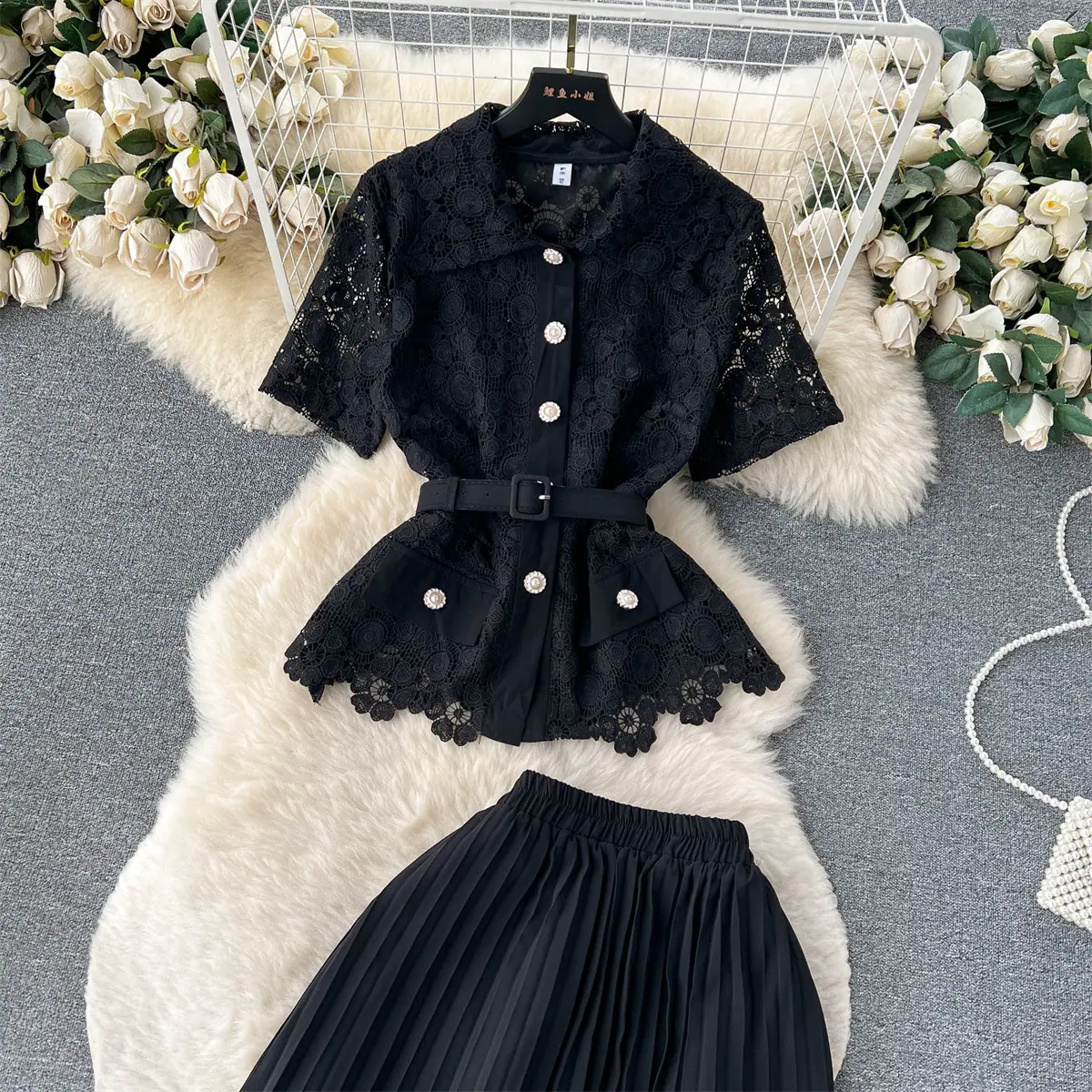 Traje francés de alta gama para mujer, conjunto de dos piezas con solapa, manga corta, top ajustado y falda plisada de cintura alta.