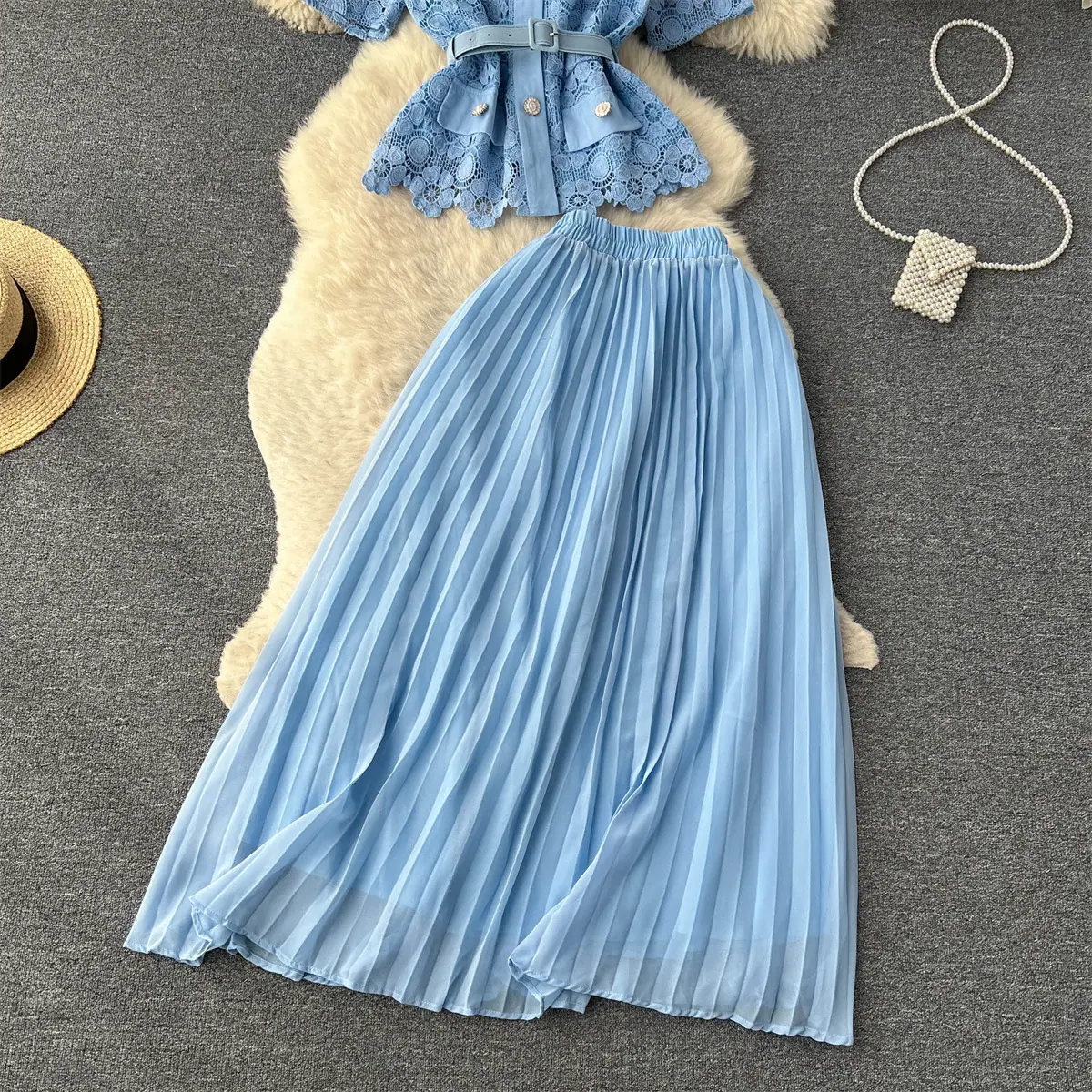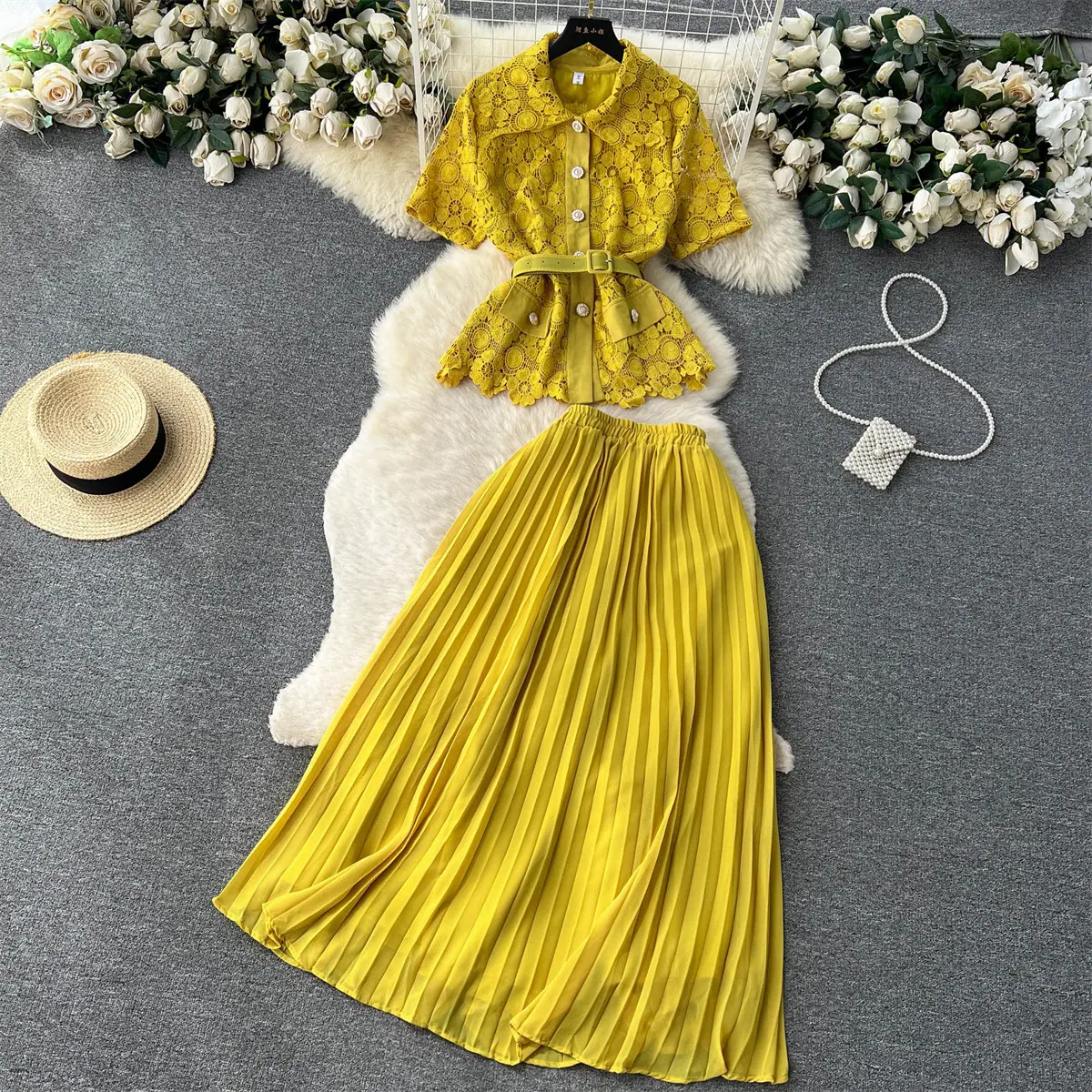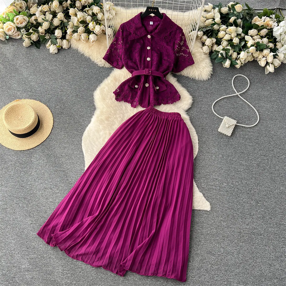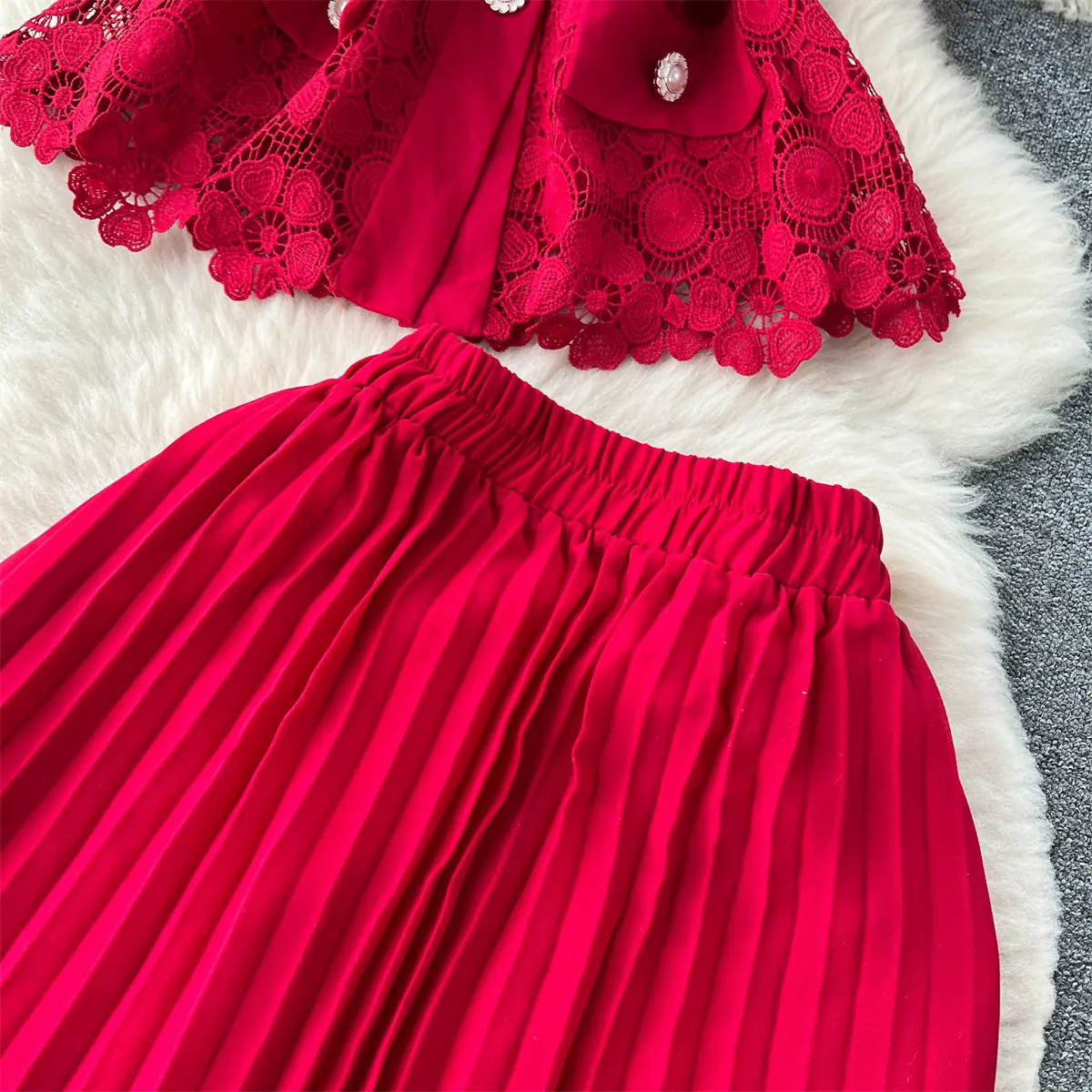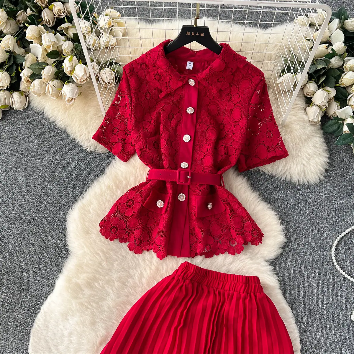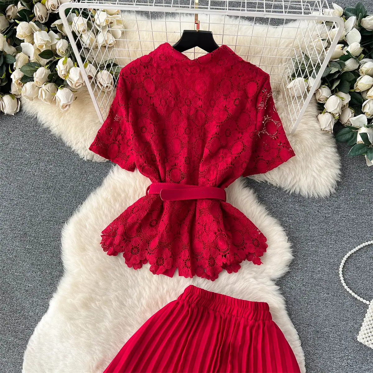 Traje francés de alta gama para mujer, conjunto de dos piezas con solapa, manga corta, top ajustado y falda plisada de cintura alta.