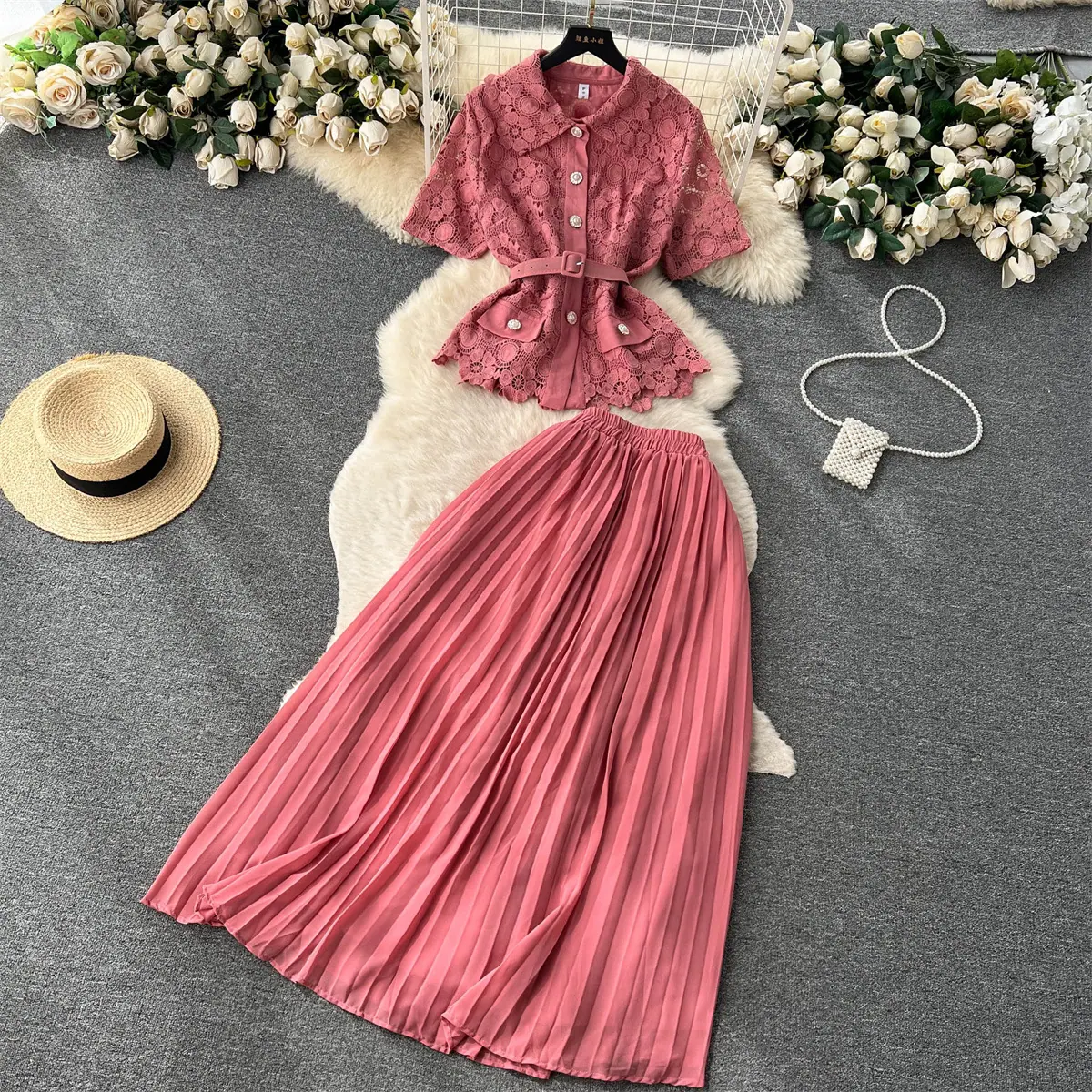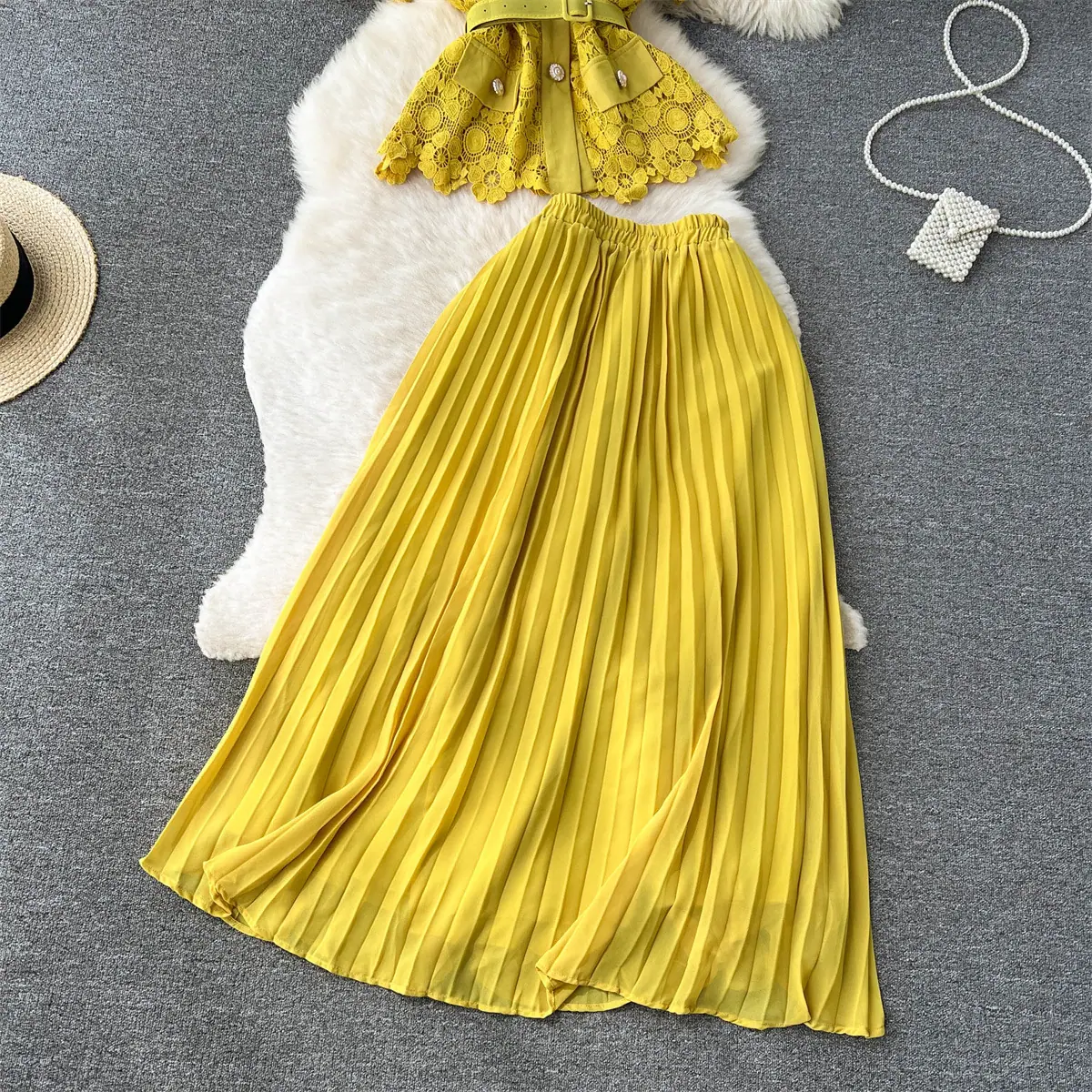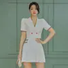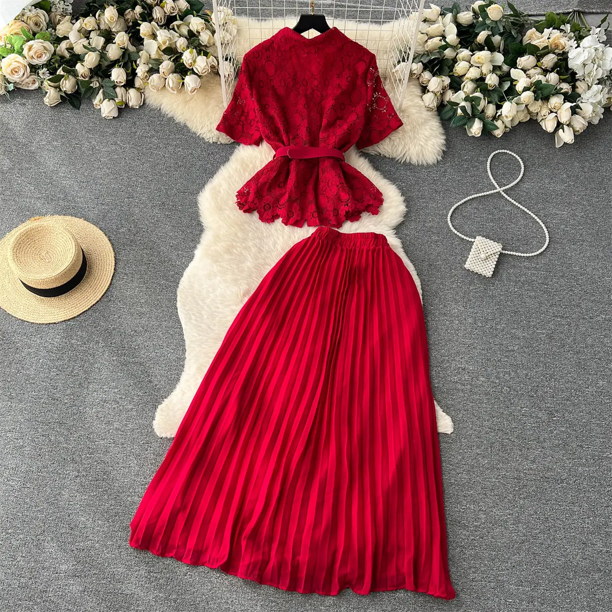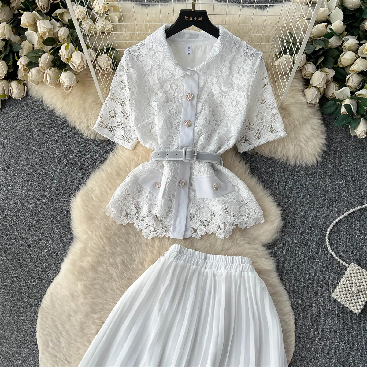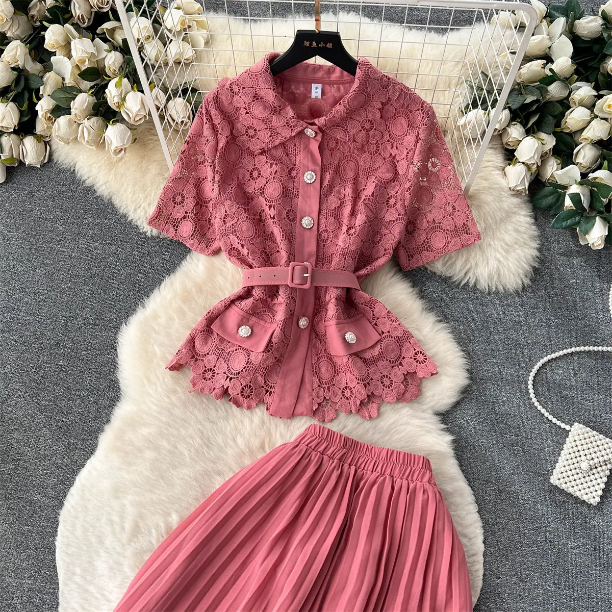 Traje francés de alta gama para mujer, conjunto de dos piezas con solapa, manga corta, top ajustado y falda plisada de cintura alta.