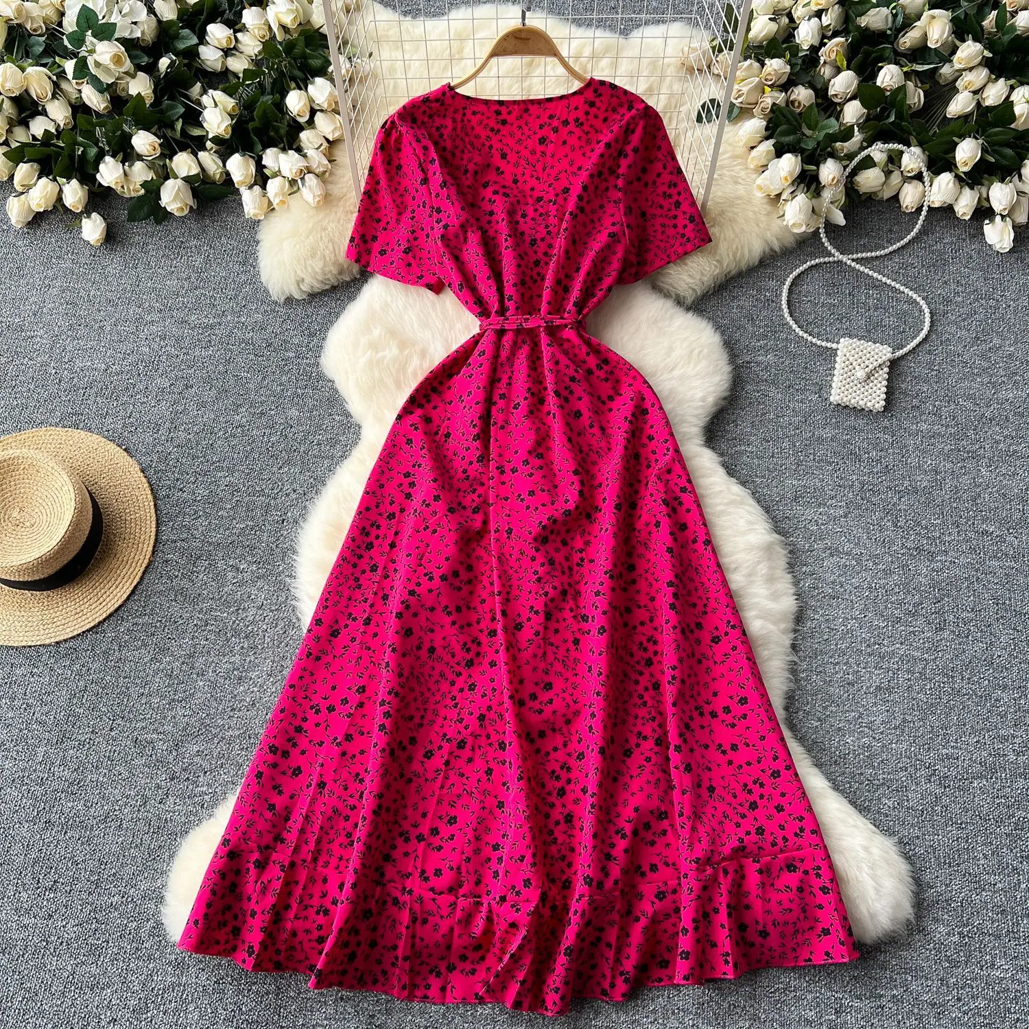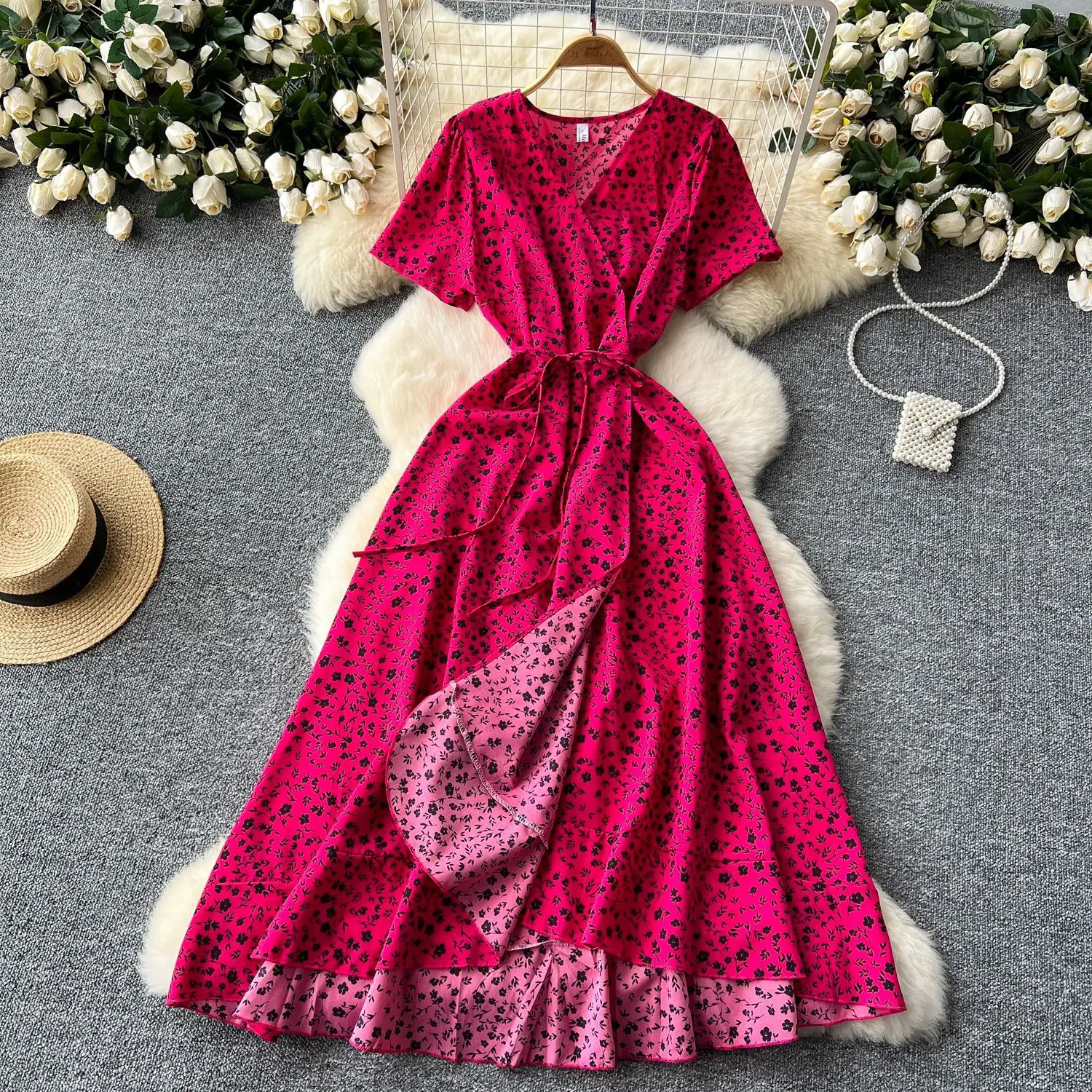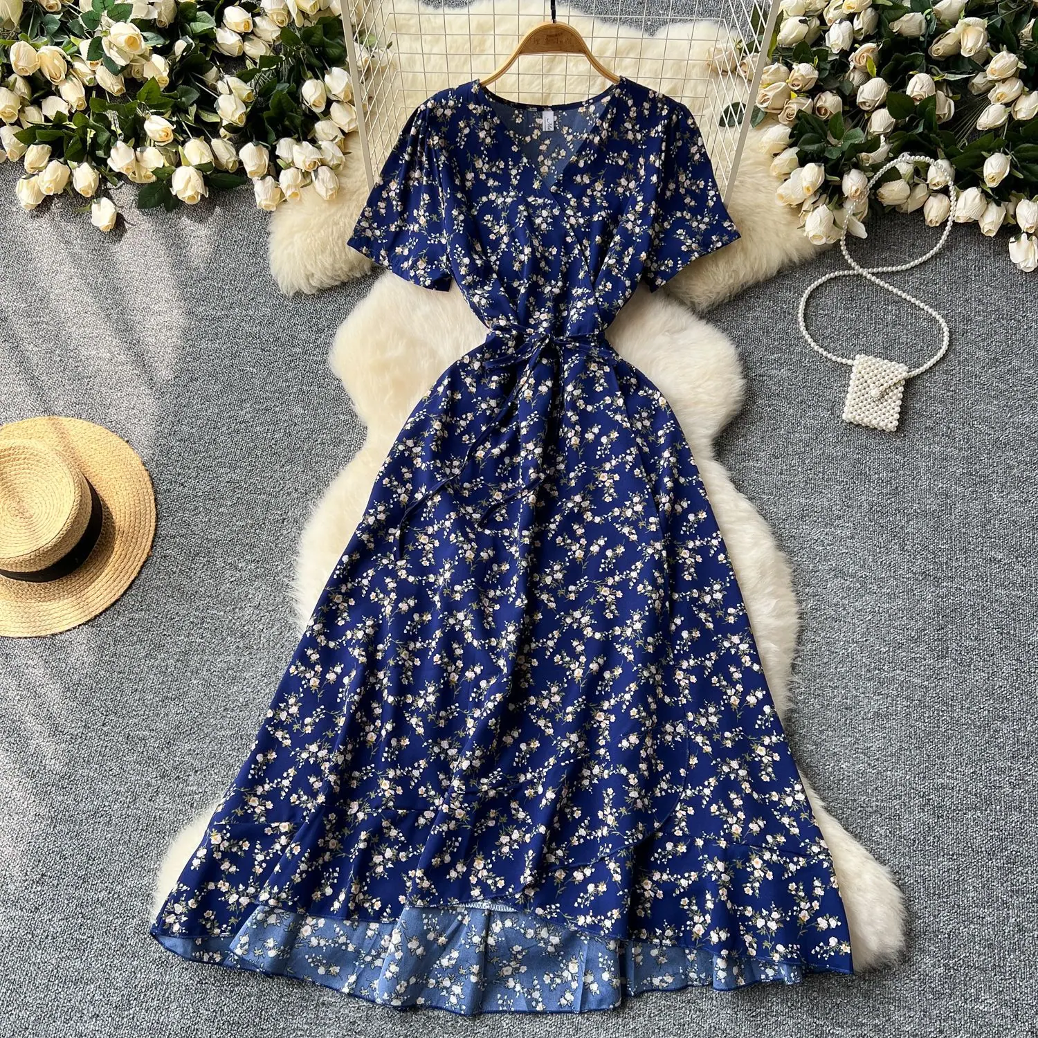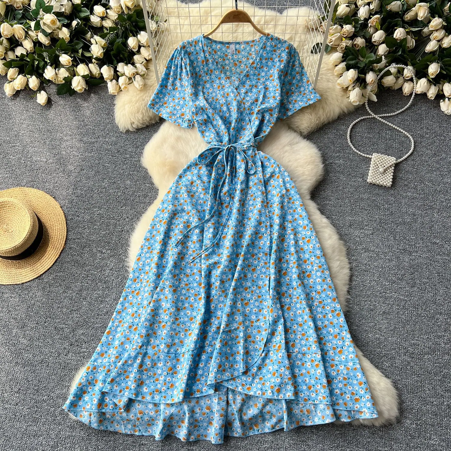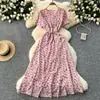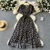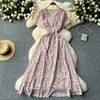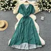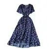 Vestido Floral de Verano para Mujer con Diseño de Una Pieza, Cuello en V, Cintura con Cordones, Manga Corta, Corte Adelgazante, Falda Larga Francesa