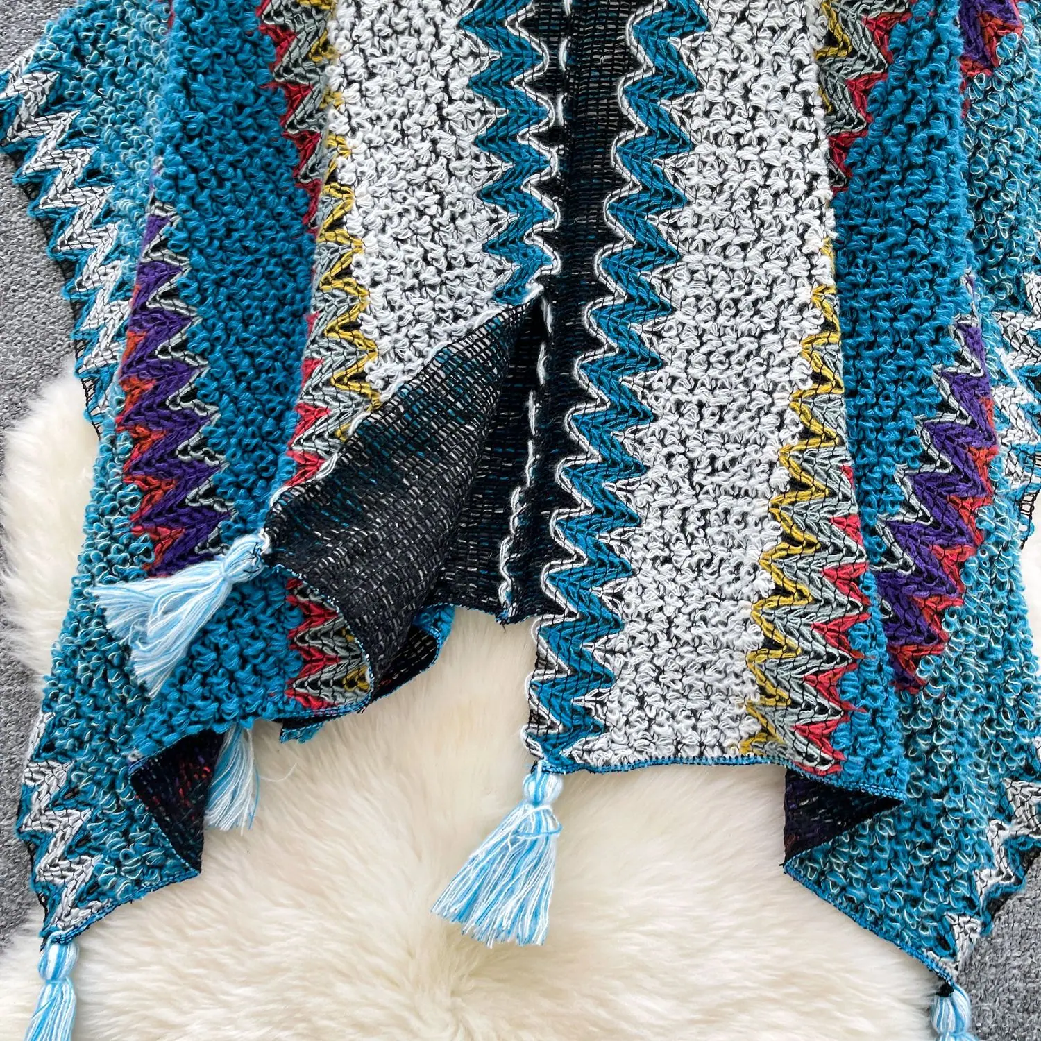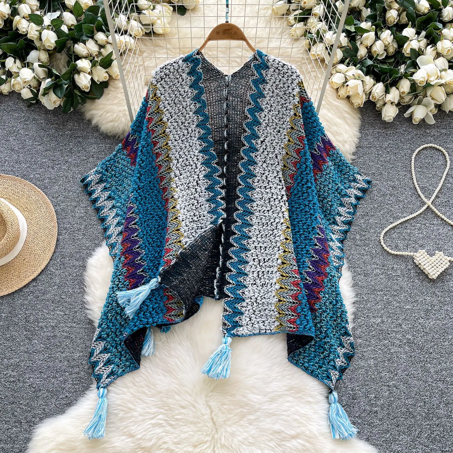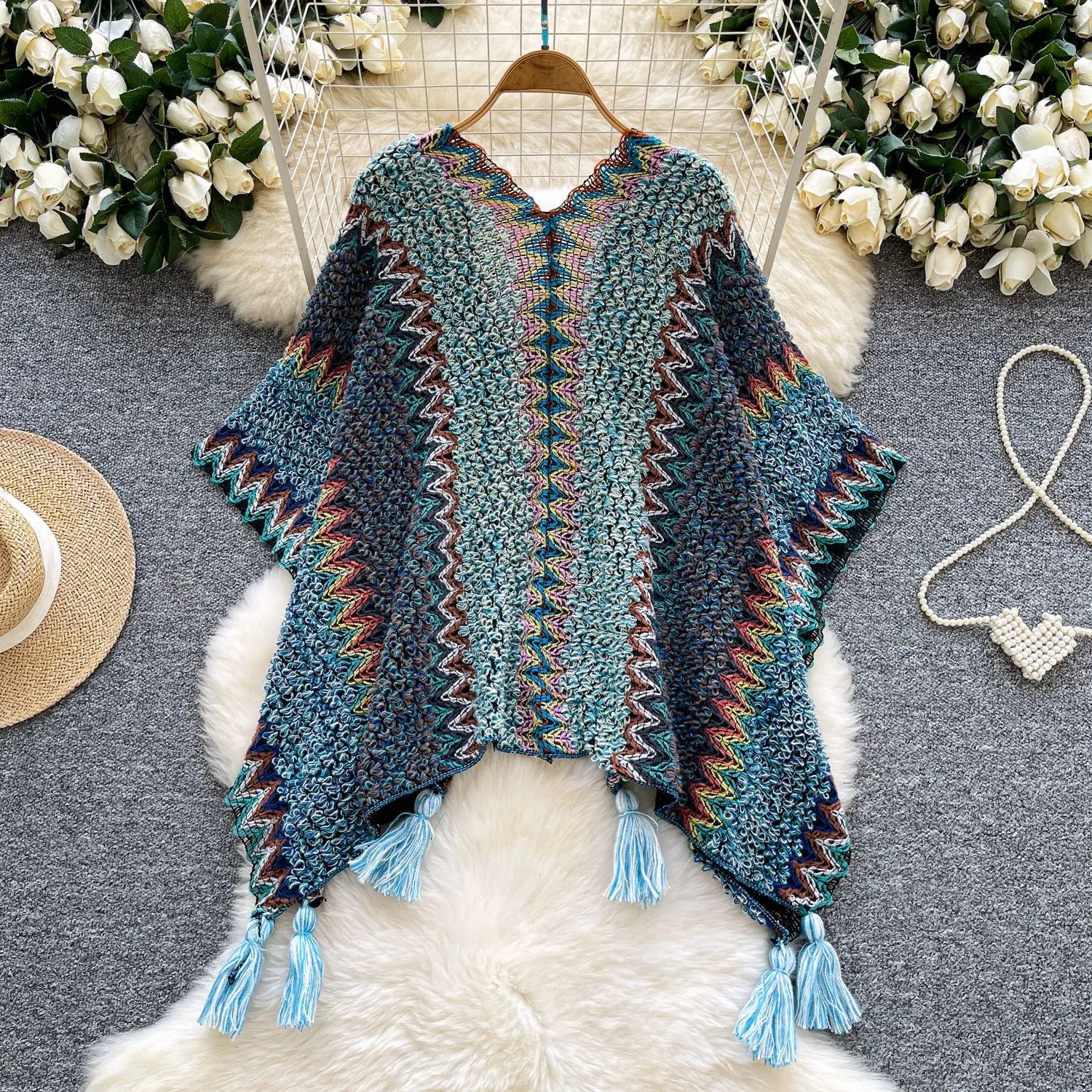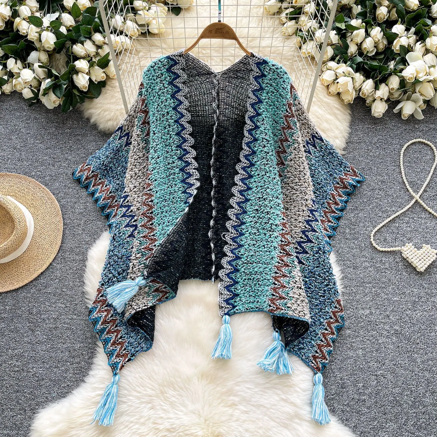 Traje de Vacaciones para Viaje Ropa Exterior Mujer 2025 Otoño Estilo Holgazán Suelto Irregular Colorido Crochet Flecos Prendas de Punto