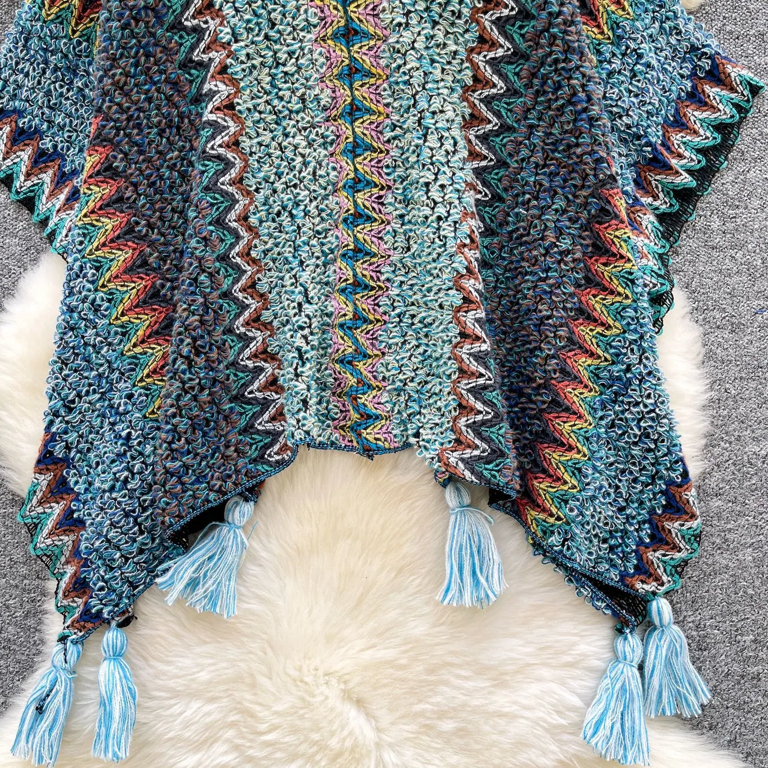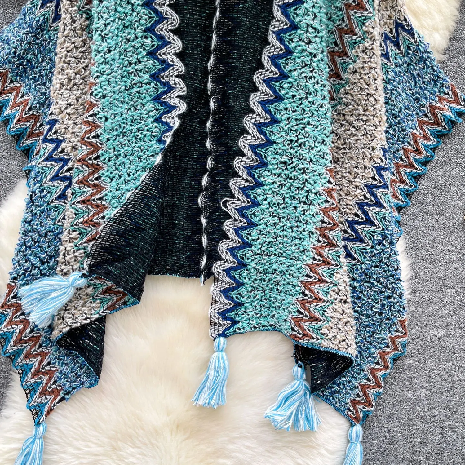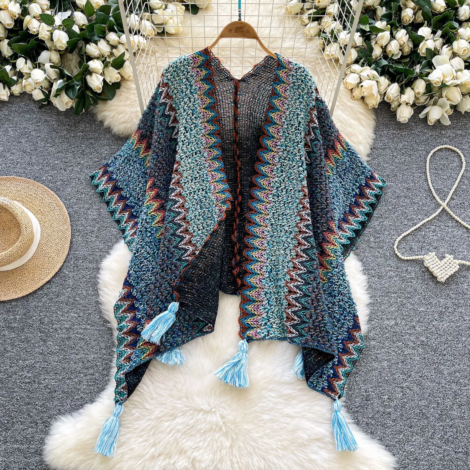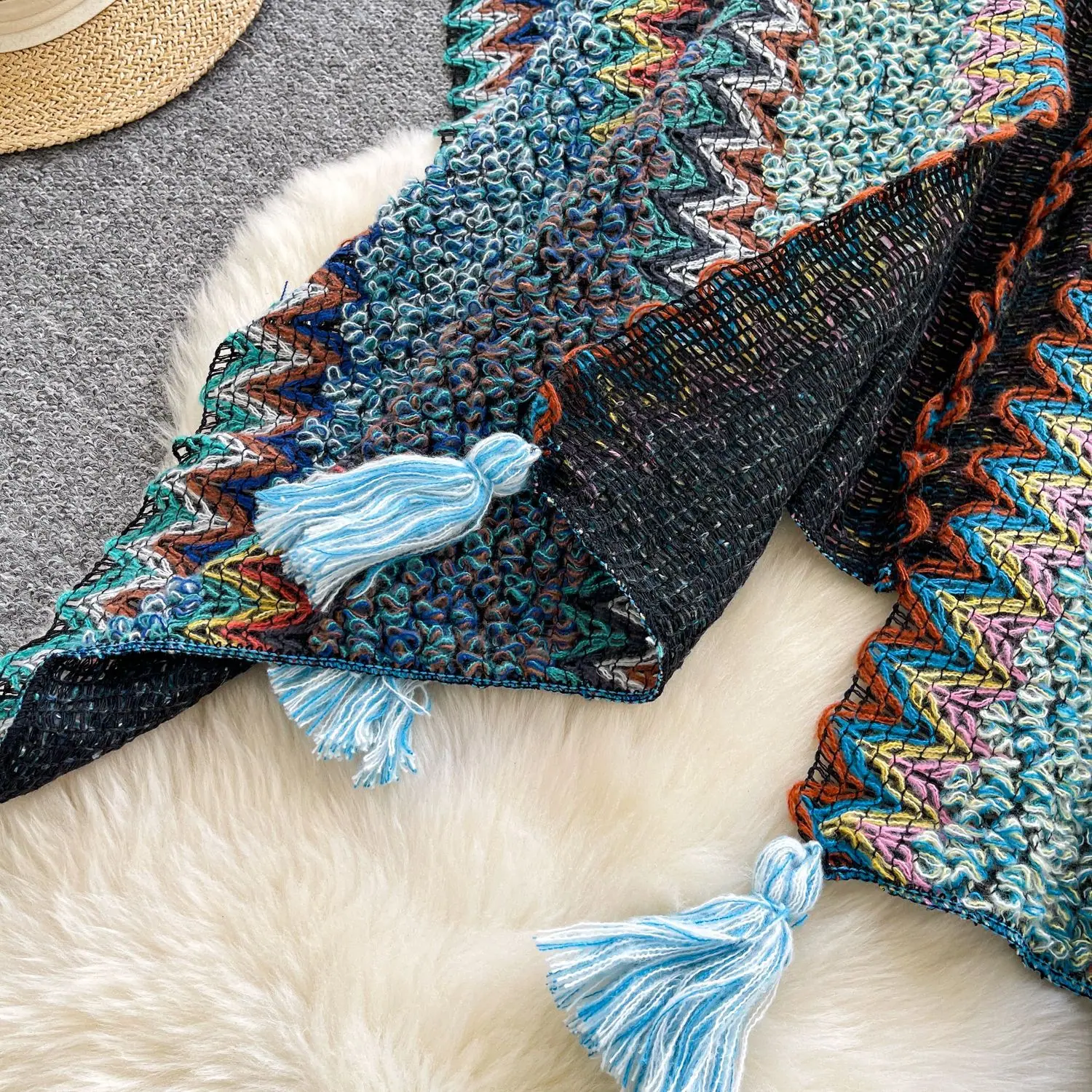Traje de Vacaciones para Viaje Ropa Exterior Mujer 2025 Otoño Estilo Holgazán Suelto Irregular Colorido Crochet Flecos Prendas de Punto