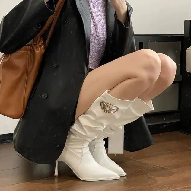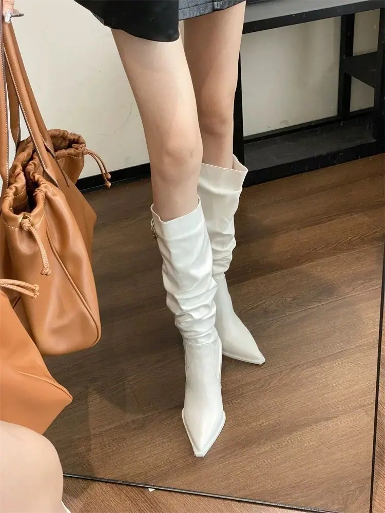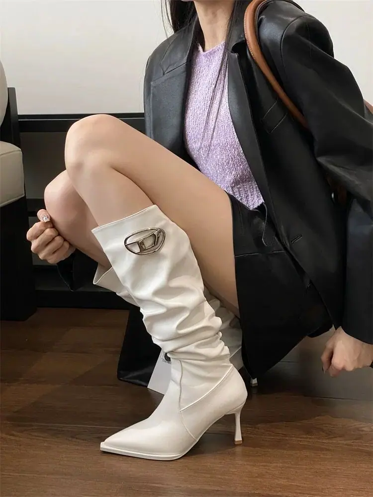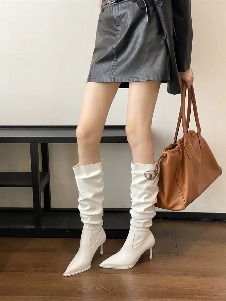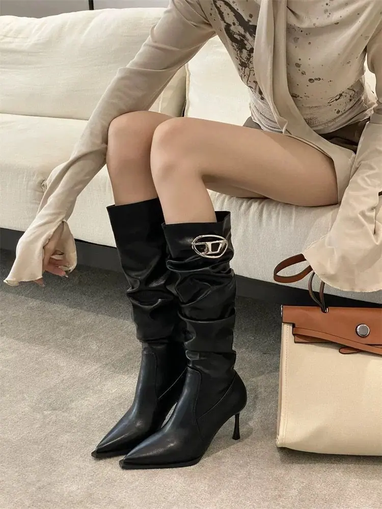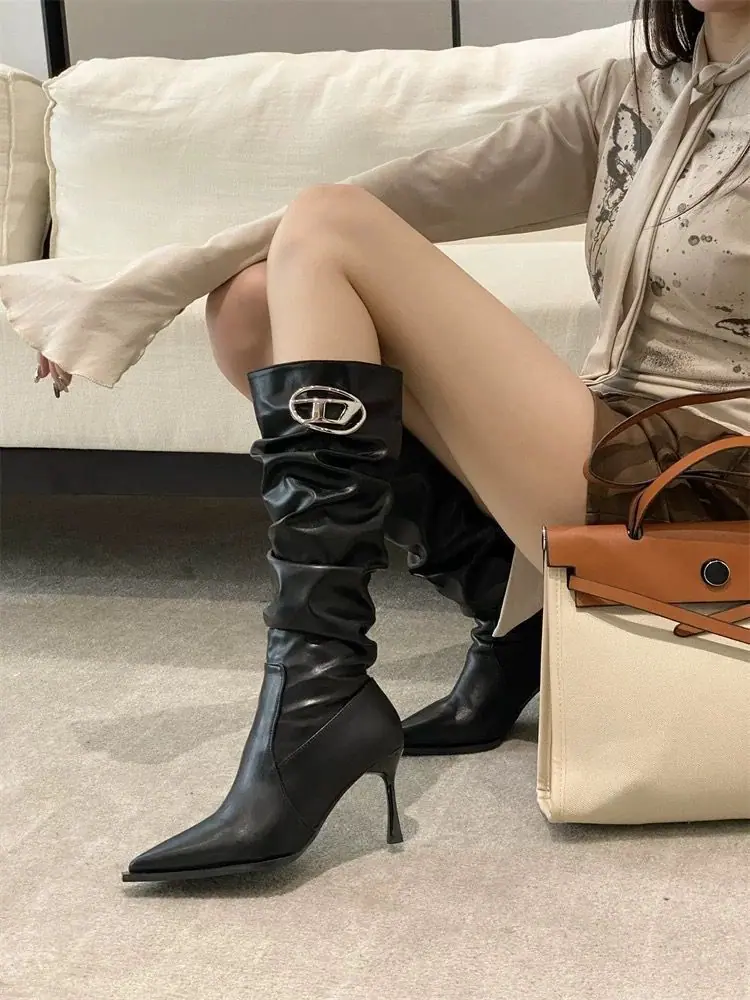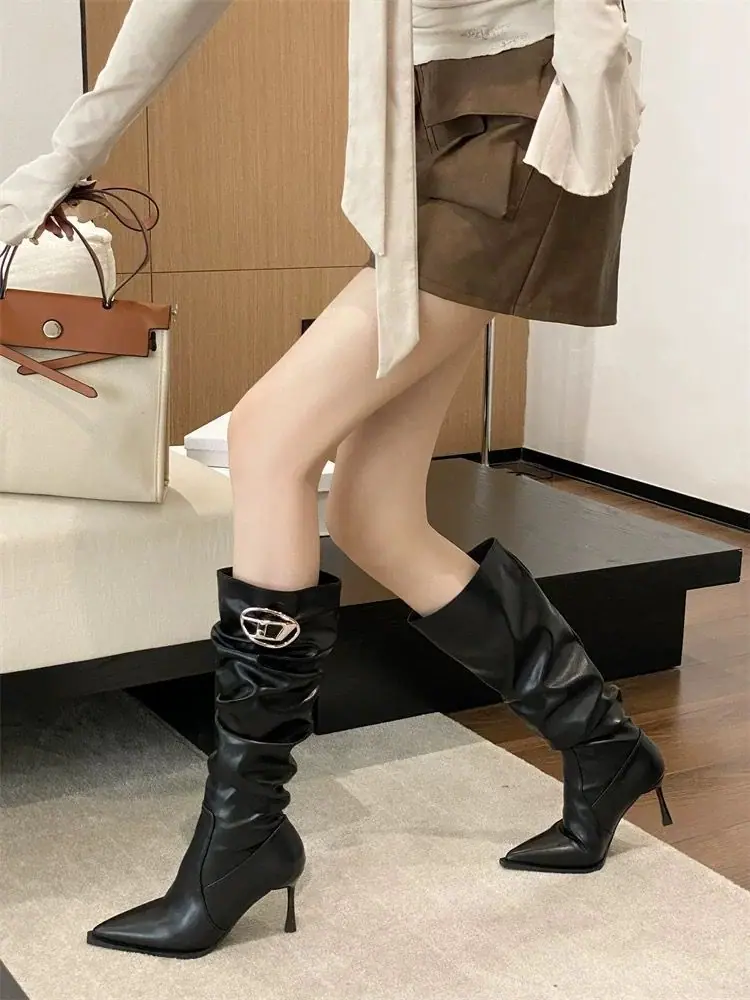 Otoño/Invierno 2025 Nuevas Botas Largas de Tacón de Aguja con Punta Afilada para Mujer Botas Slouch Botas Altas por Encima de la Rodilla Caña Alta Tacón Alto Botas Largas para Mujer
