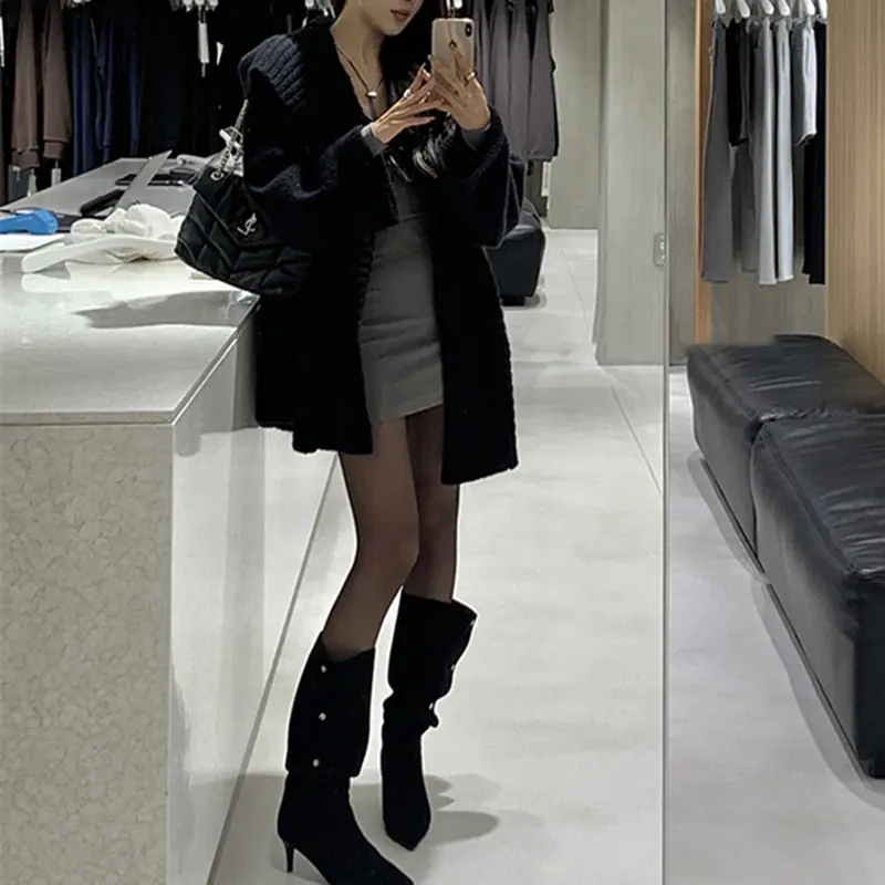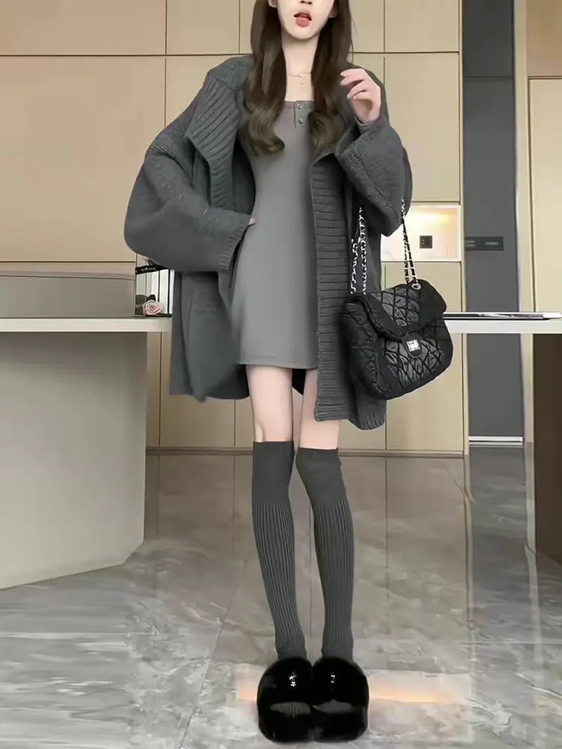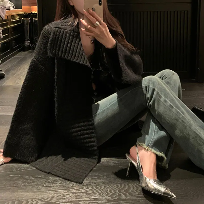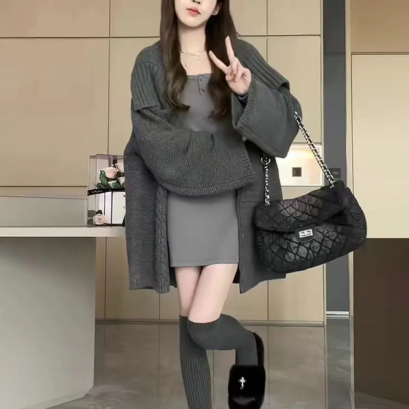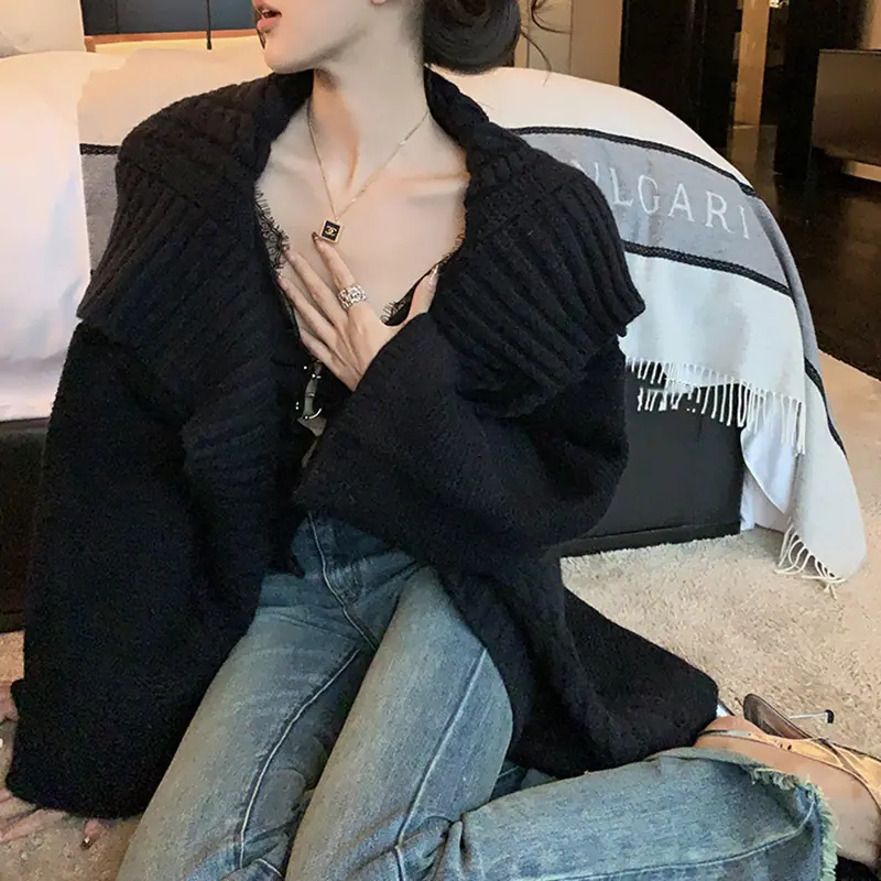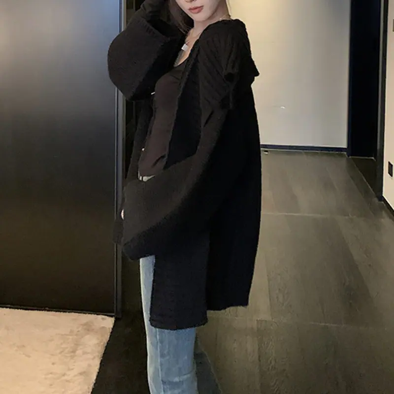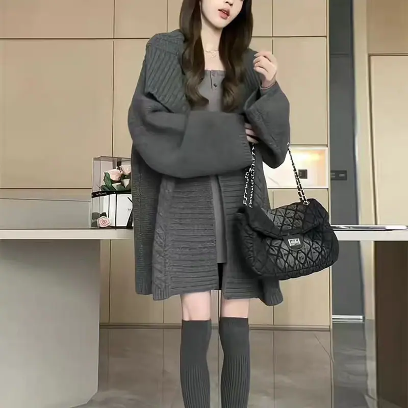 Abrigo suéter de largo medio estilo francés perezoso para mujer otoño e invierno 2025 nuevo cárdigan de punto holgado