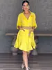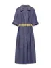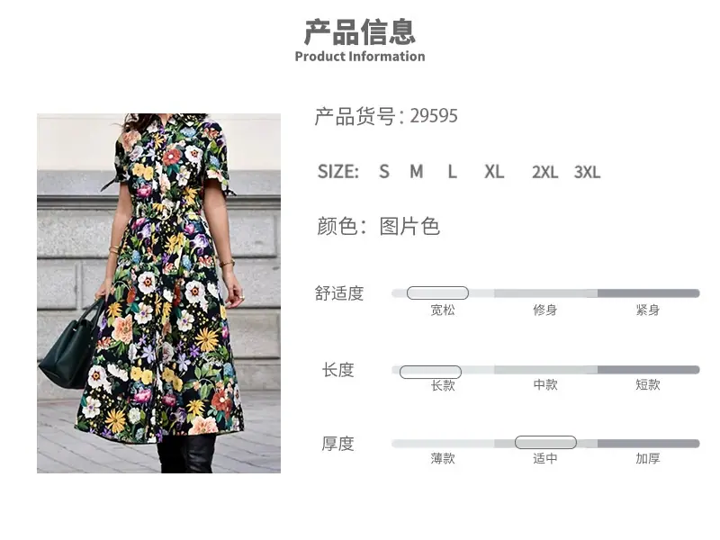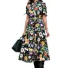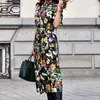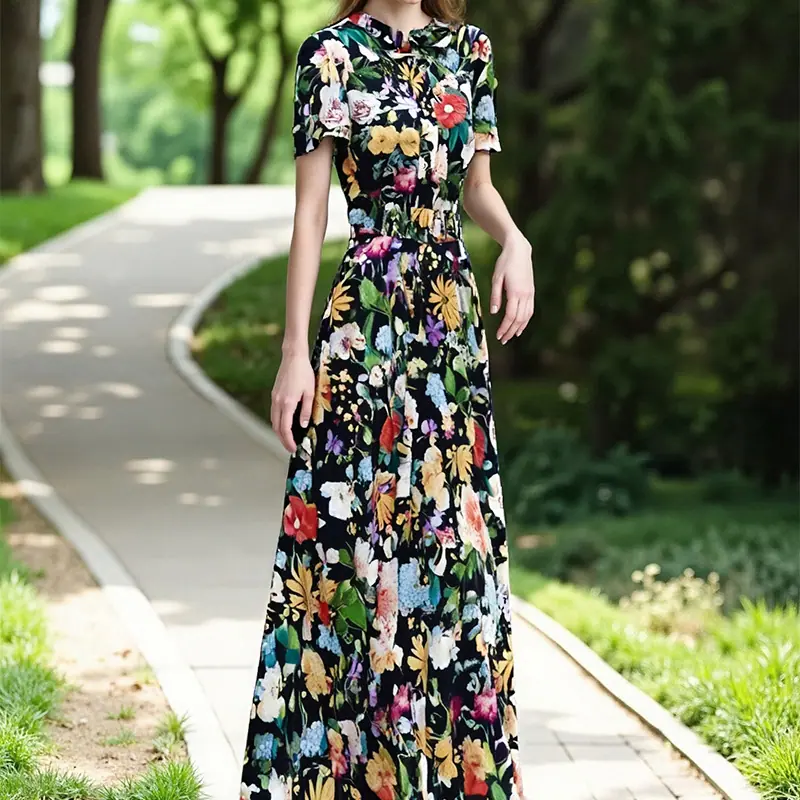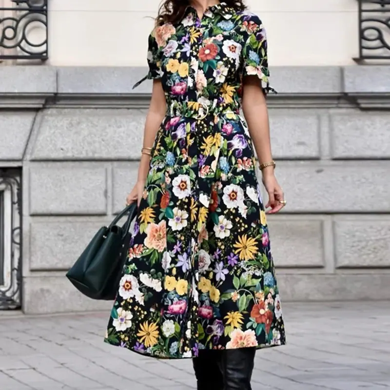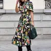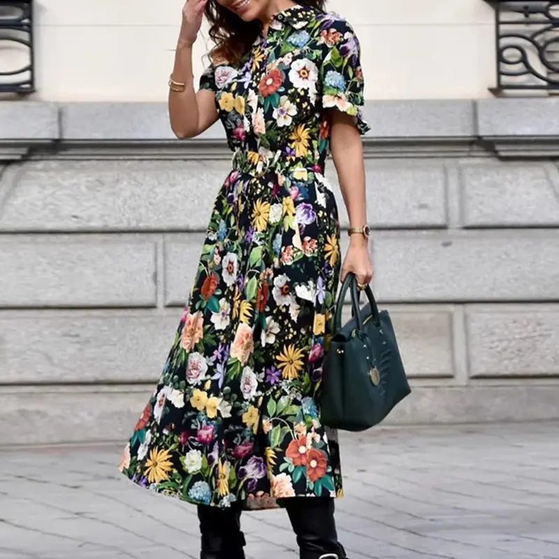 Comercio exterior transfronterizo 2025 otoño nuevo estilo europeo y americano ropa de mujer estampado floral cuello vuelto manga corta vestido midi falda larga