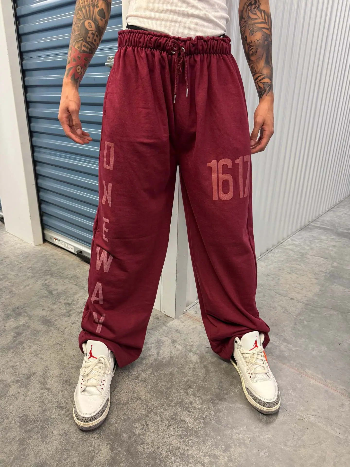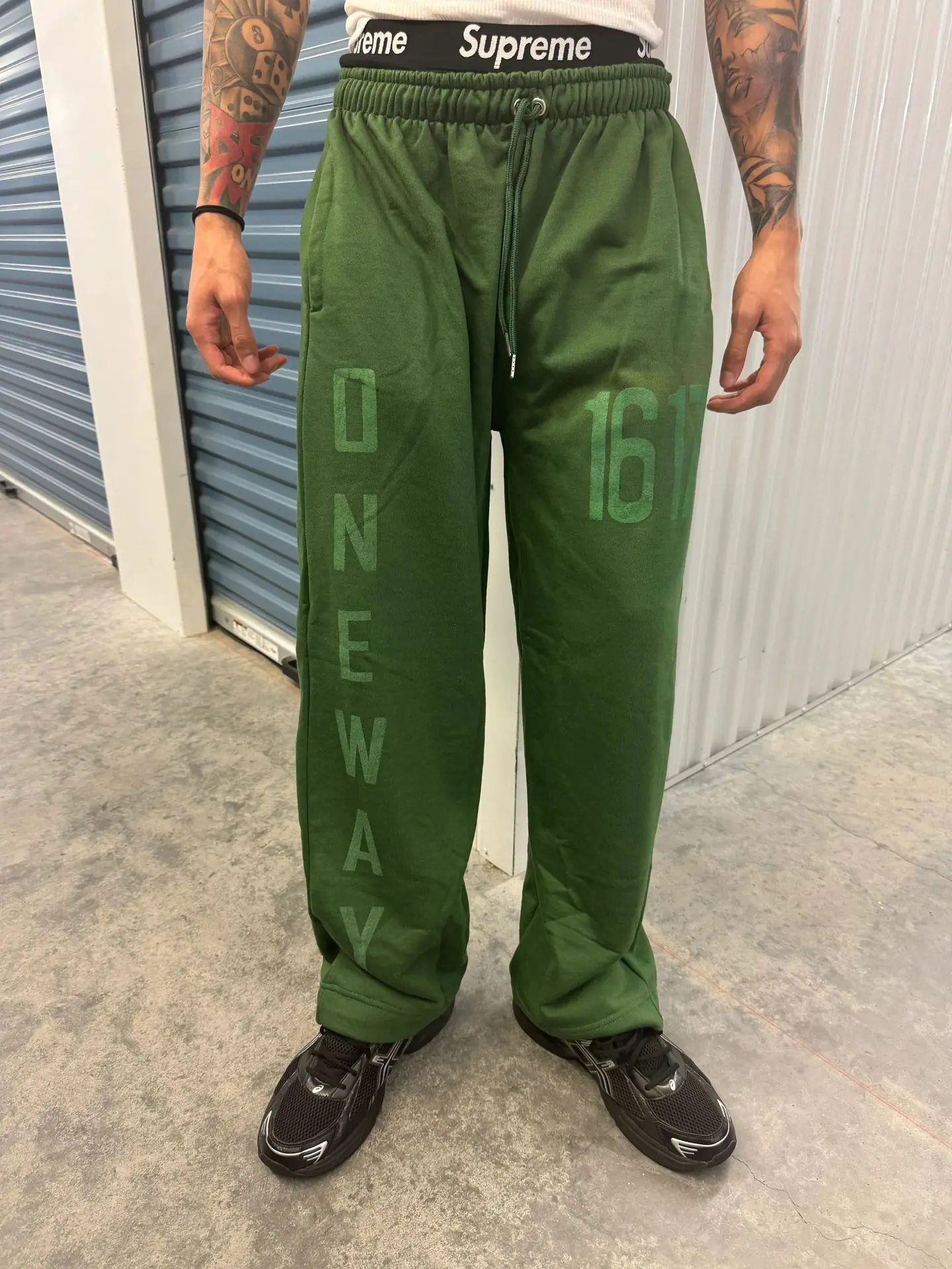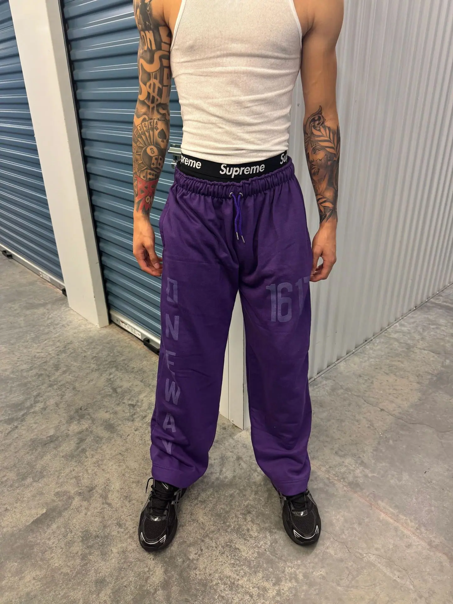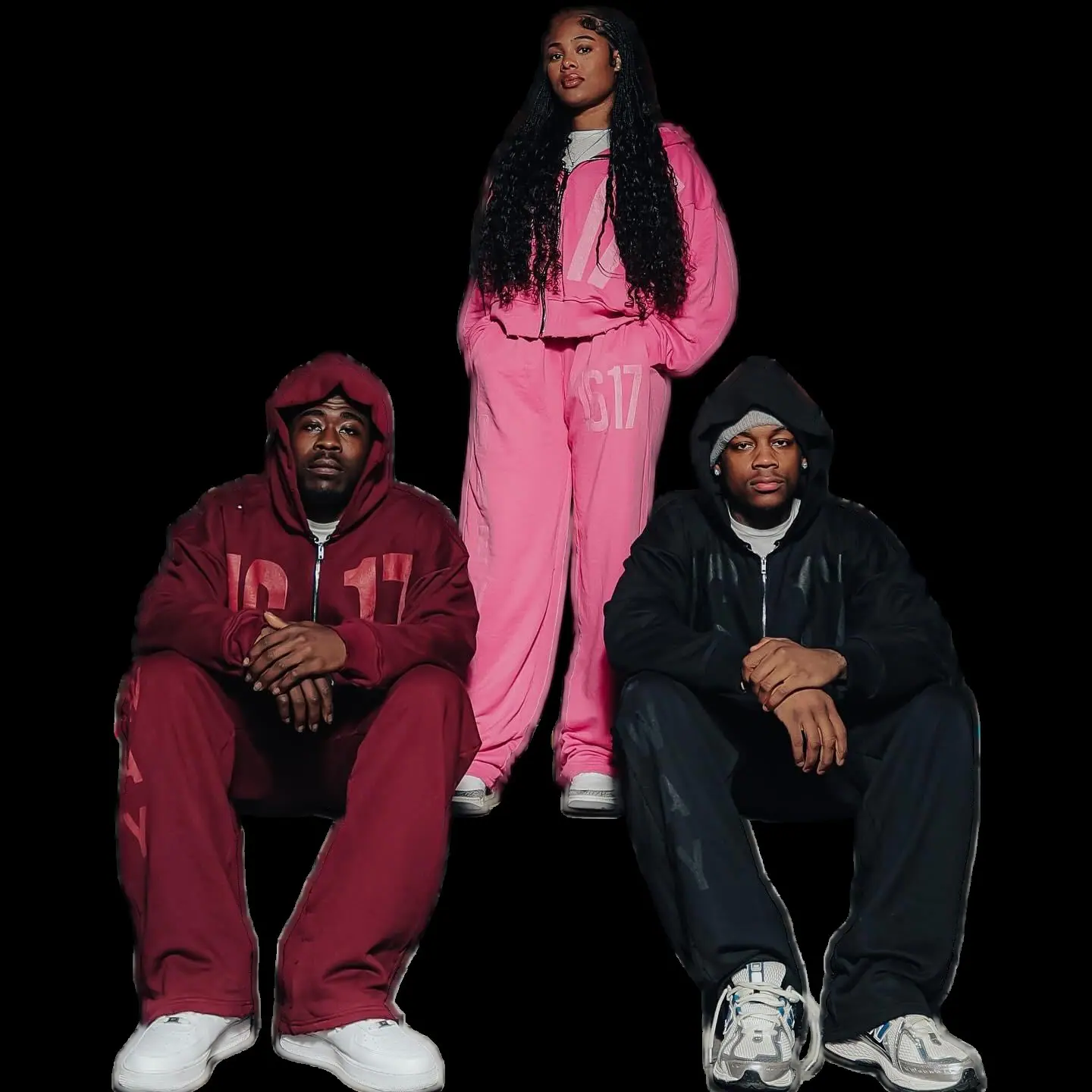 green sweatshirt, Grey sweatshirt, Red sweatshirt, Purple sweatshirt, Green trousers, Grey trousers, Red trous...