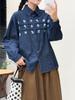 Camisa de Mezclilla de Manga Larga con Solapa Bordada de Flores Vintage de Primavera para Mujer, Holgada, Casual, Combinable, Chaqueta Cárdigan