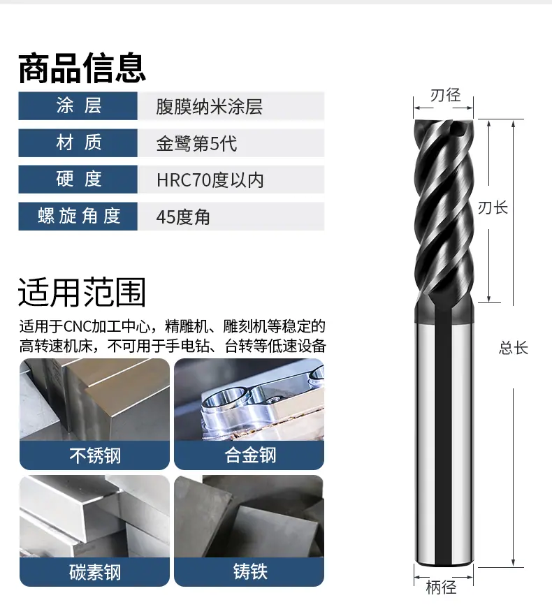 Fresa de acero de tungsteno de 55 grados, fresa de carburo de 4 hojas, fresa de base plana revestida, fresa extendida de alta dureza, fresa de extremo CNC