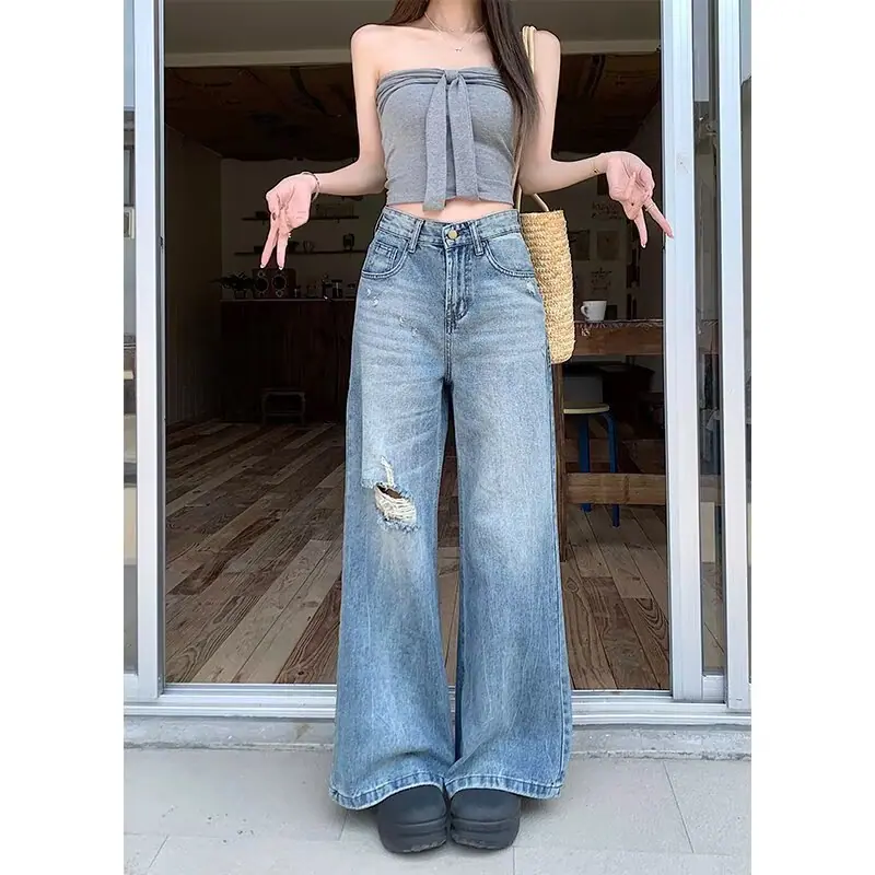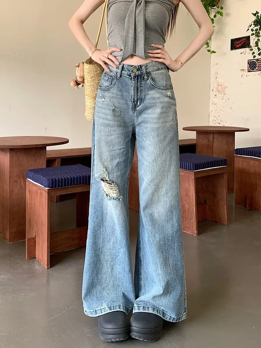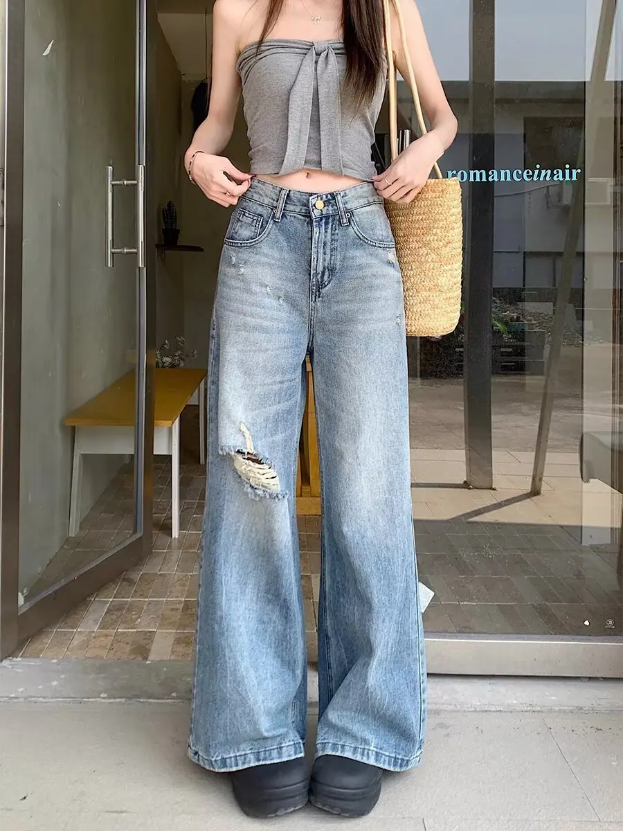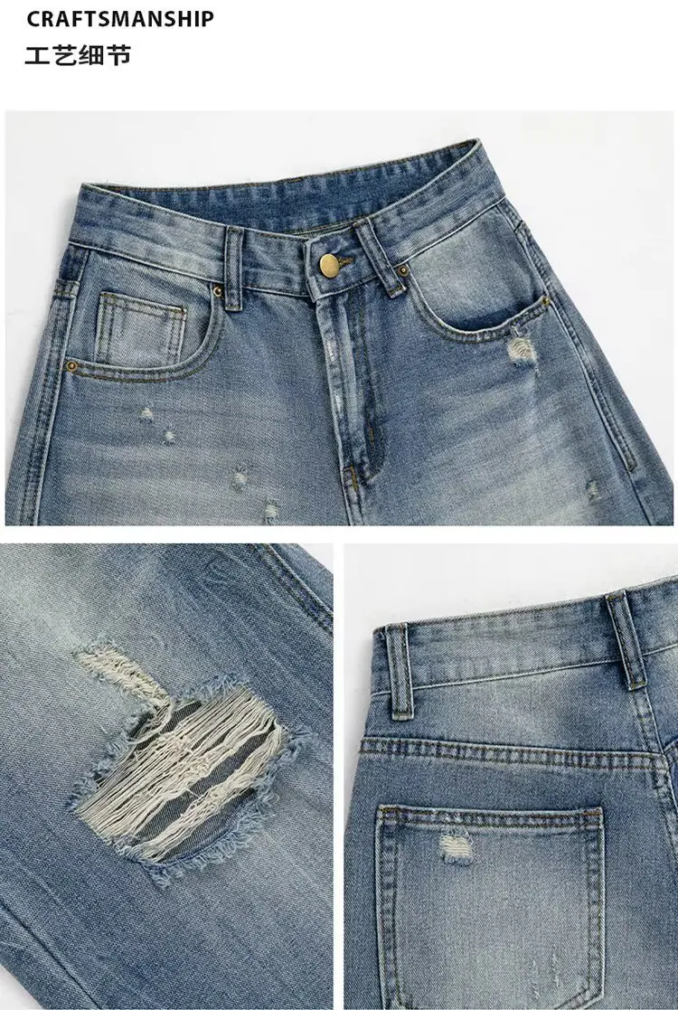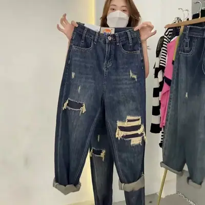 Pantalones vaqueros rasgados de papá para mujer, de primavera y otoño, de cintura alta, holgados, con forma de pera pequeña.