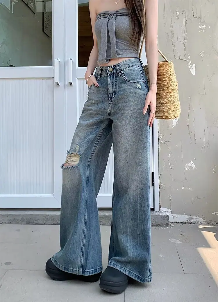 Jeans holgados de pierna ancha de talle alto negro-gris para mujer verano 2025 nuevo estilo adelgazantes retro de pierna recta siete puntos pantalones medios modernos