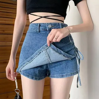 Shorts de mezclilla retro mujer 2025 verano delgados cintura alta sueltos versátiles adelgazantes petite línea A pierna ancha pantalones cortos