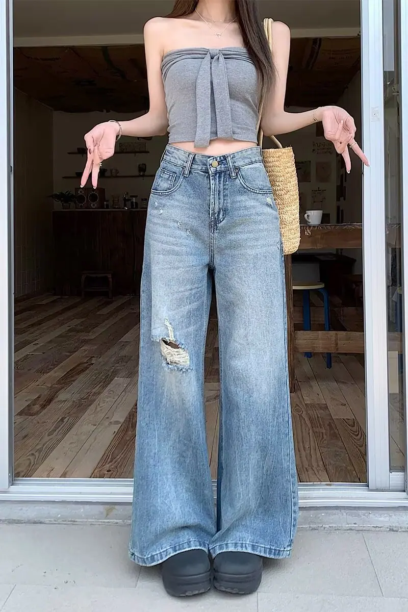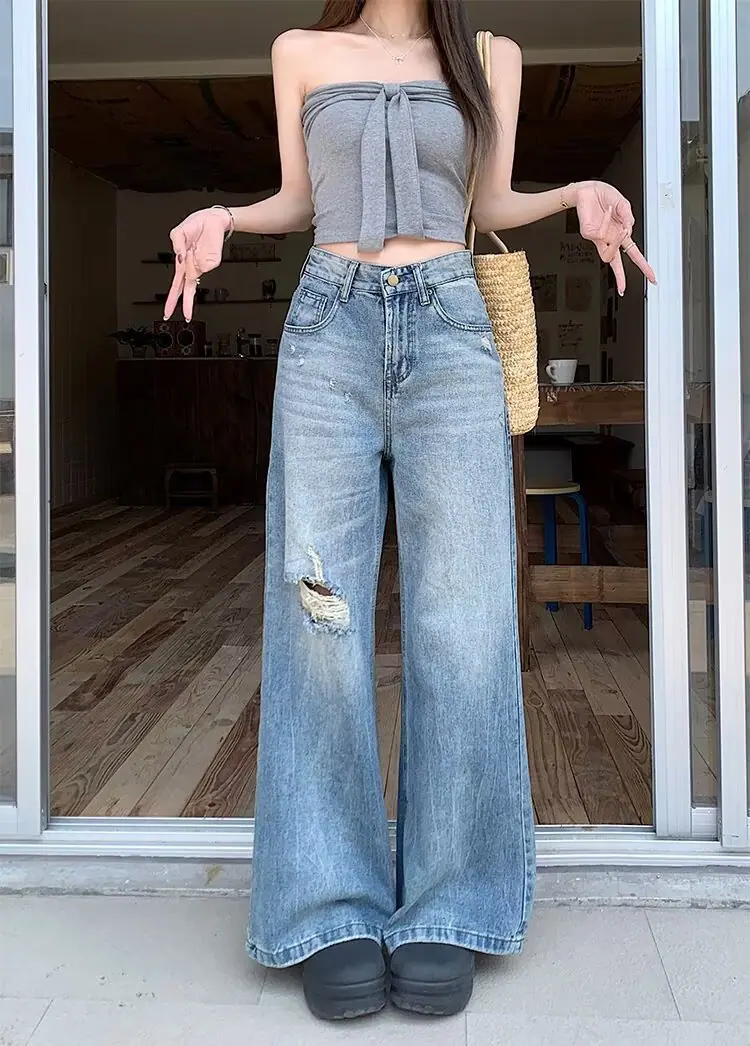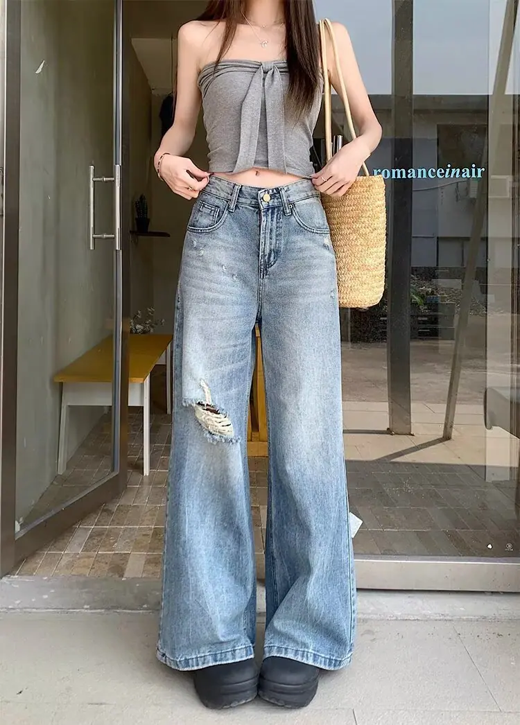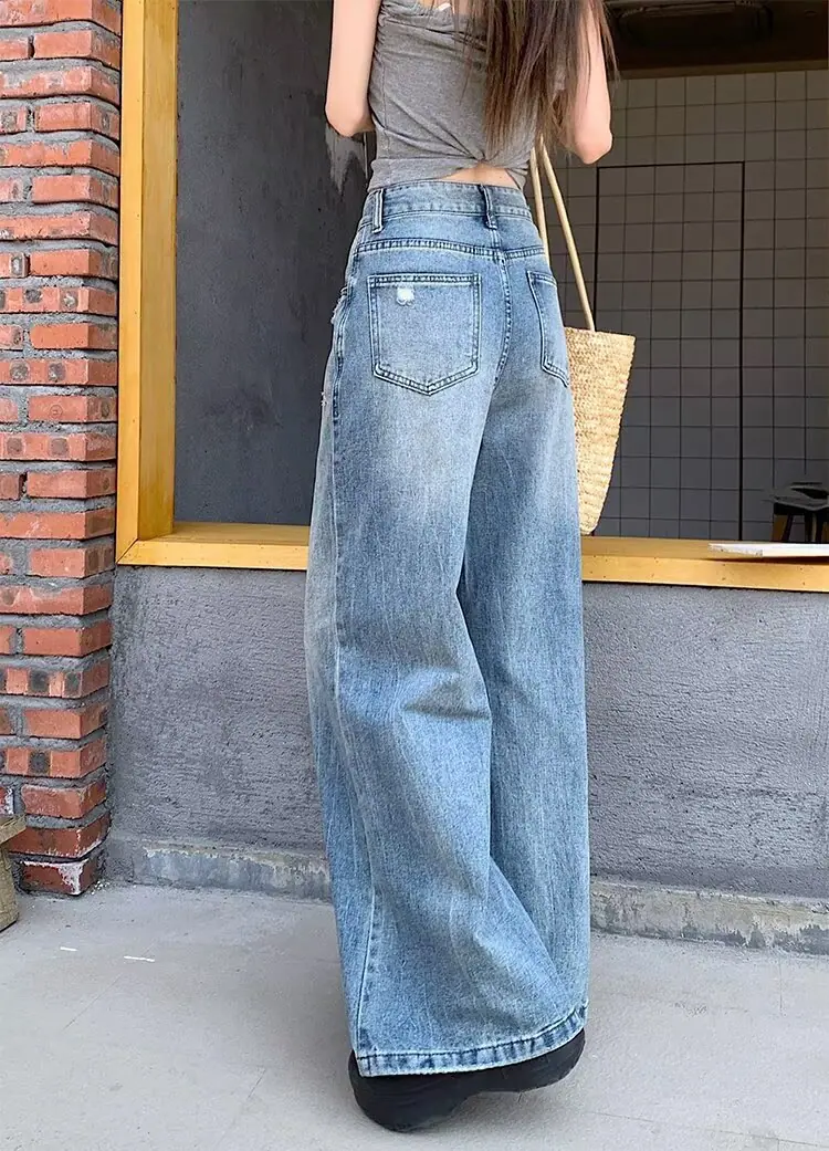 Pantalones vaqueros holgados de primavera para mujer 2023, nuevos pantalones de estilo coreano de cintura alta, versátiles, ajustados, de nueve puntos, rectos y rizados.
