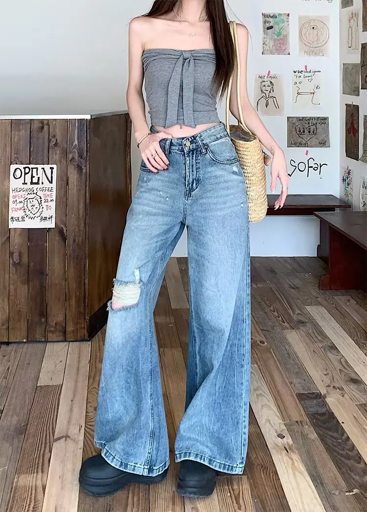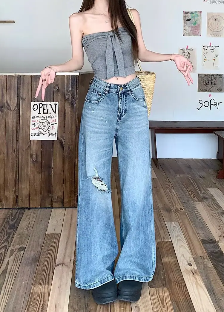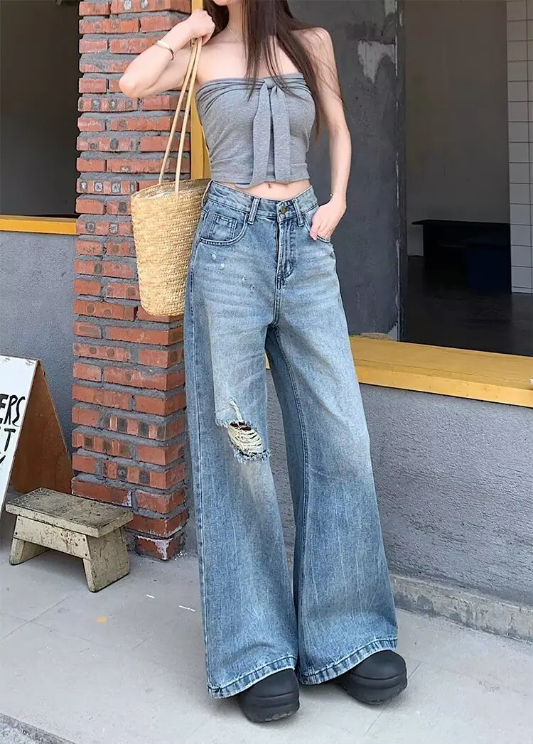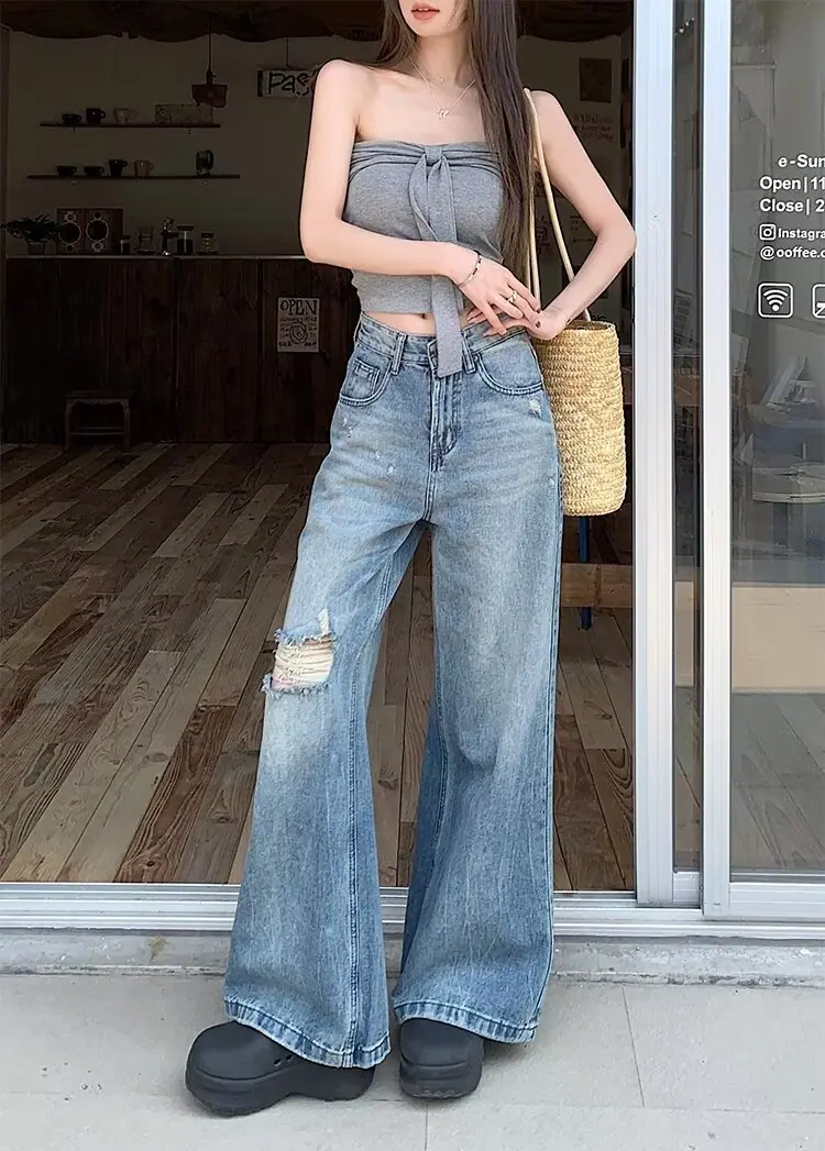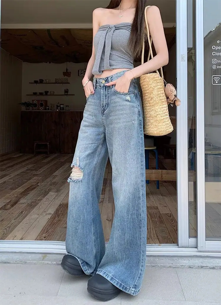 Pantalones vaqueros holgados de primavera para mujer 2023, nuevos pantalones de estilo coreano de cintura alta, versátiles, ajustados, de nueve puntos, rectos y rizados.