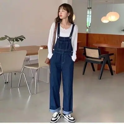 2025 Retro Juvenil Holgado Estilo Coreano Overol Jeans Estilo Universitario Uniforme de Clase para Estudiante Femenina ins Pantalones Holgados de Pierna Recta
