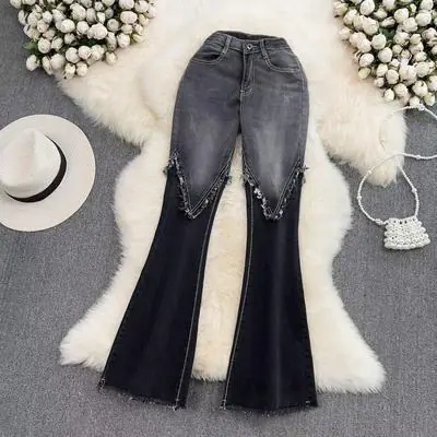 Pantalones vaqueros acampanados de temperamento moderno con colores cosidos para mujer, pantalones largos de corte tipo bota de cintura alta, ajustados y de alta elasticidad.