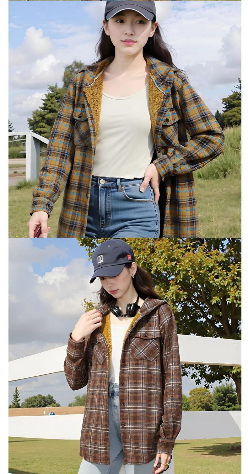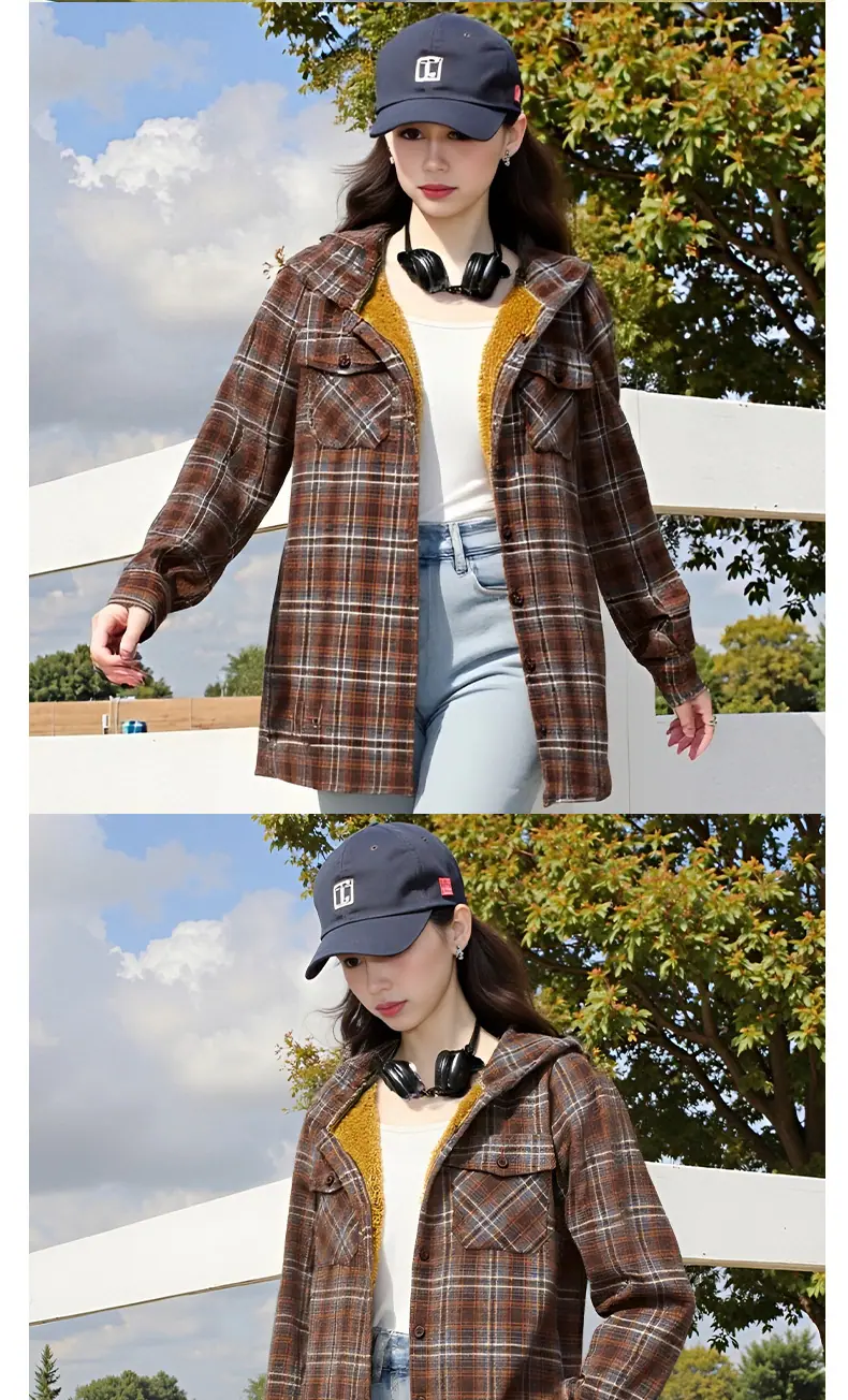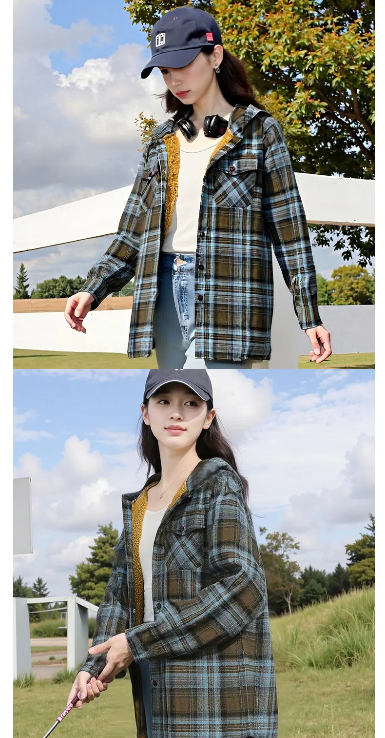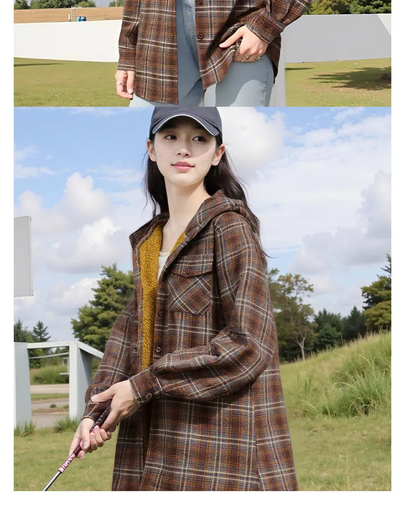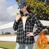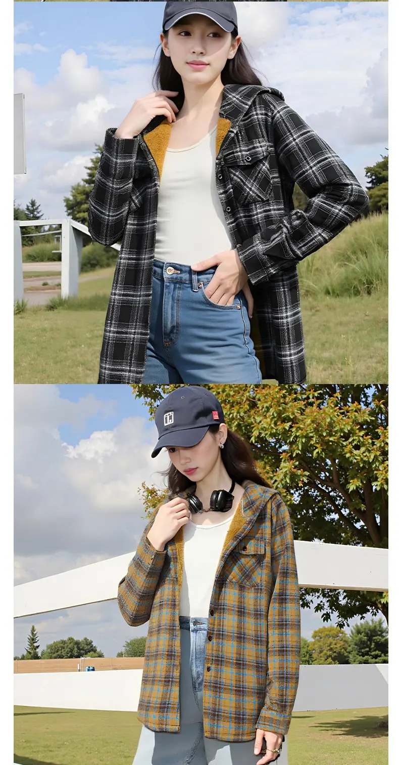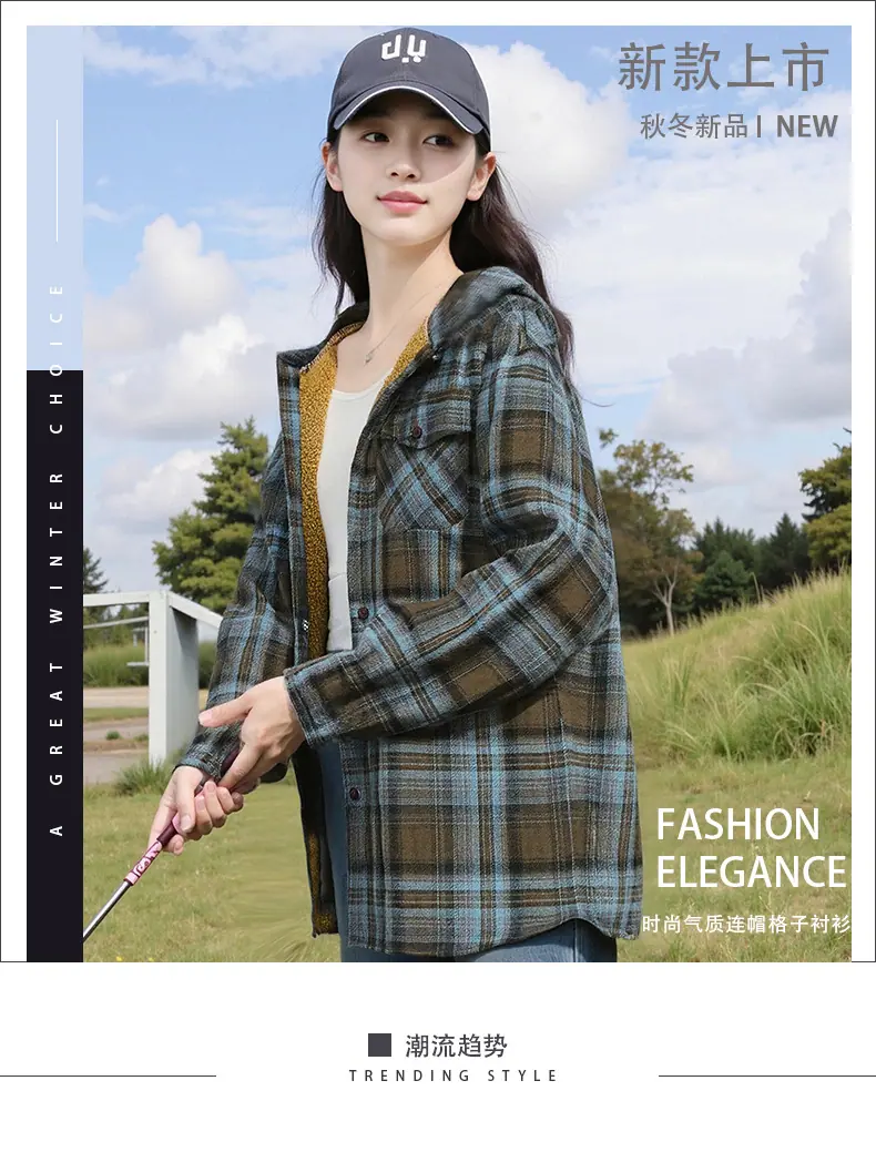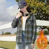 Camisa a cuadros japonesa retro con capucha nueva de otoño invierno, holgada, adelgazante, versátil, estilo casual, manga larga, chaqueta camisa para mujer