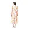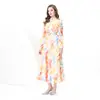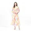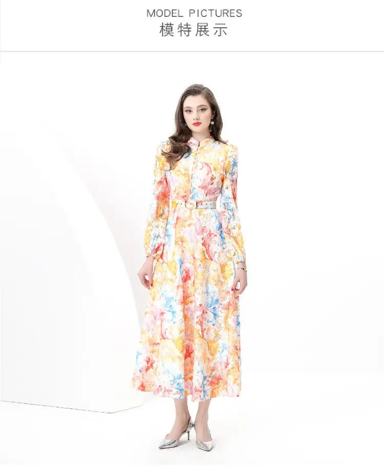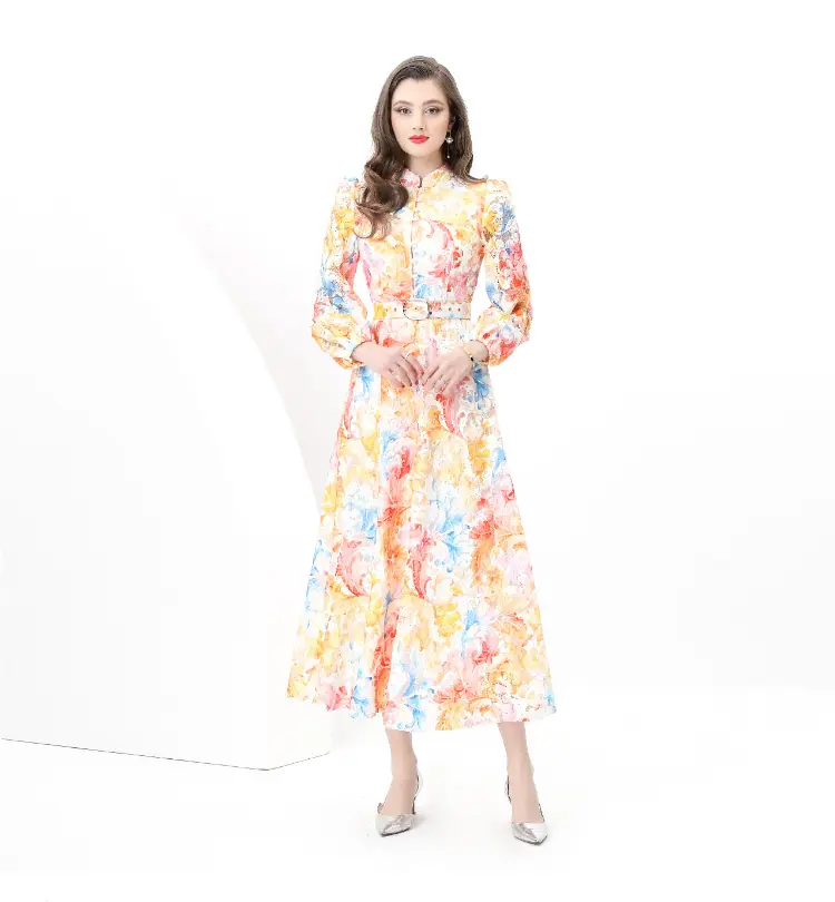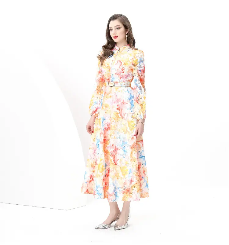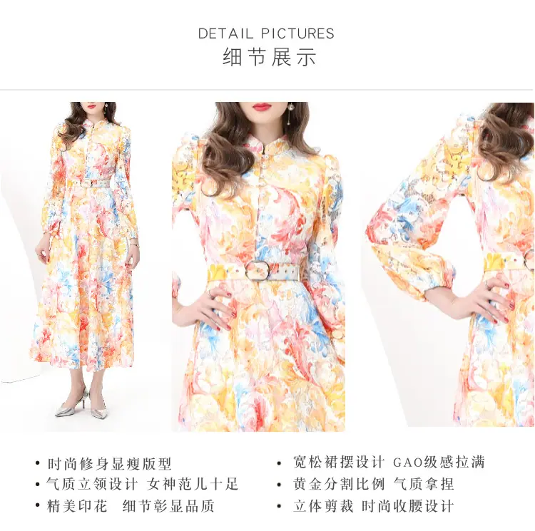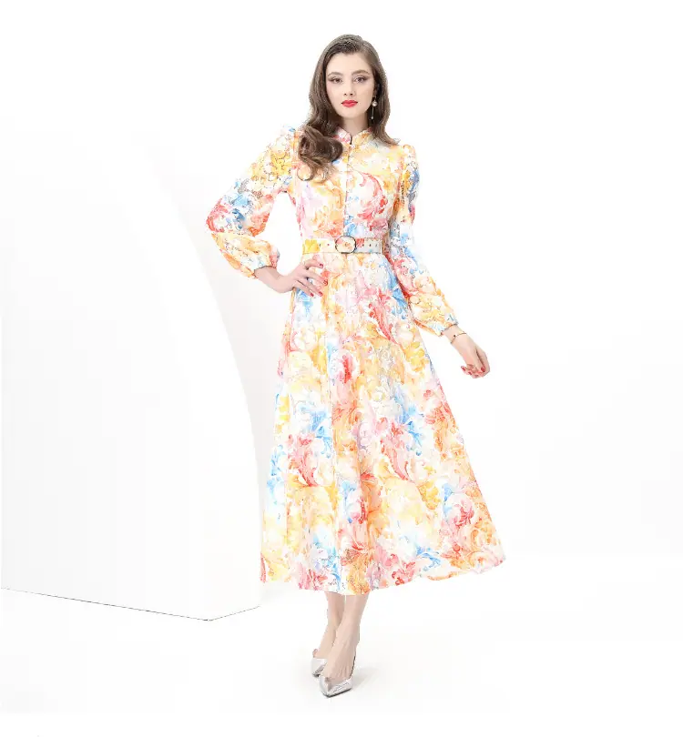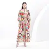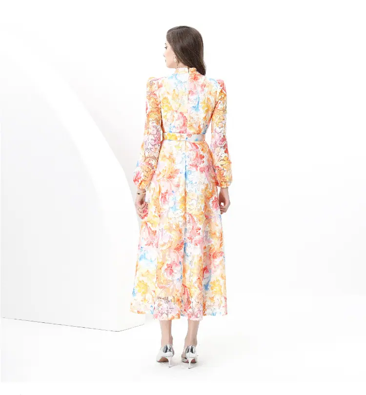 Vestido Largo Estampado Retro Encaje Cuello Alto Manga Larga Farol Cintura