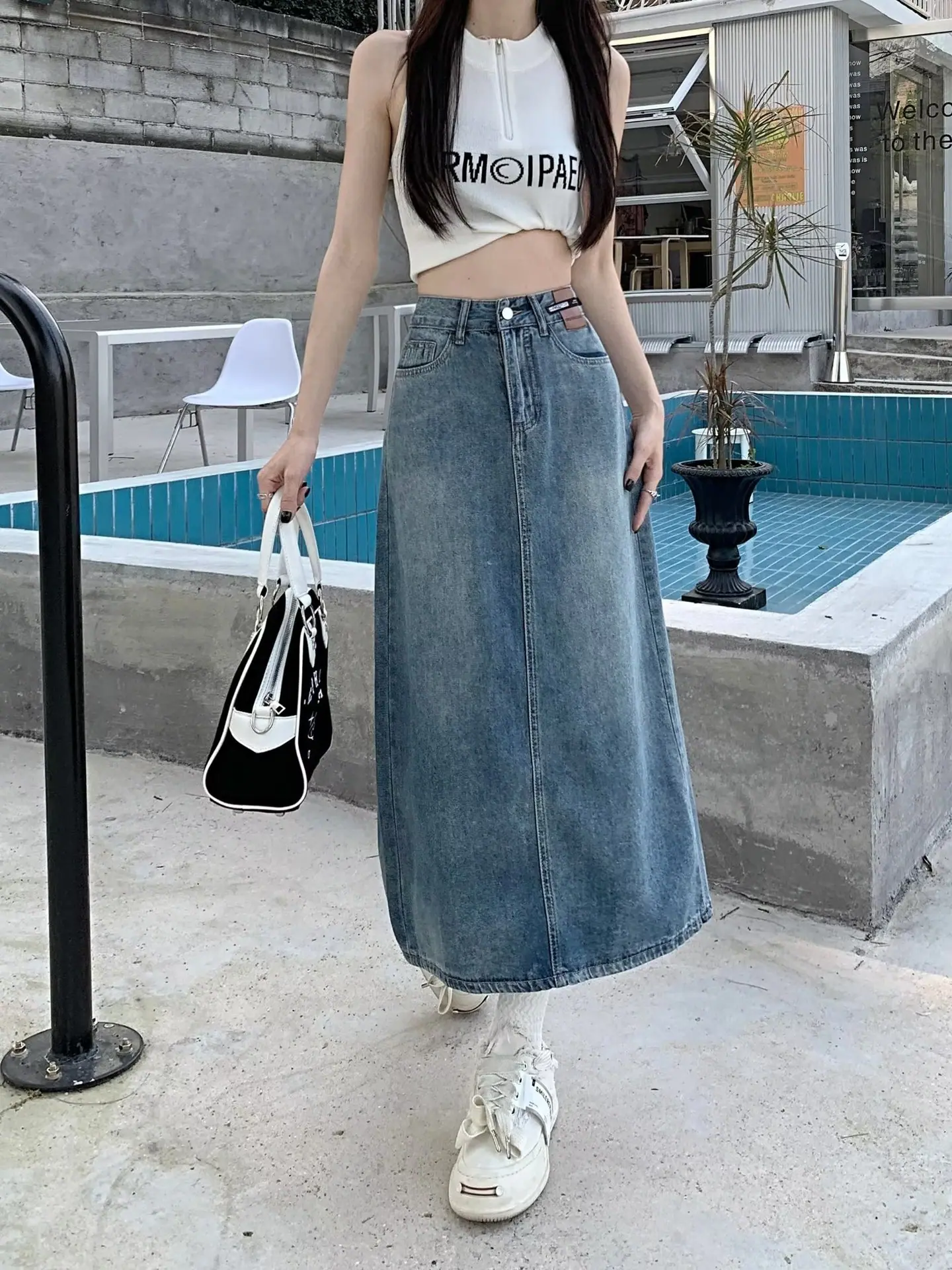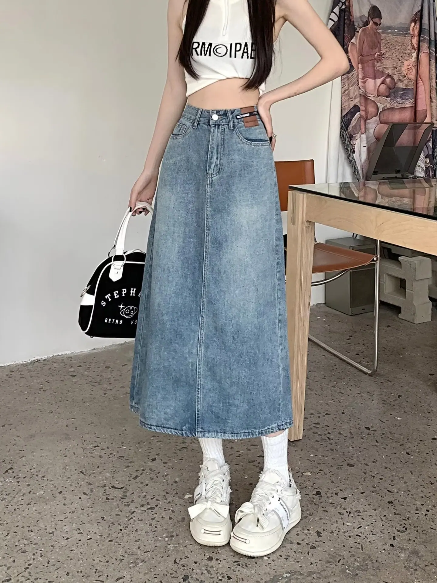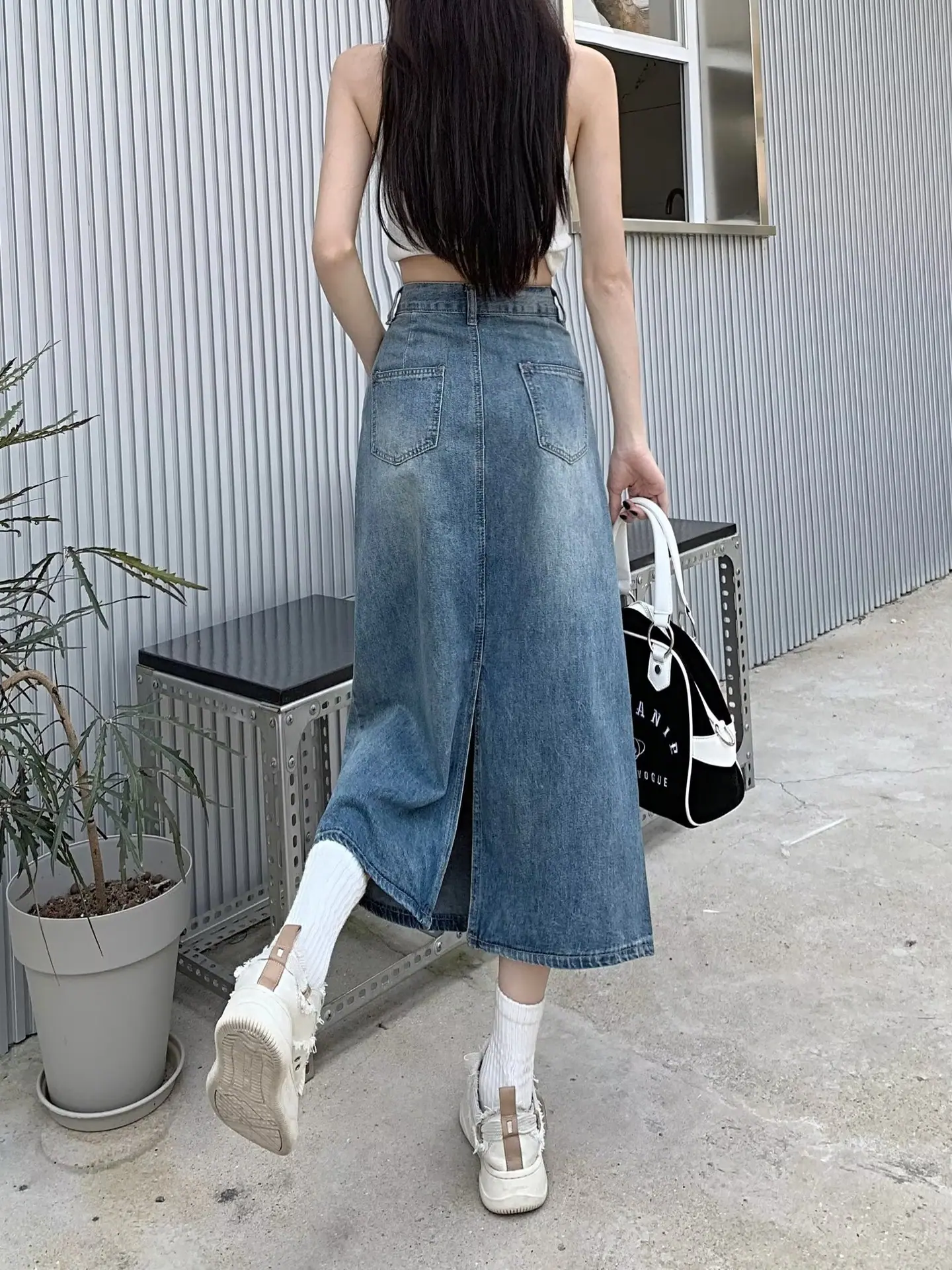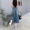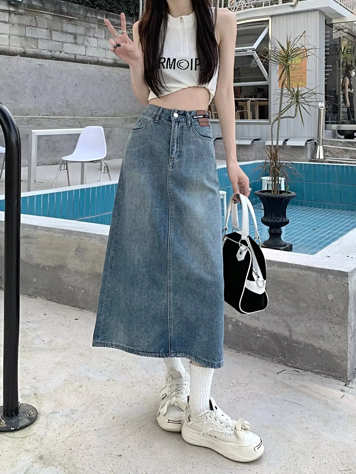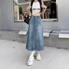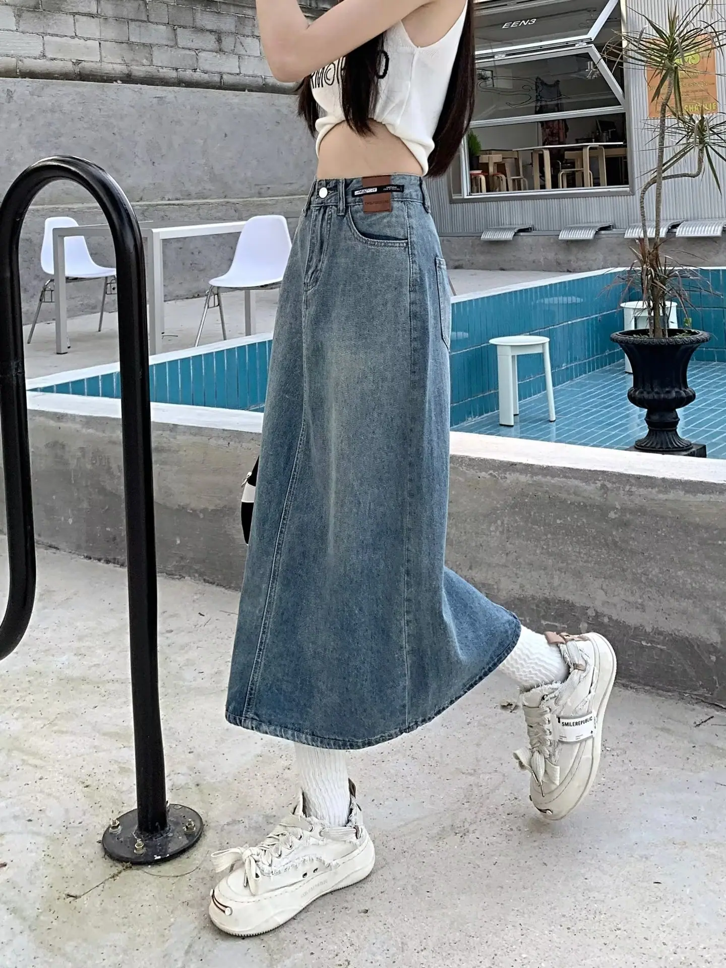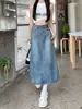 Falda Vaquera Retro con Abertura para Mujer Corte A 2023 Primavera Nueva Cintura Alta Slim Media Longitud Falda Larga Verano